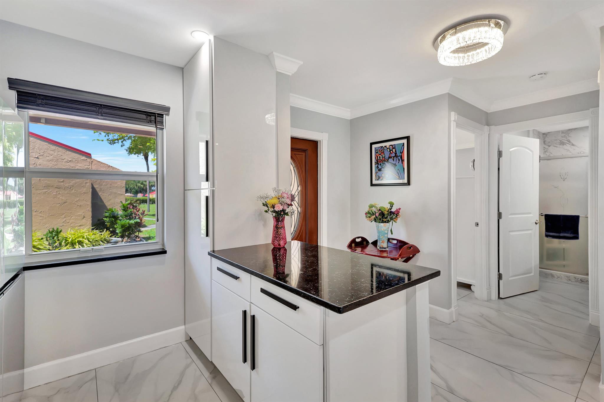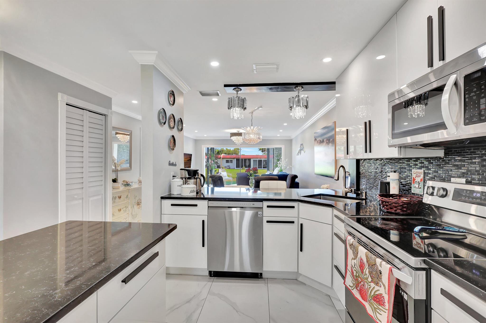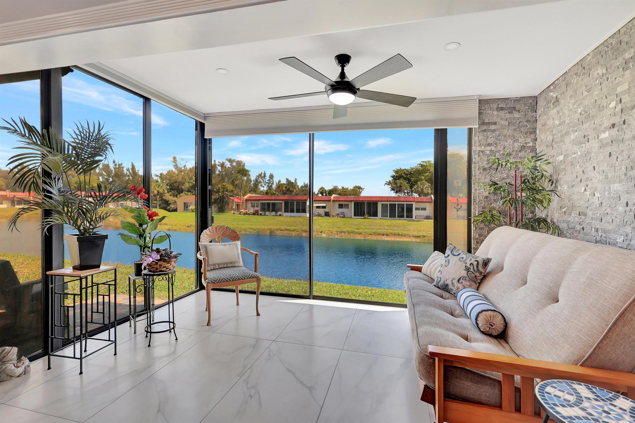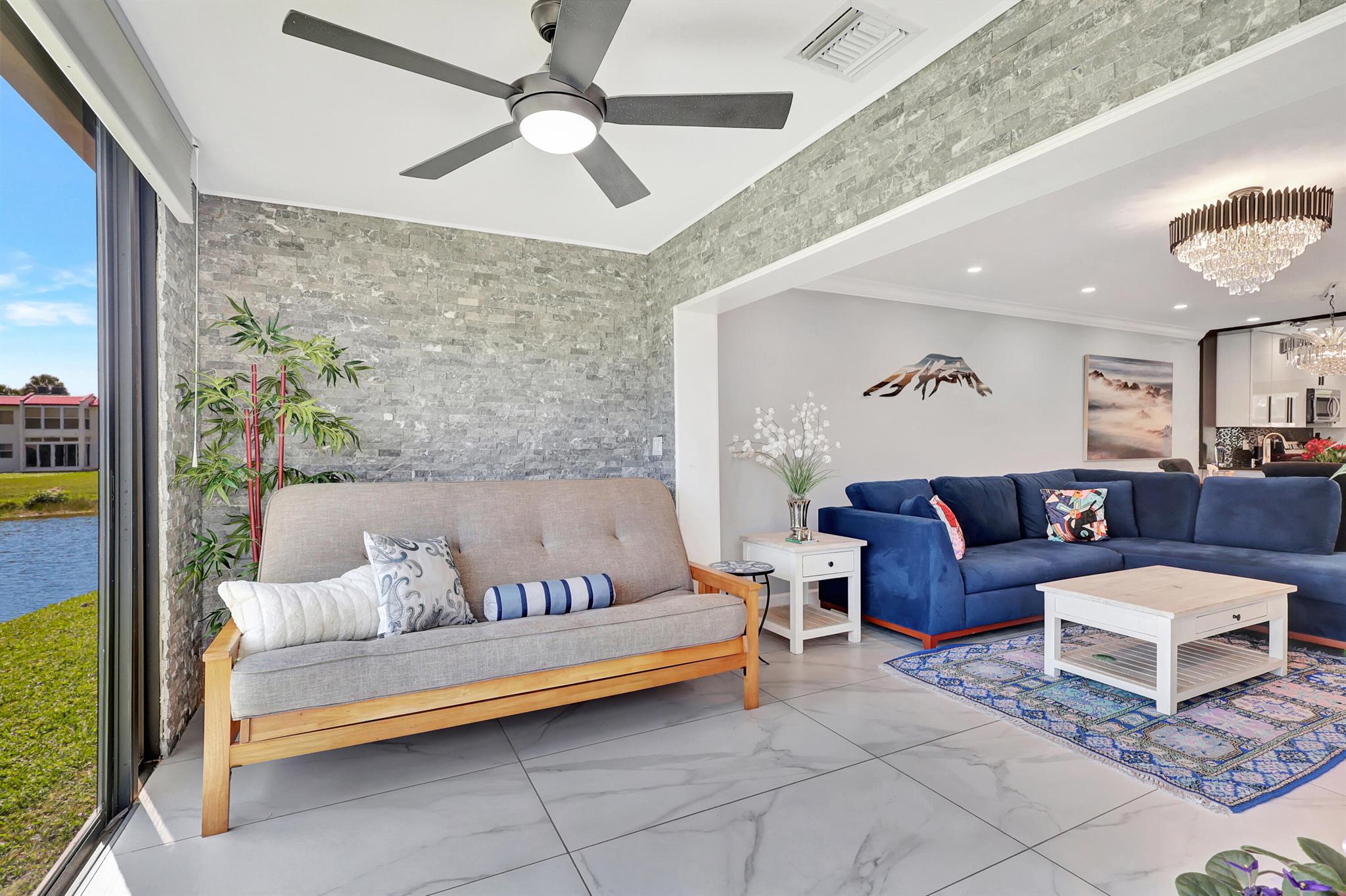 MOTIVATED SELLER! This stunning villa offers breathtaking lakeside views. Featuring: 2 Bedrooms/2 Baths, new impressive open-concept kitchen w/SS appliances, granite counters, cabinets to the ceiling, & pantry w/sliding drawers. Both bathrooms fully remodeled; guest bath with walk-in shower and master bath with shower & jet tub as well as walk-in closet. Hurricane impact windows in bedrooms, kitchen and & front door, large white marble look tile throughout, LED lights, crown molding throughout, California closet in Master suite, 2019 AC w/new condenser, New water heater 9/2024, updated electrical panel, Hunter Douglas window treatments in FL room, and new front landscaping. This is a very active adult community offering many amenities. Full details under Document
