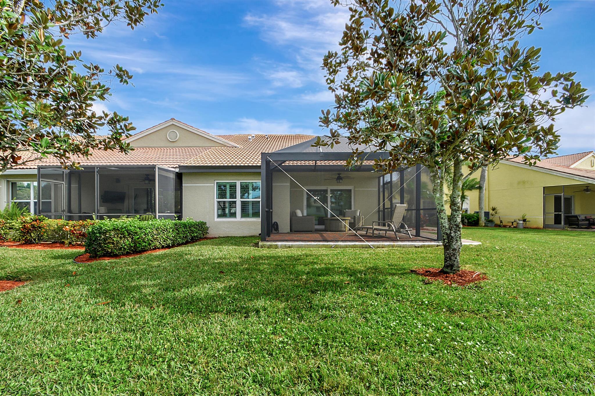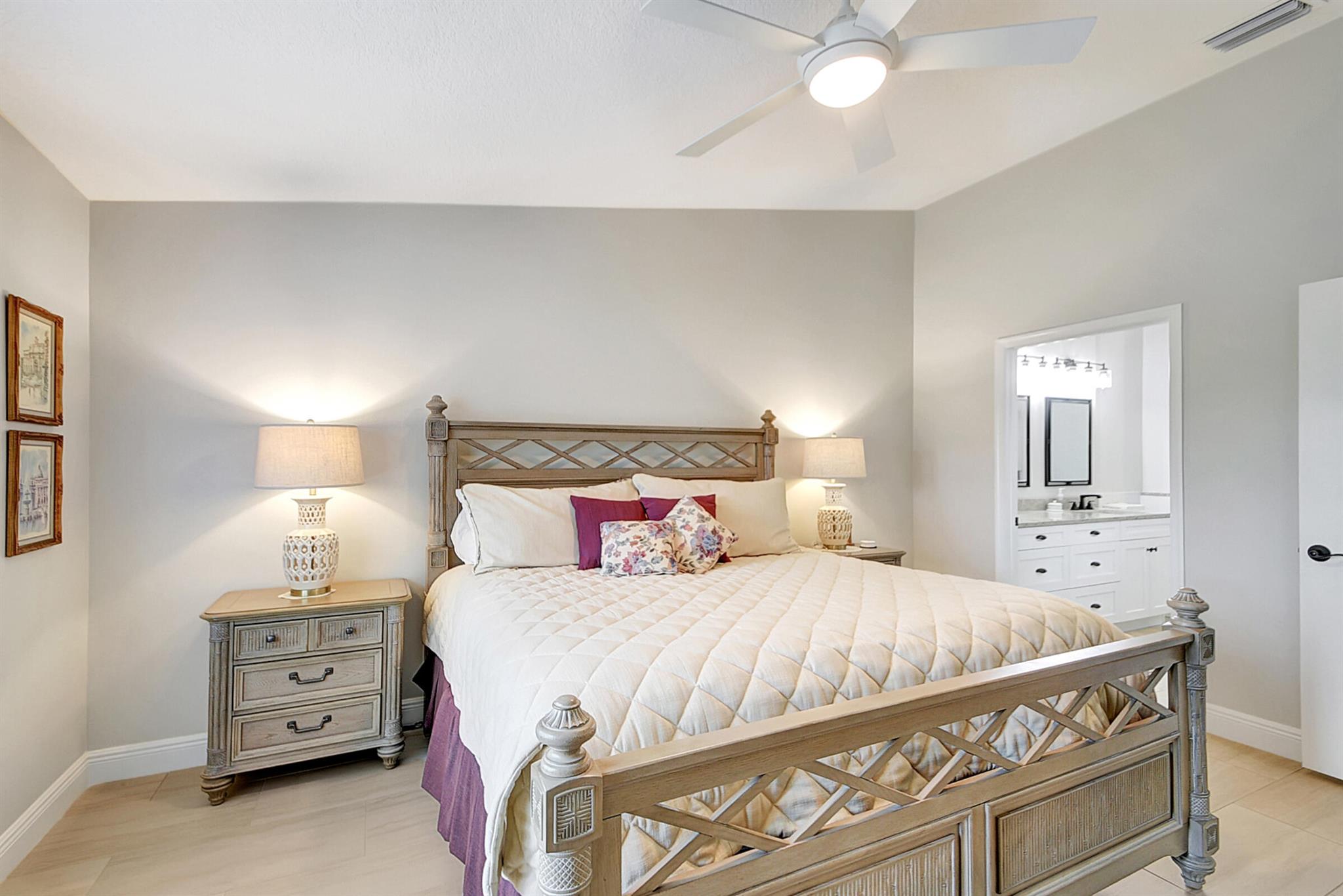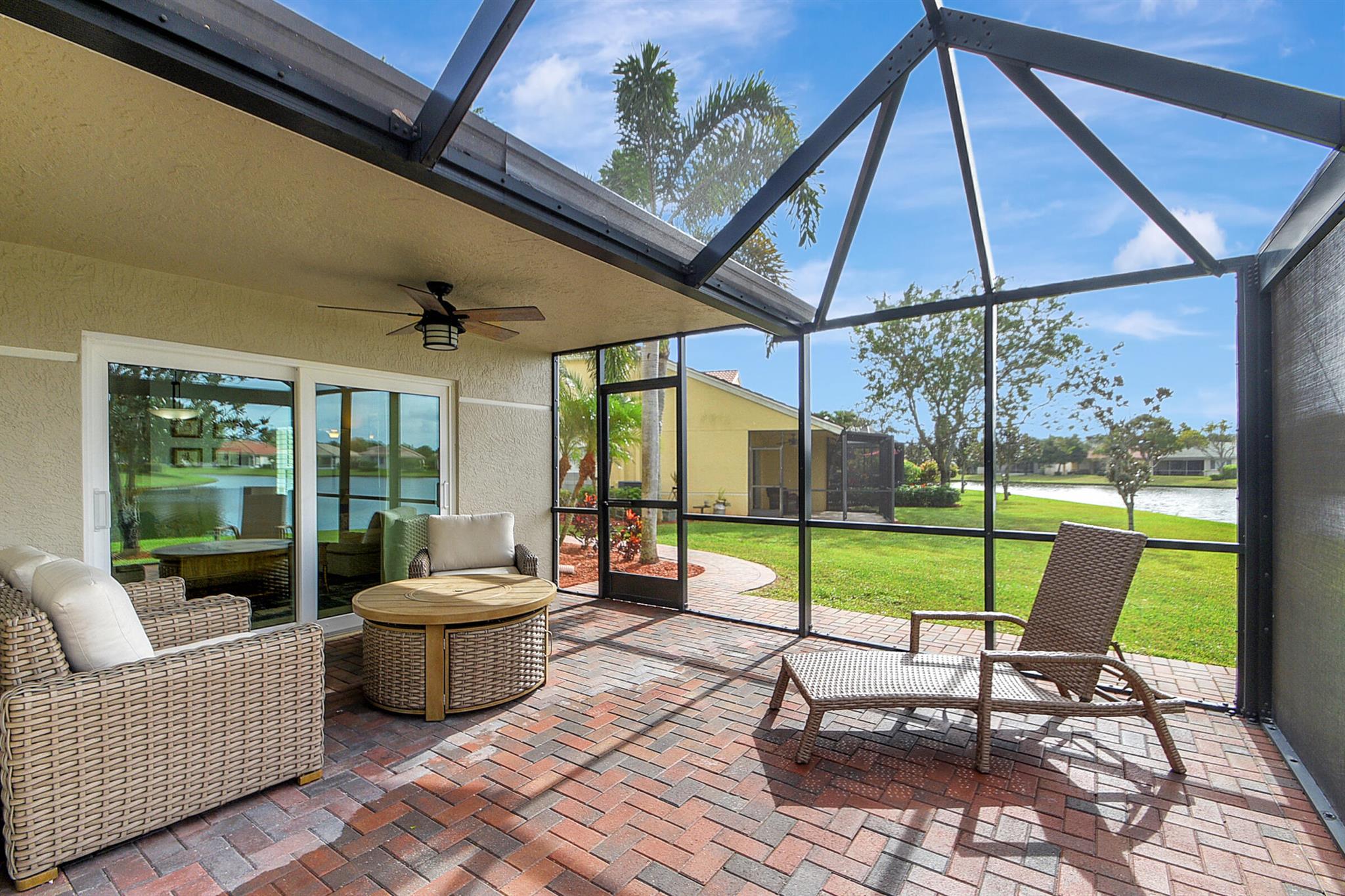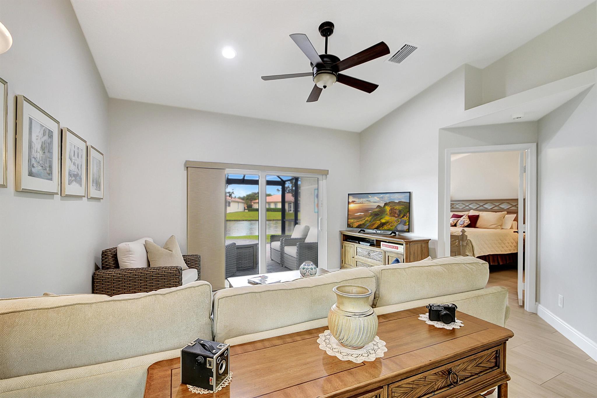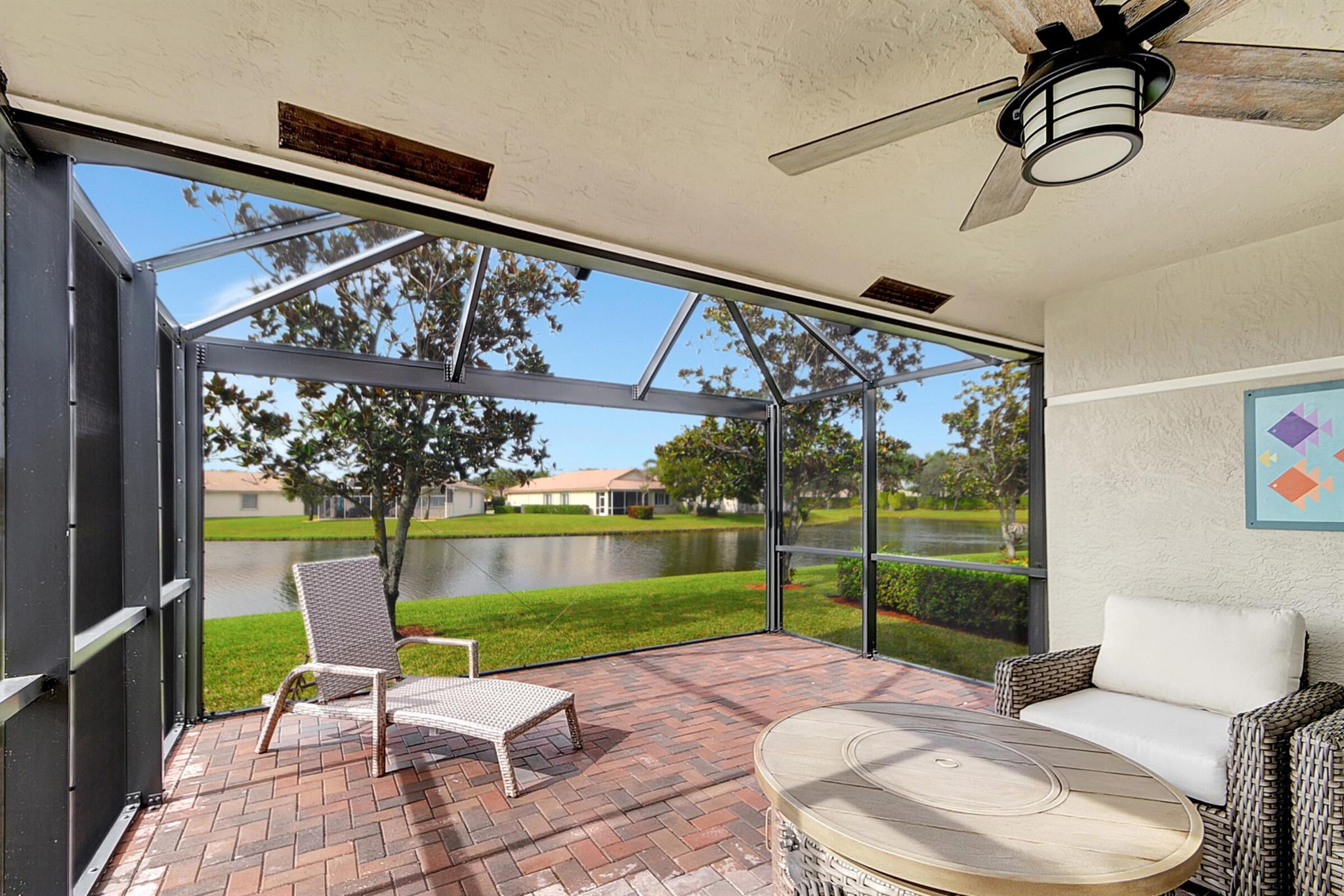 ABSOLUTELY AMAZING CORNER UNIT WITH BEAUTIFUL LAKE VIEWS EVERY INCH OF THIS UNIT HAS BEEN UPDATED INCLUDING A BRAND NEW ROOF, NEW A/C, NEW KITCHEN REMODEL WITH CAMBRIA COUNTERTOPS. BOTH BATHROOMS FULL REMODEL ALSO WITH CAMBRIA COUNTER TOPS. .NEW IMPACT WINDOWS EXTENDED SCREENED IN PATIO COMPLETED LAST YEAR. PLANTATION SHUTTERS RECENTLY INSTALLED. NEW CERAMIC TILE INSTALLED THROUGHOUT THE FULL UNIT. THE SECOND BEDROOM HAS A BRAND NEW MURPHY QUEEN BED HIDDEN BY ROLLING BOOKCASES. CUSTOM OUTDOOR LIGHTING PLUS A SIDE PAVED PATH TO THE BACKYARD FROM FRONT DOOR. ALL CLOSETS HAVE CUSTOM BUILT INS. LAUNDRY IN KITCHEN MAIN ALSO INCLUDES ADT HOME PHONE AND HIGH SPEED INTERNET PROGRAMABLE TEMP CONTROL.