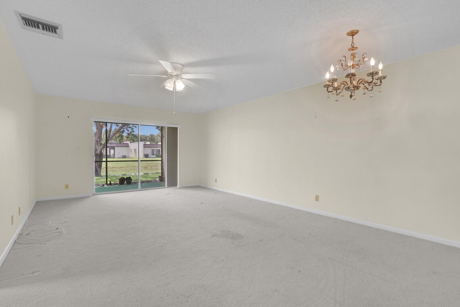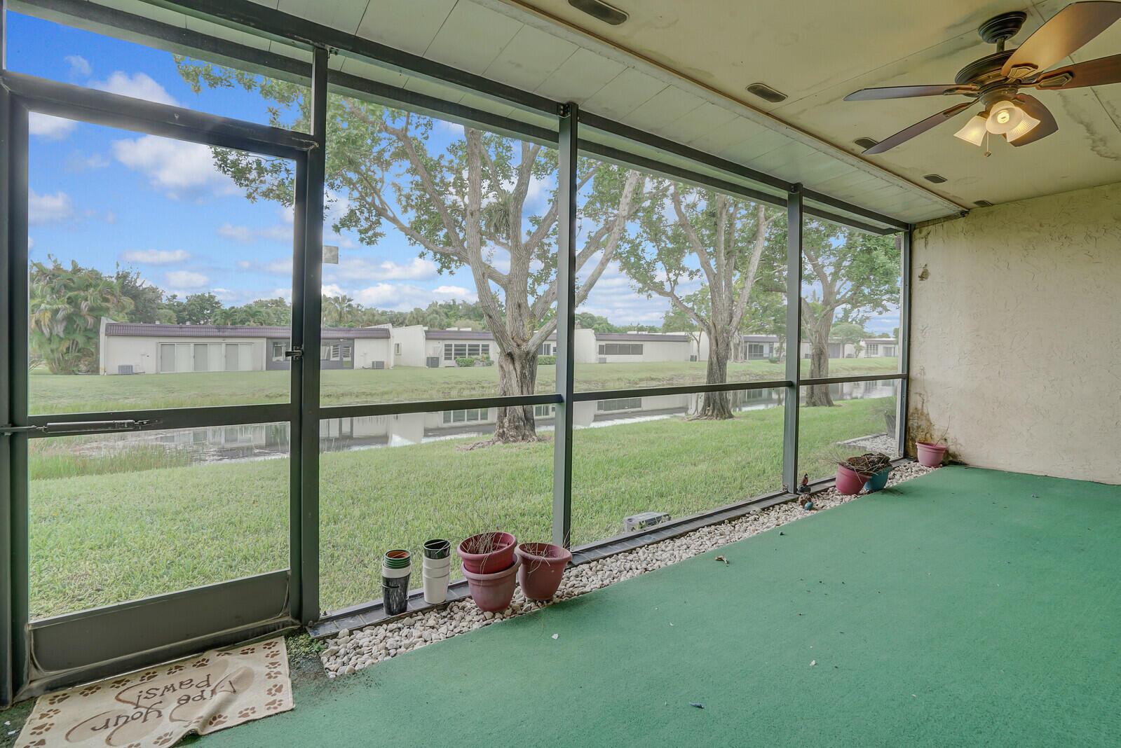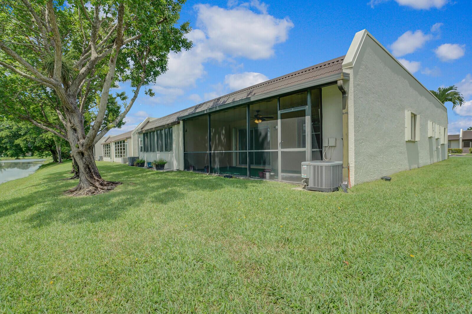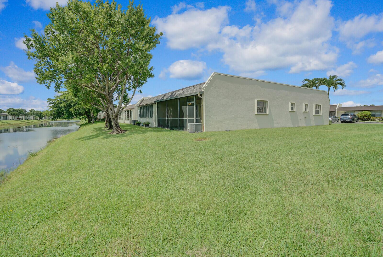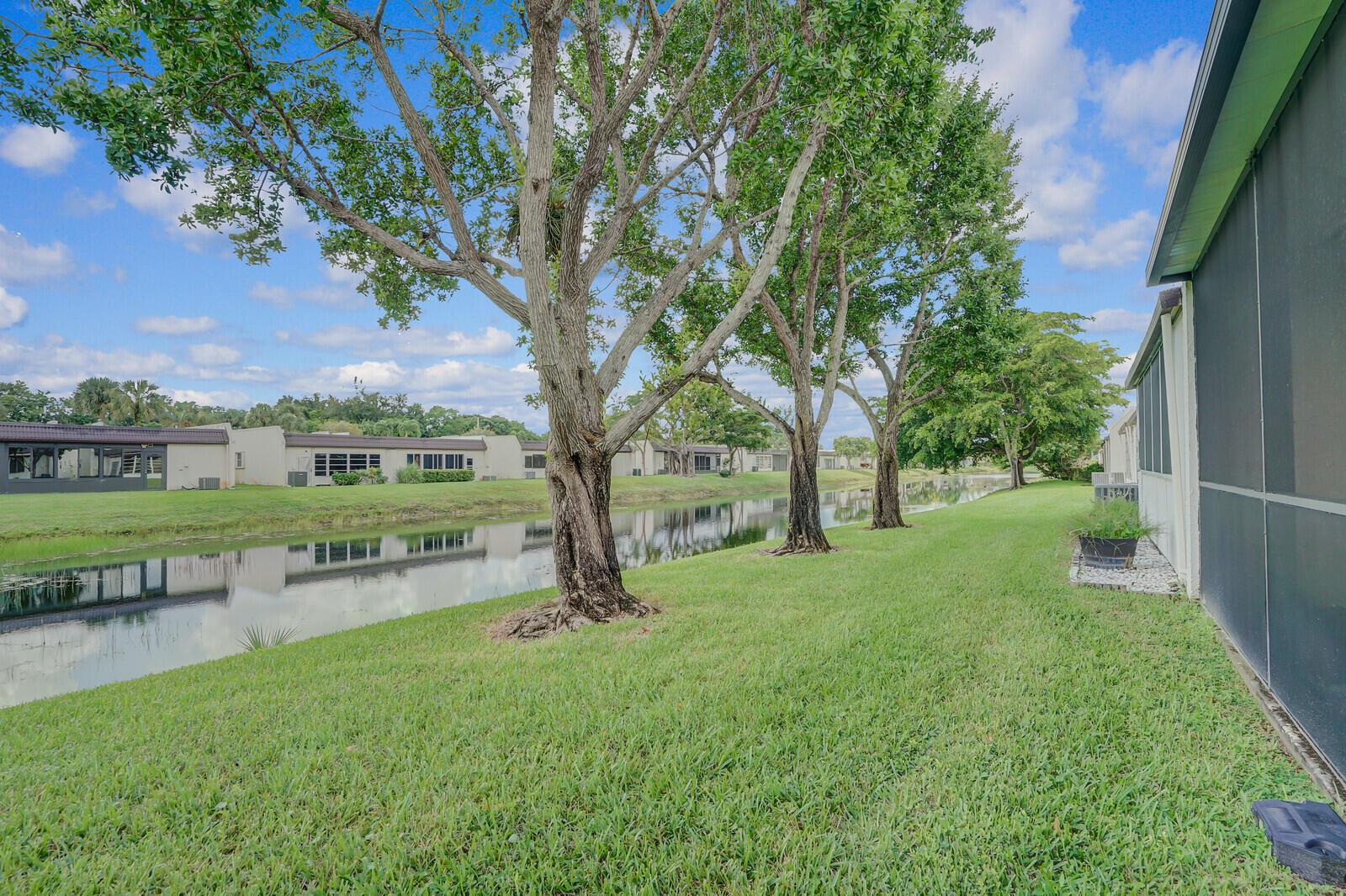 Spacious 2/2 villa with beautiful lake-front views in the desirable 55+ community of Golden Lakes Village. Must sought after corner unit. Come put your finishing touches on this unit and make it your own! Accordion shutters on all windows. Amenities are fantastic which include 24/7 gated security, Olympic size pool, hot tub, tennis, pickleball, shuffleboard, cafe, billiards room, bocce, business center, meeting room, card/game room, library, gym, grand clubhouse with auditorium/stage and social director scheduling shows and social events. There is even an additional pool on Lake Rebecca Dr. Great location close to shopping, turnpike, restaurants and airport. HOA includes water, cable, internet. 1 pet allowed.