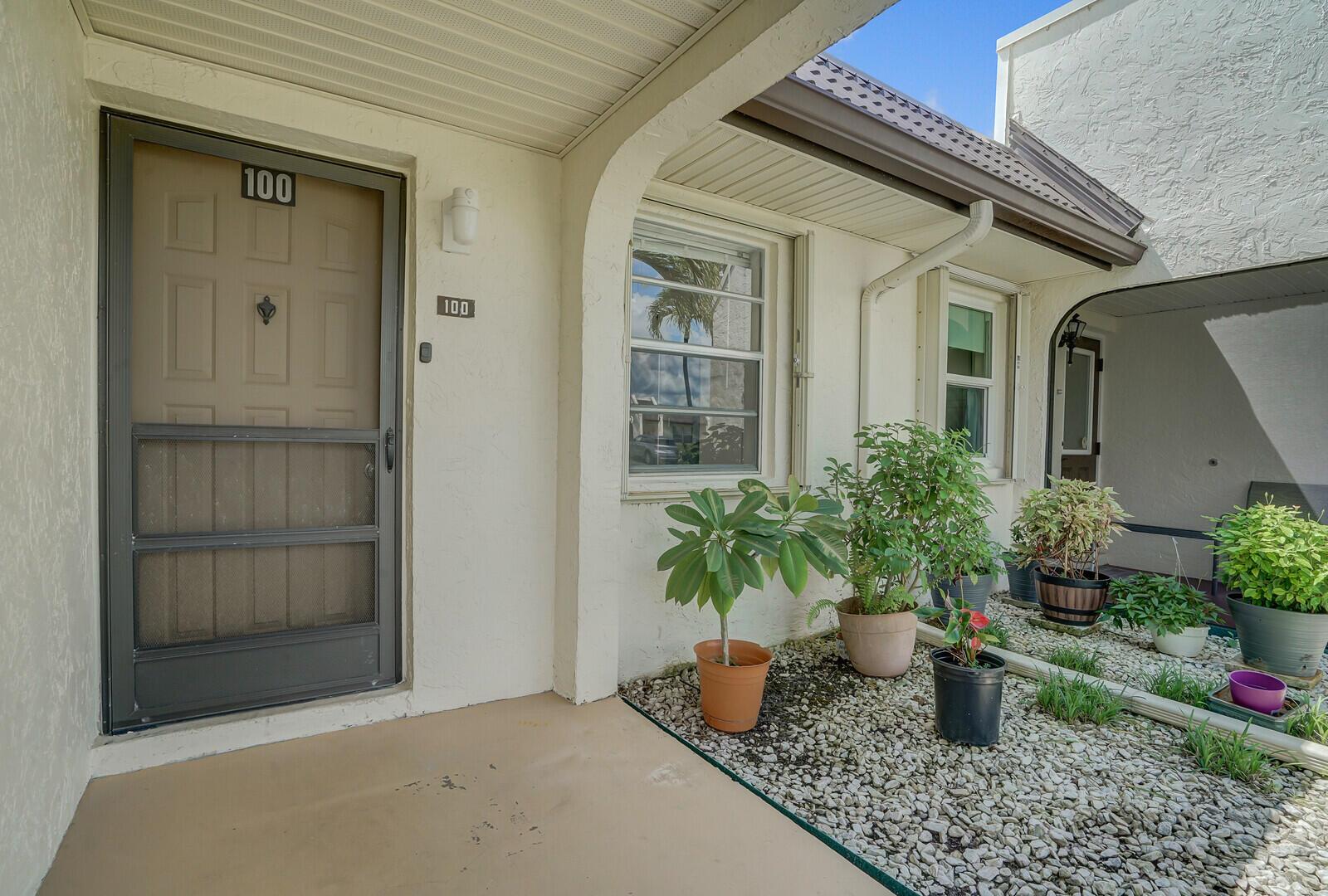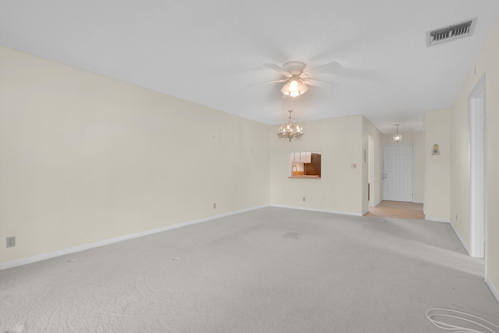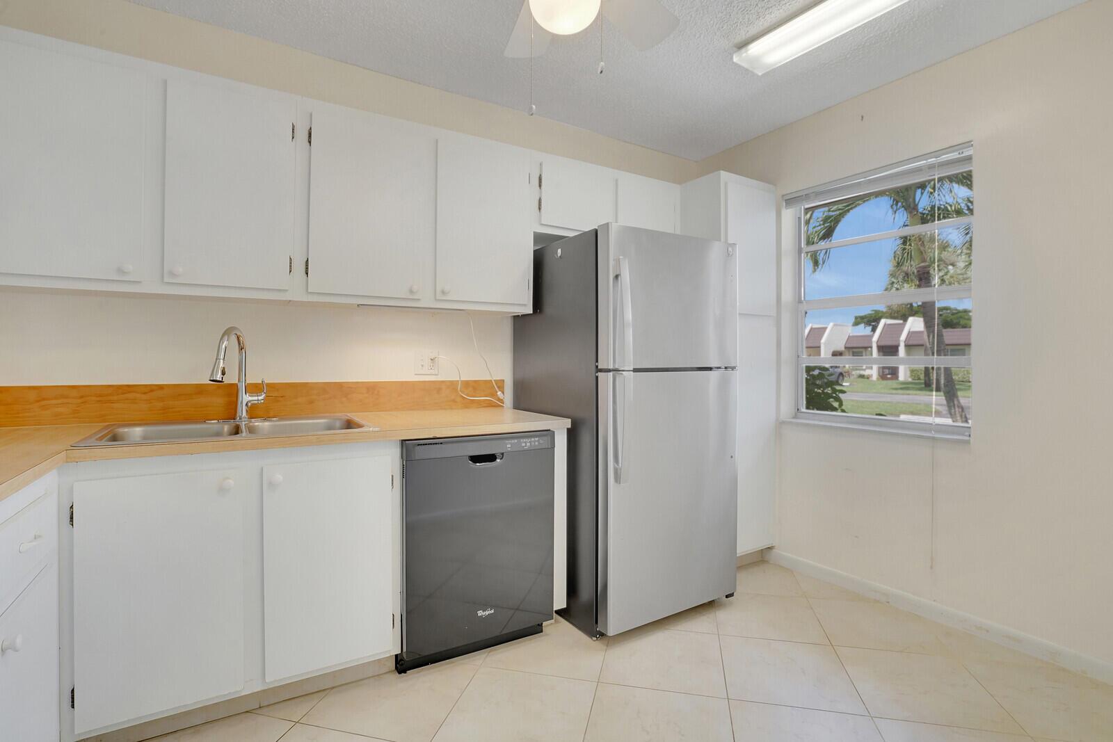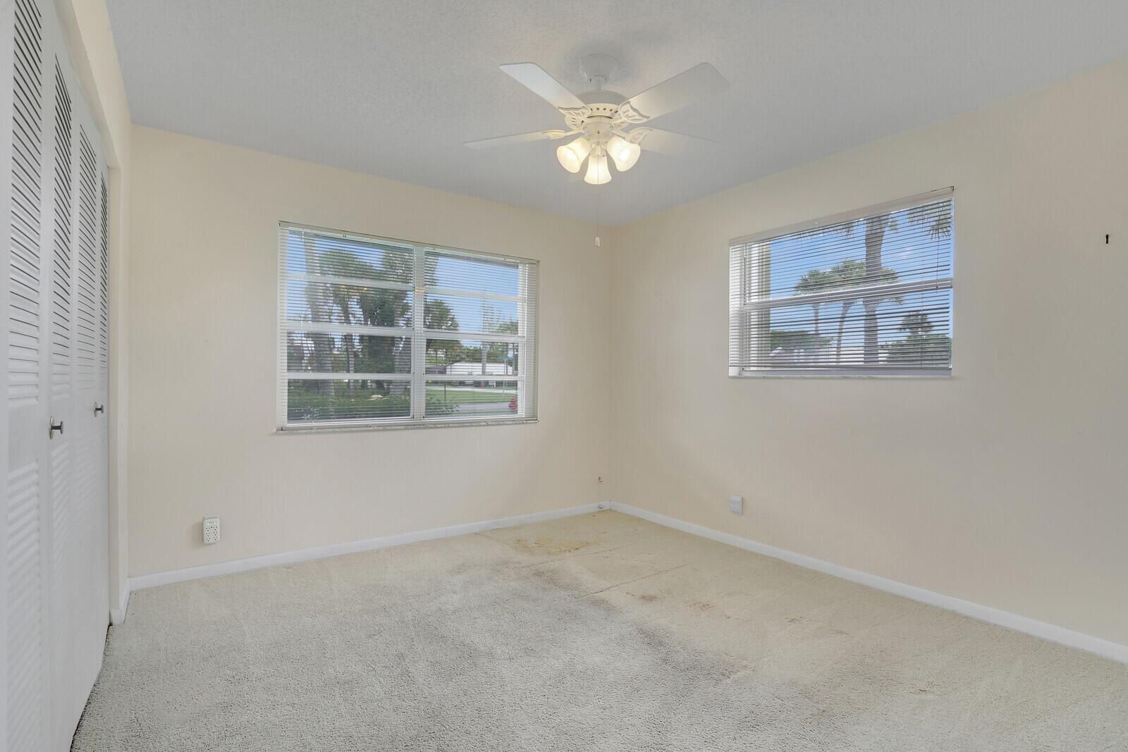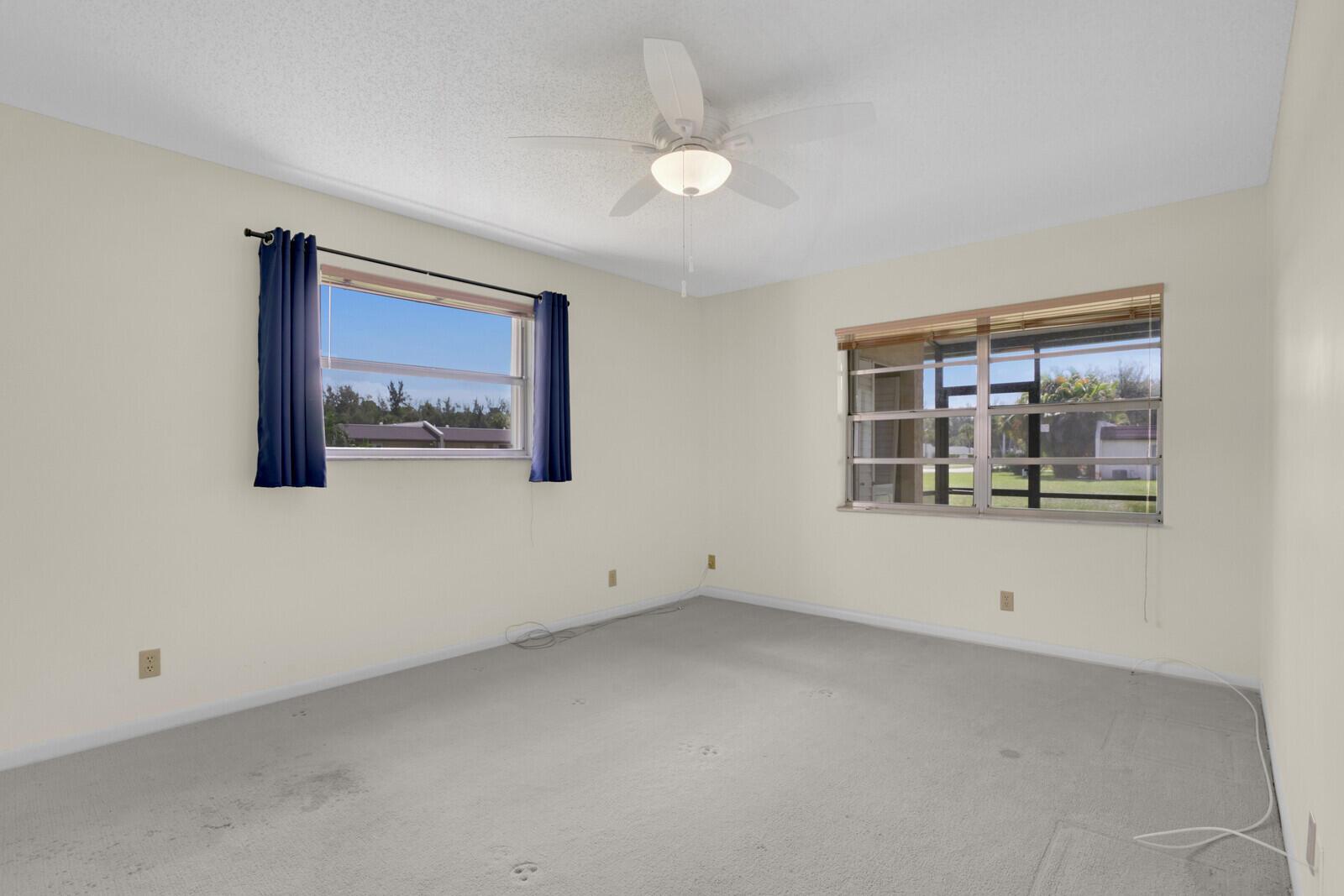 Spacious 2/2 villa with beautiful lake-front views in the desirable 55+ community of Golden Lakes Village. Must sought after corner unit. Come put your finishing touches on this unit and make it your own! Accordion shutters on all windows. Amenities are fantastic which include 24/7 gated security, Olympic size pool, hot tub, tennis, pickleball, shuffleboard, cafe, billiards room, bocce, business center, meeting room, card/game room, library, gym, grand clubhouse with auditorium/stage and social director scheduling shows and social events. There is even an additional pool on Lake Rebecca Dr. Great location close to shopping, turnpike, restaurants and airport. HOA includes water, cable, internet. 1 pet allowed.