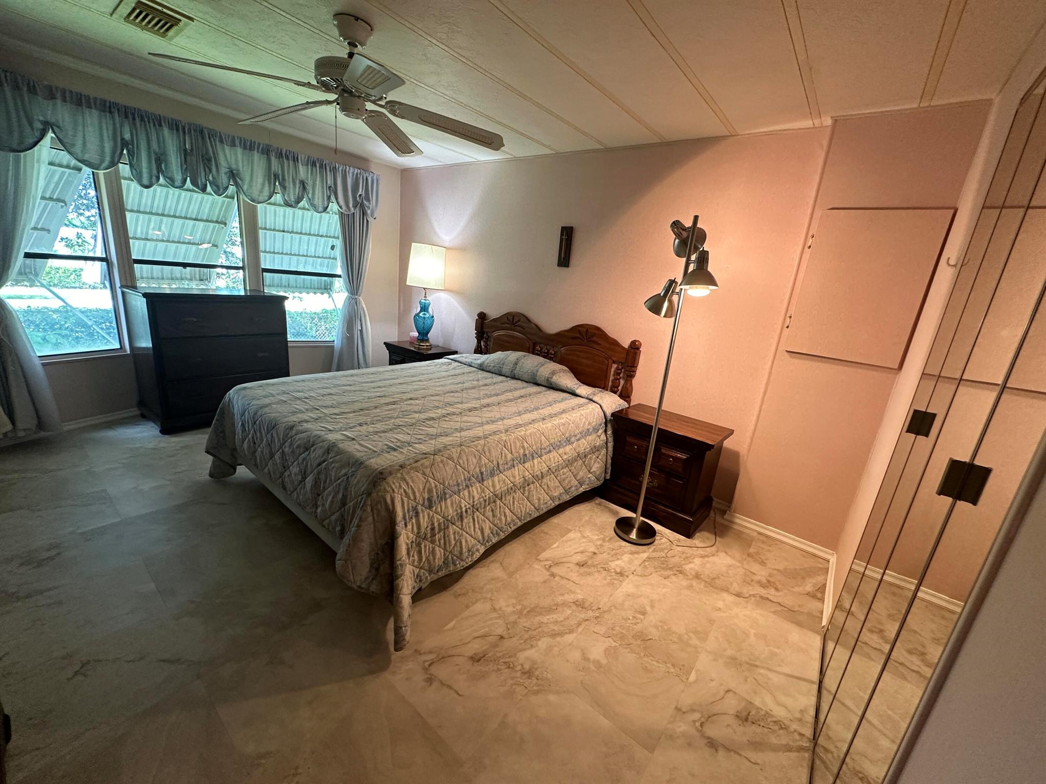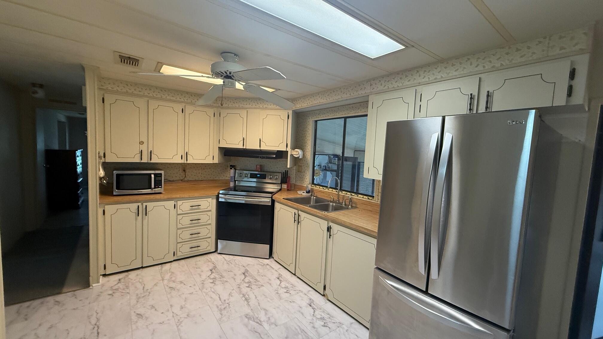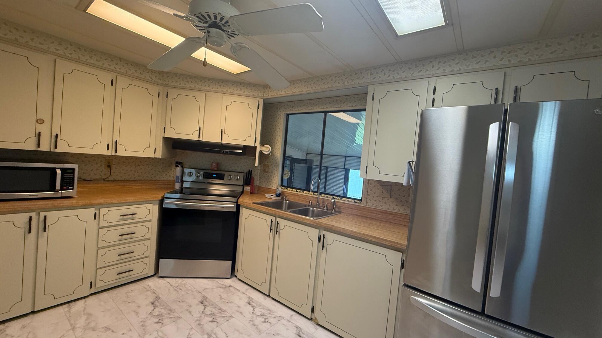 Lovely 2 Bedrm/2 Bath Manuf home in Cambridge 55+ community in Hobe Sound. REAL WOODBURNING FIREPLACE for occasional chilly nights. 1254 SF under A/C w 2 ADDITIONAL SCREEN ROOMS for your pleasure w roll down shutters! 2023 New Flooring in Kitchen, dining room & Primary Bedrm & bath. The Living Room is very large (13X23) w the formal Dining Room adjacent. The Kitchen is also large with newer Stainless appliances. The Primary Bedroom is large w so much storage. Primary bathroom has dual sinks, make up vanity, walk in closet & 2 additional closets & step in shower. The 2nd Bedrm is a good side w a walk in closet & full bath on the hall. The Front Lanai faces east for the morning sun & those famous Hobe Sound Breezes. YOU OWN THE LAND - ALL PETS WELCOME. 2017 3 TON A/C - 2005 AMS Aluminum Ro