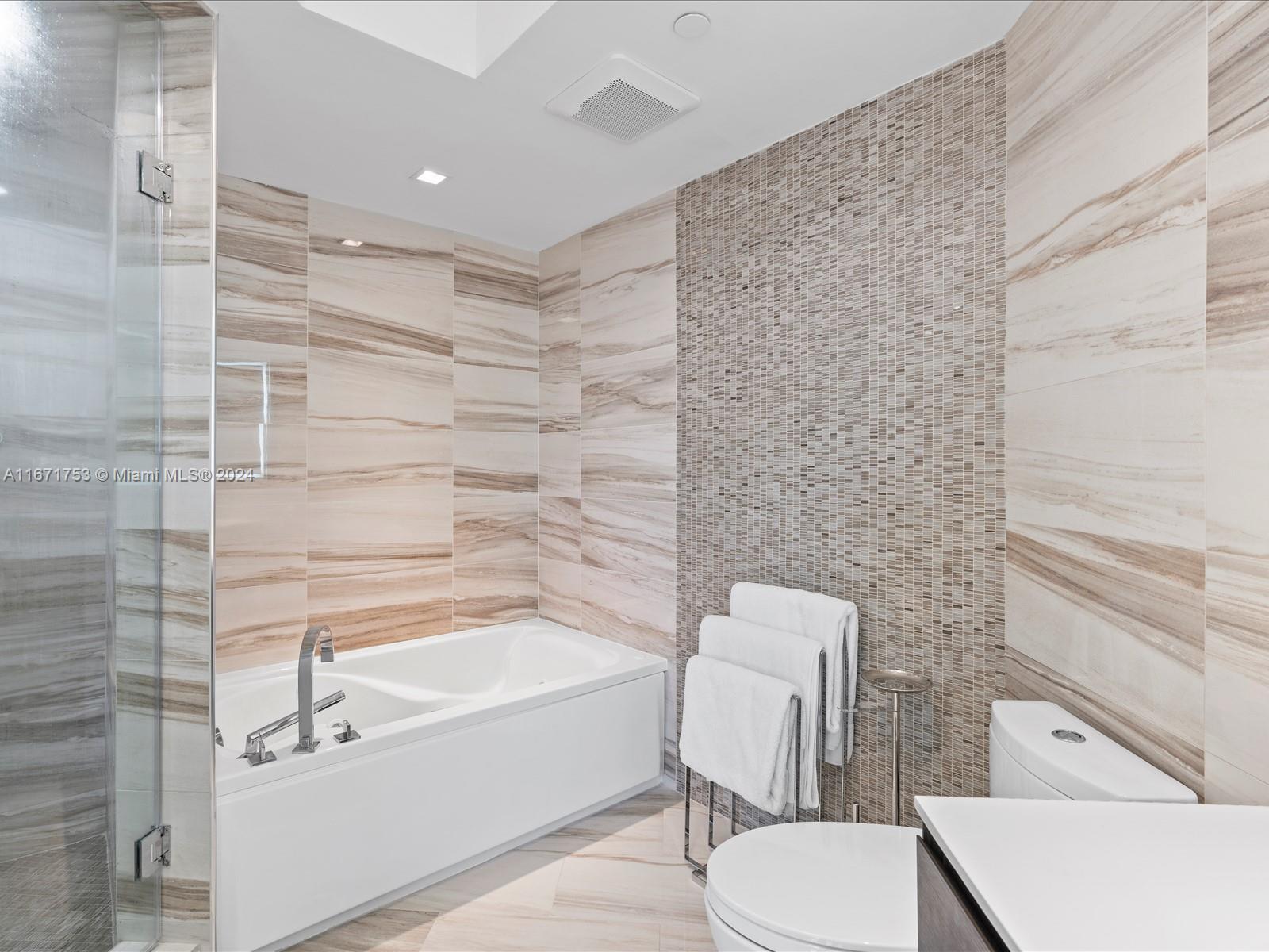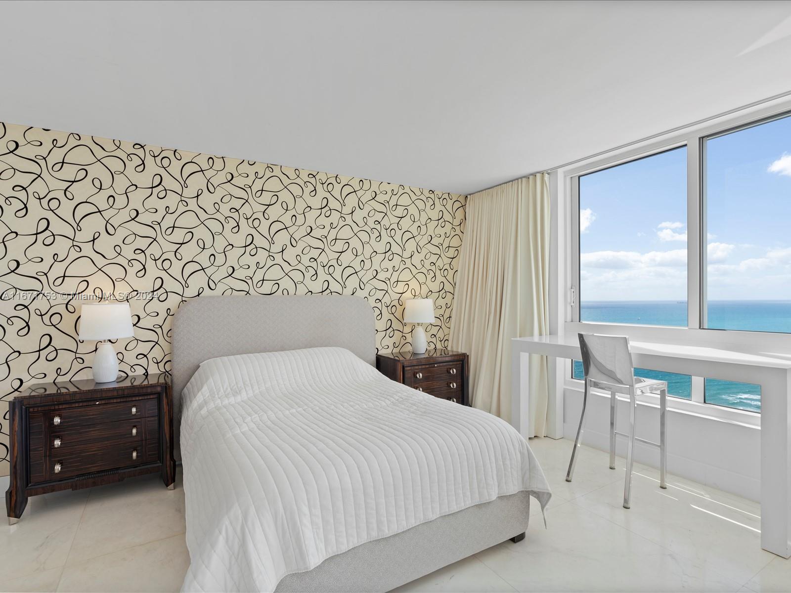 Magnificent views of the ocean, intracoastal and Downtown Miami. Astonishing sunrises, amazing sunsets! Endless views as far as the eye can see characterize this exclusive oceanfront unit. Featuring white marble floors throughout, high end furnishings and a gorgeous private wrap around balcony with glass railings, floor to ceiling windows and sliding glass doors. The luxurious primary suite, highlighting the tastefully just renovated bathroom, is separated from the living area by a solid glass wall. There are exquisite white silk curtains which, when closed, provides ultimate privacy. When open, beautiful panoramic views of the Atlantic Ocean and intracoastal can be enjoyed upon waking or while relaxing in bed.