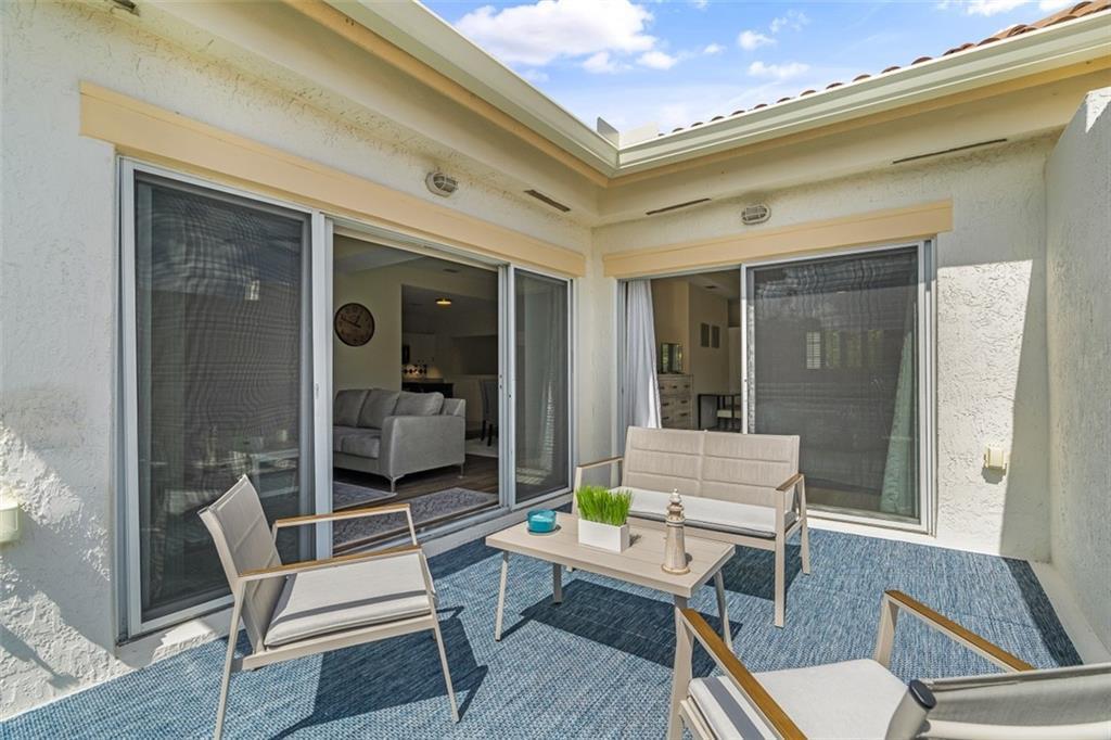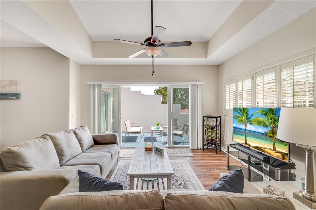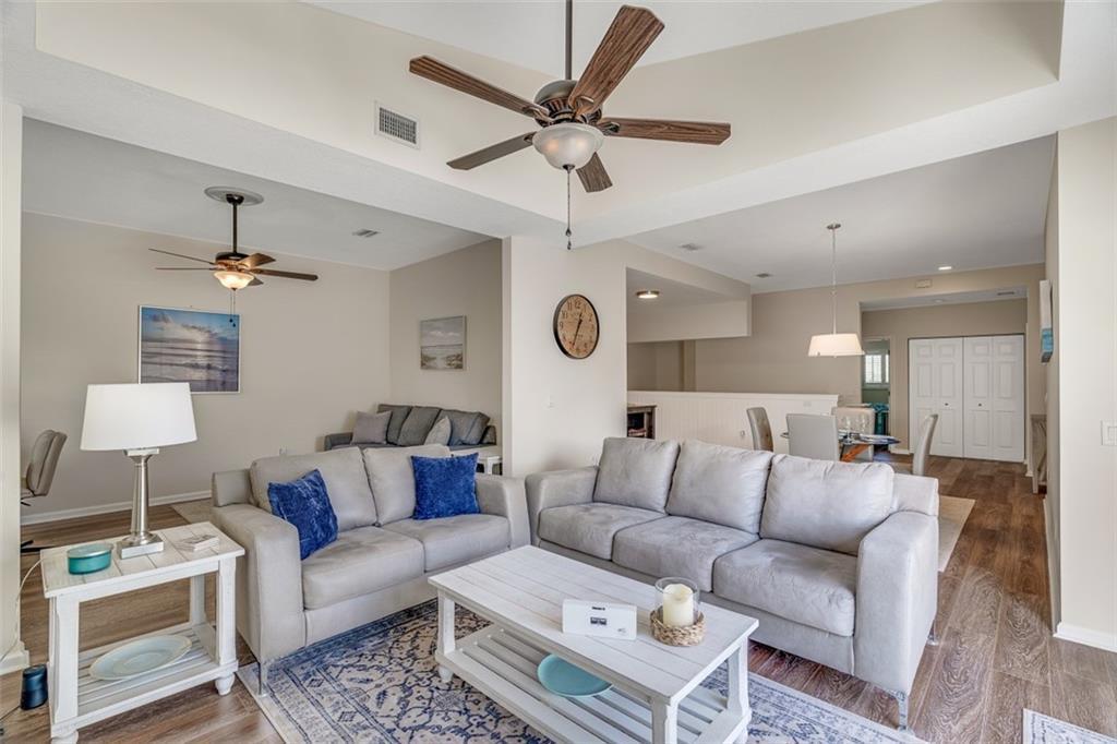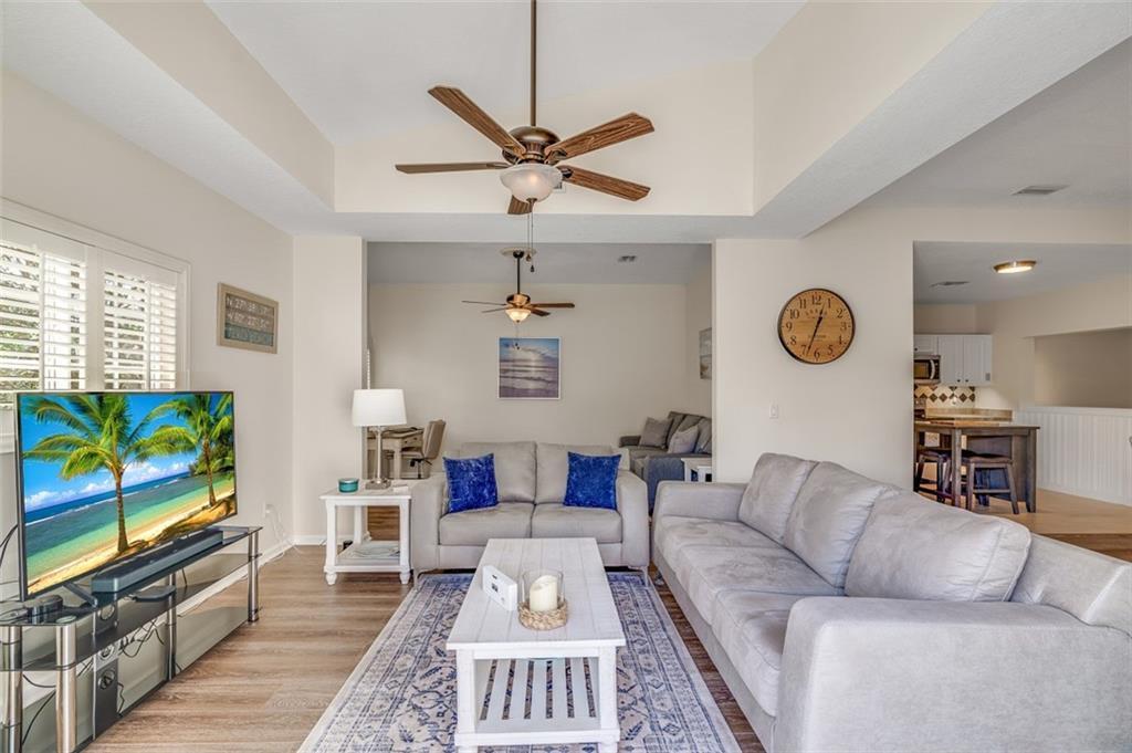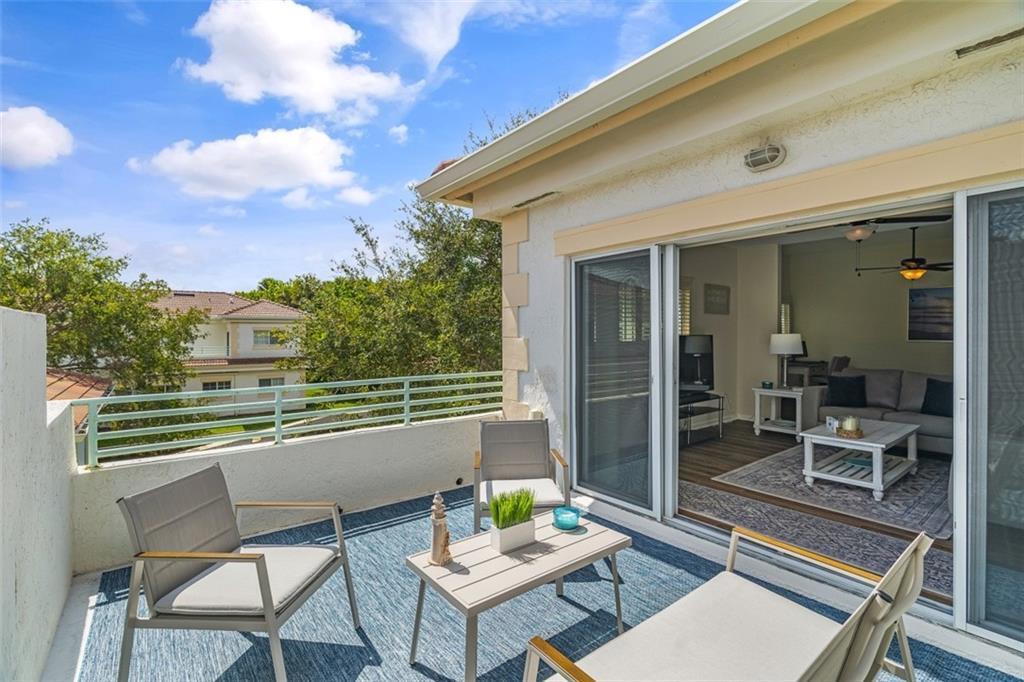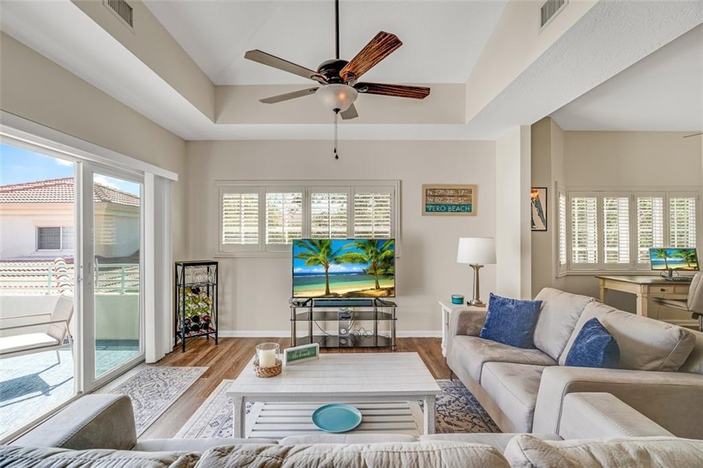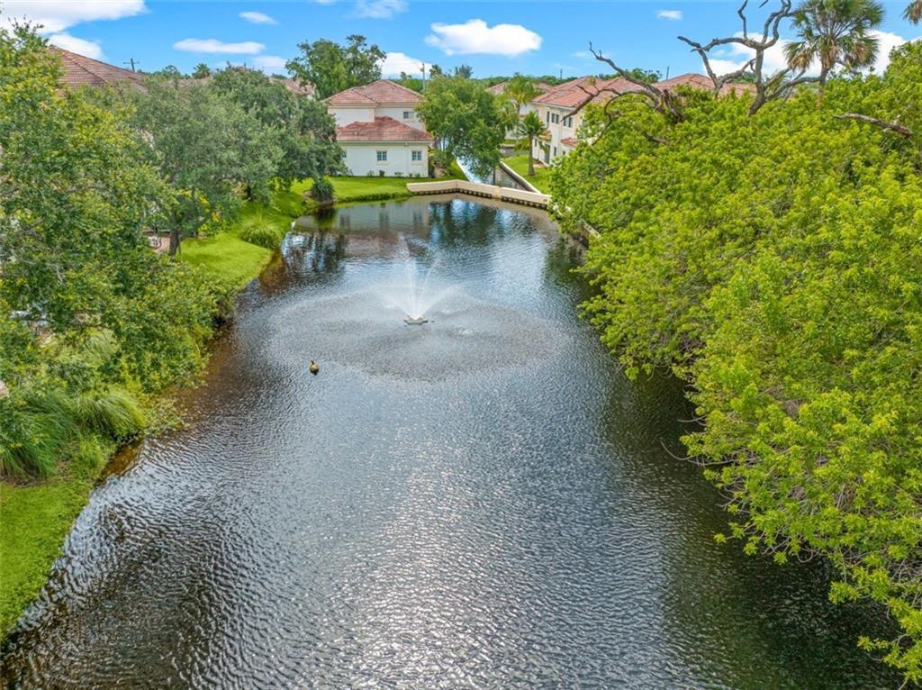 Experience the best of coastal living in this spacious 2BR/2BA walk-up penthouse w/private open balcony overlooking canal & fountain. Open floor plan features LVP & tile flooring; flex room for extra living/office space; modern kitchen w/newer stainless steel appliances; impact glass throughout; & private 1-car garage w/storage space. Owner's suite w/large cedar-lined walk-in closet; large private bath. Recent updates include newer a/c, water heater; building roof. Maintenance fee covers internet, cable TV, pool access, lawn care; trash pickup. Minutes to the beach, shopping; restaurants