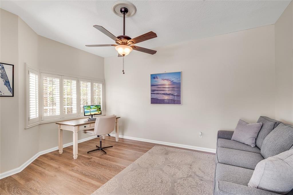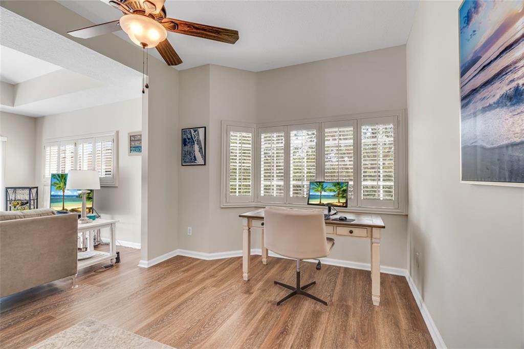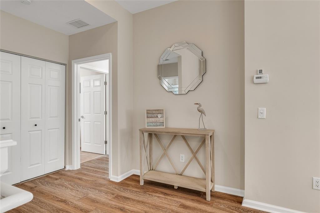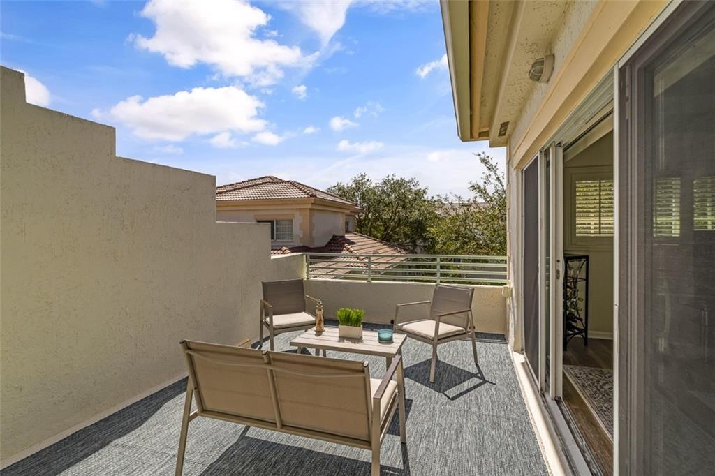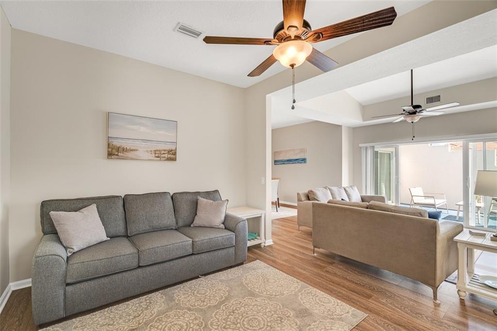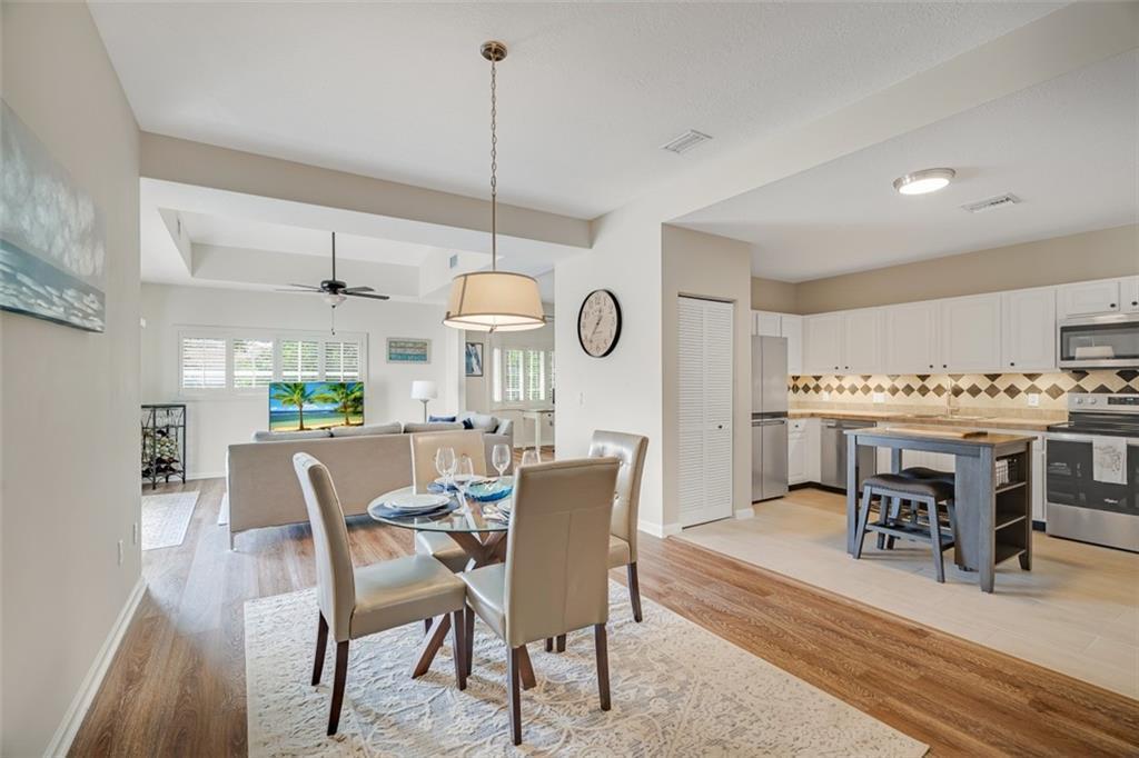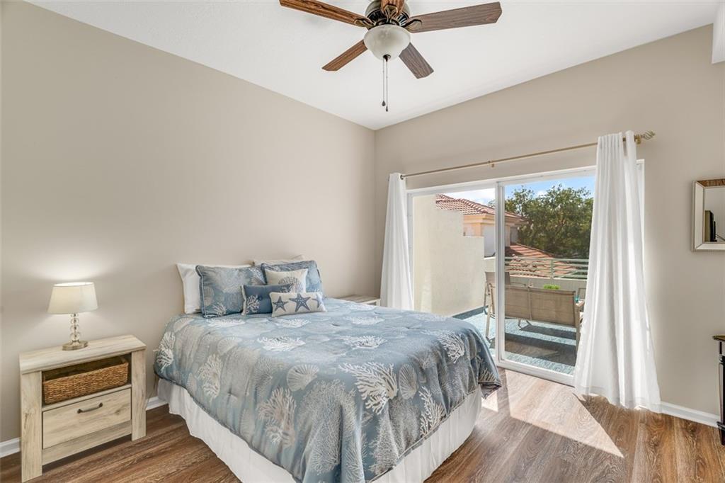 Experience the best of coastal living in this spacious 2BR/2BA walk-up penthouse w/private open balcony overlooking canal & fountain. Open floor plan features LVP & tile flooring; flex room for extra living/office space; modern kitchen w/newer stainless steel appliances; impact glass throughout; & private 1-car garage w/storage space. Owner's suite w/large cedar-lined walk-in closet; large private bath. Recent updates include newer a/c, water heater; building roof. Maintenance fee covers internet, cable TV, pool access, lawn care; trash pickup. Minutes to the beach, shopping; restaurants