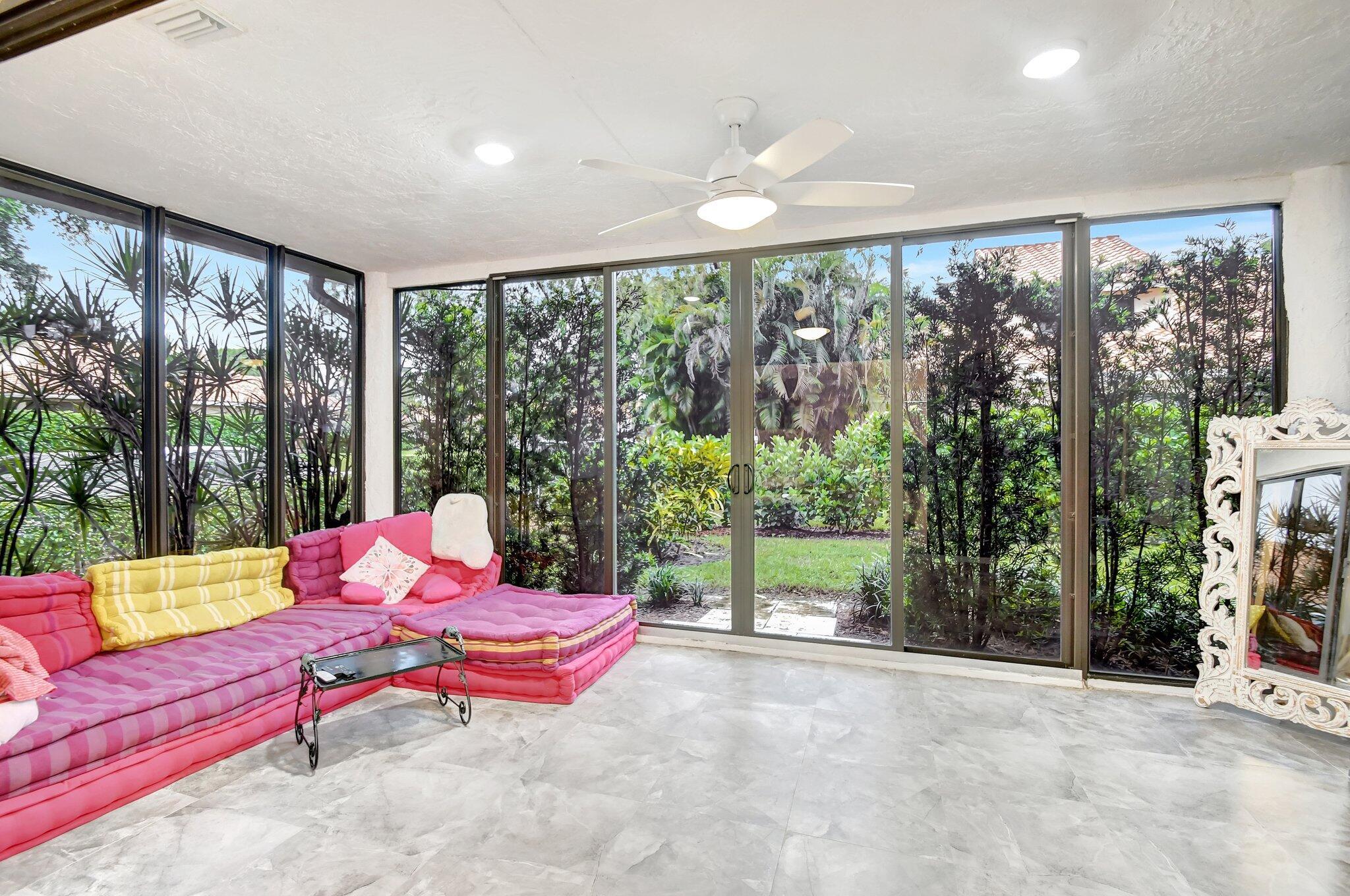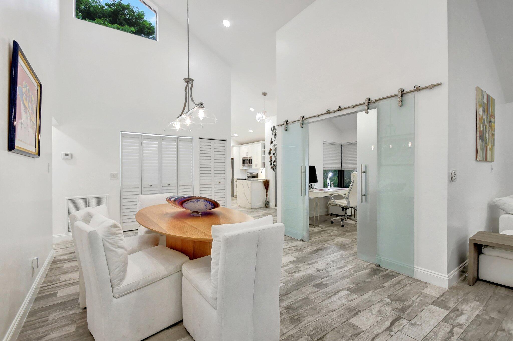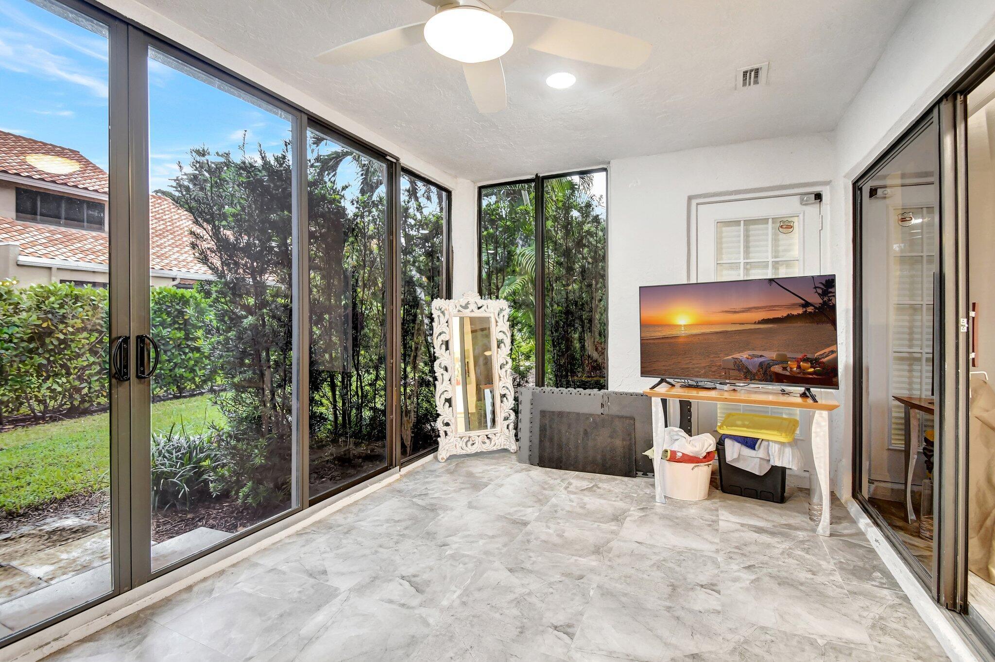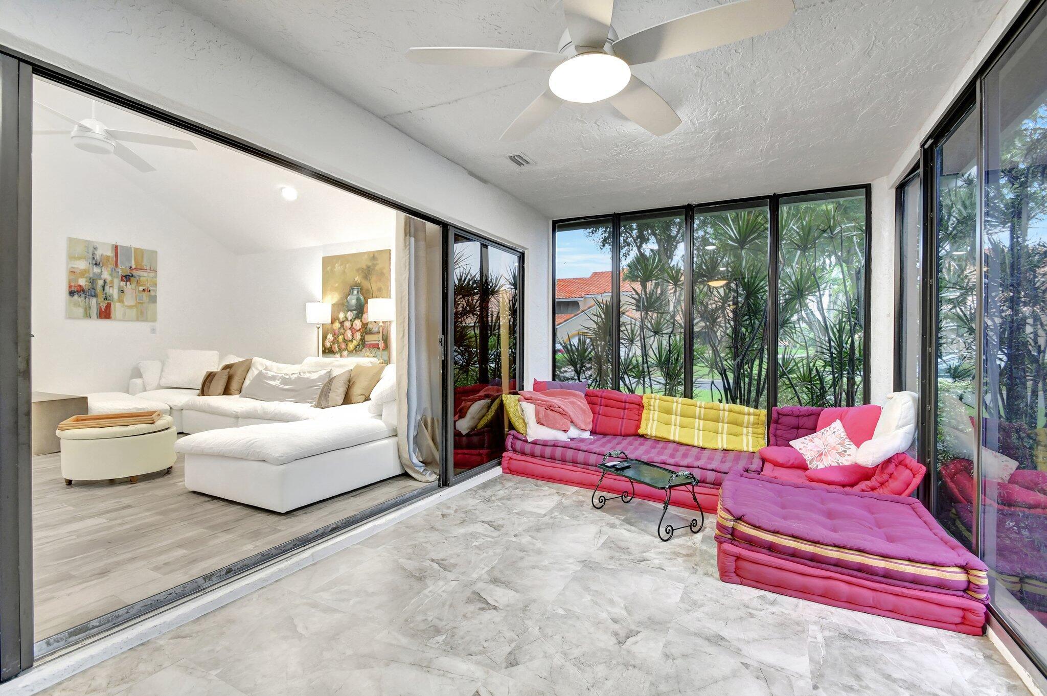 This stunning villa in the highly sought-after Meridiana has been beautifully updated throughout! 2 bedrooms plus a versatile den or 3rd bedroom. Spacious, enclosed air-conditioned sunroom with hurricane impact windows. Volume ceilings, beautiful tile flooring, smooth ceilings with hi-hat lighting, fresh paint, and new window treatments. Kitchen has white cabinetry, quartz counters, stainless steel appliances. Master suite offers a built-in walk-in closet with a safe. Master bath features double sinks, an extra-large shower, and a quartz-topped vanity. 2nd bedroom has a custom walk-in closet, and the den is enhanced with a sleek barn door for added privacy. A/C 2021 and water heater 2018. Situated as an end unit, with private corner location. Community pool and a small clubhouse.