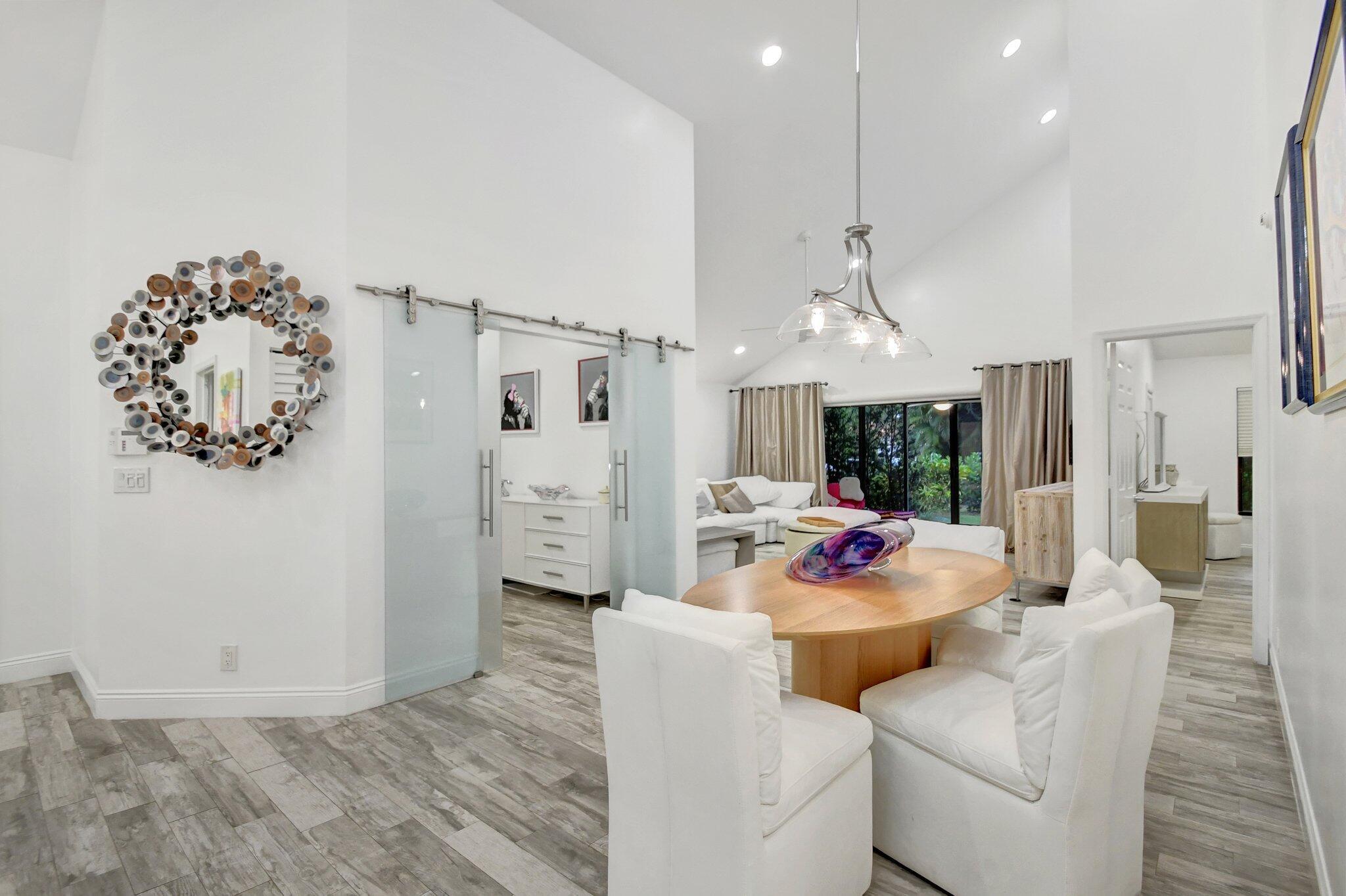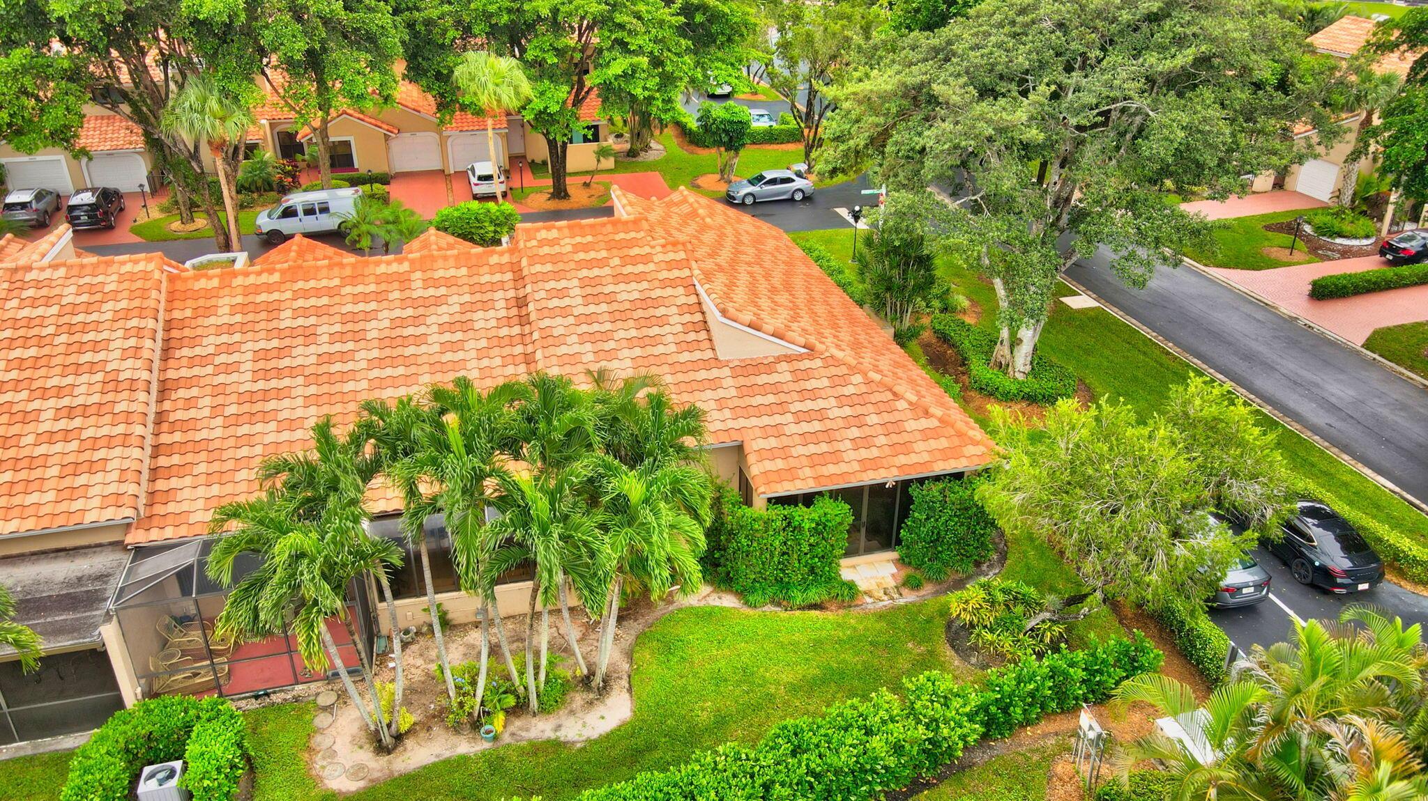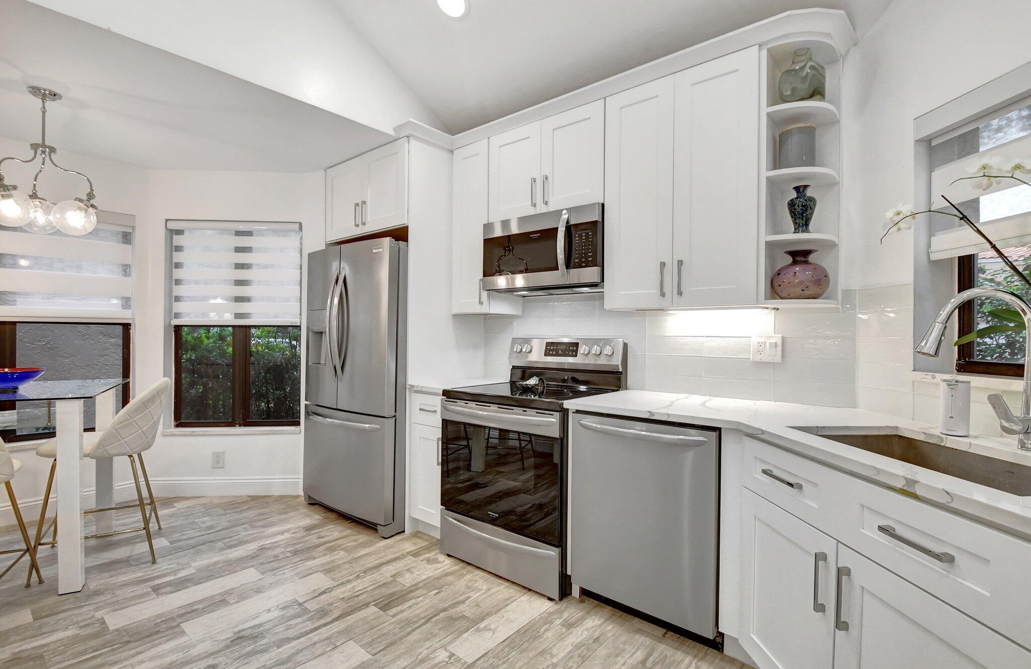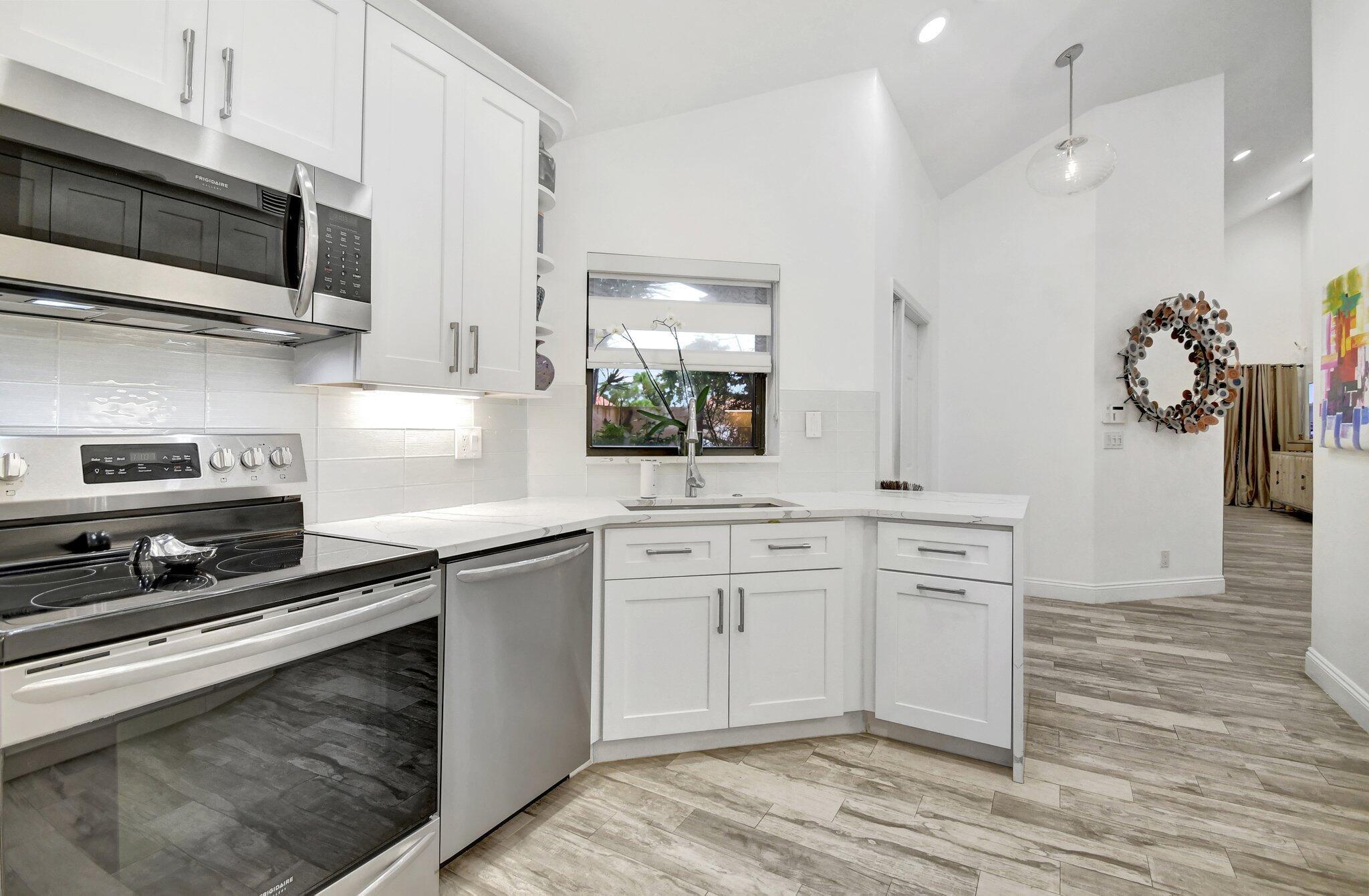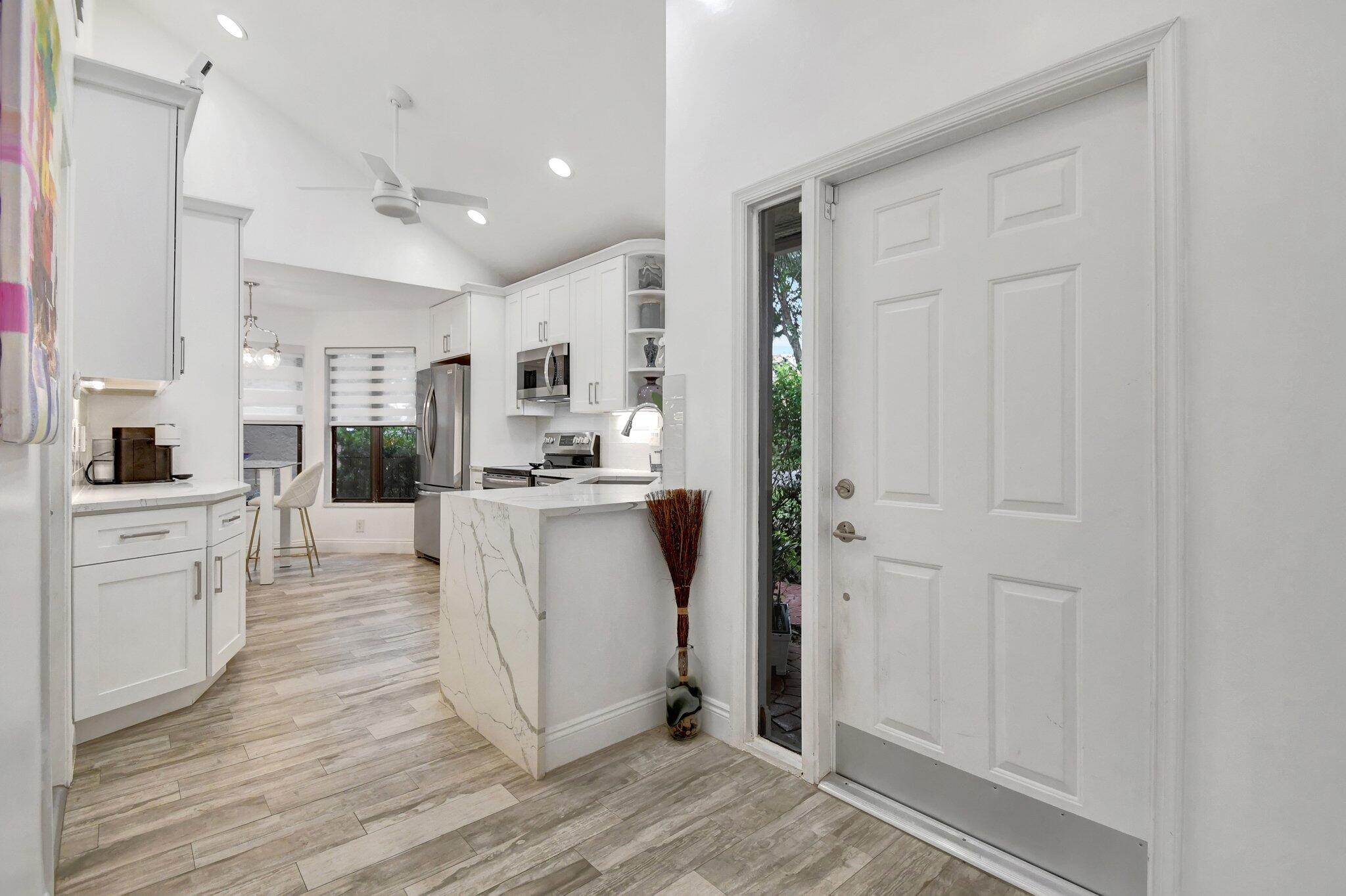 This stunning villa in the highly sought-after Meridiana has been beautifully updated throughout! 2 bedrooms plus a versatile den or 3rd bedroom. Spacious, enclosed air-conditioned sunroom with hurricane impact windows. Volume ceilings, beautiful tile flooring, smooth ceilings with hi-hat lighting, fresh paint, and new window treatments. Kitchen has white cabinetry, quartz counters, stainless steel appliances. Master suite offers a built-in walk-in closet with a safe. Master bath features double sinks, an extra-large shower, and a quartz-topped vanity. 2nd bedroom has a custom walk-in closet, and the den is enhanced with a sleek barn door for added privacy. A/C 2021 and water heater 2018. Situated as an end unit, with private corner location. Community pool and a small clubhouse.