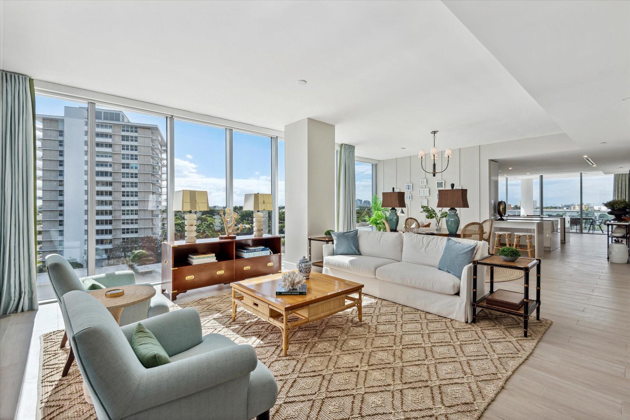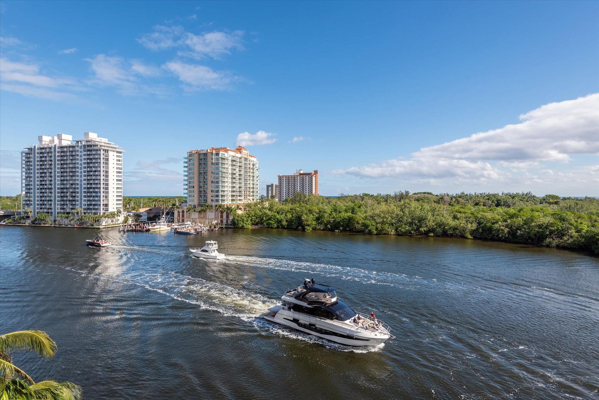 Located directly on the Intracoastal Waterway, Aquablu consists of 35 luxury residences. This flow-through SE corner unit offers sweeping views of the water/historic Bonnet House/City skyline from the impressive balconies. Private double door foyer entry opens to a great room with 10' ceilings & glass walls, highlighting the views & bathing the space in natural light. Professionally designed touches abound in the open-concept living/ dining spaces. The chef's kitchen boasts high-end appliances with a massive island, walk-in pantry, & immense counter space. Wake up to amazing sunrises from the Primary suite, which overlooks the water with a spa bath & 2 large walk-in closets. 2 additional en-suite bedrooms & two assigned covered parking spaces are located near beaches, shopping, & dining.