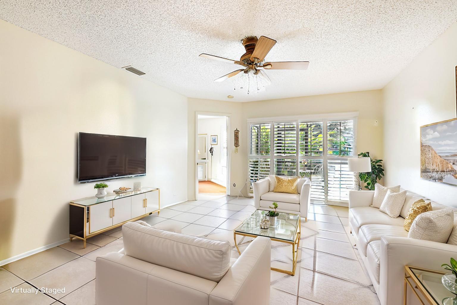 Beautiful 2 Bed/2 Bath 1st floor Condo in the highly desirable developent of River Bridge. Relax on the Patio with its serene water view. Kitchen recently redone with white cabinets. Walking distance to the Pool. Manned-gated community with resort style amenities, Maintenance fees include access to 3 heated pools, spa, 6 lighted Tennis courts, basketball, pickle ball, billiard room, gym, playground, Performance Center, Cable and internet. Close to PBI Airport, shopping, beaches, dining & tons of recreational options including Okeeheelee Park with its public golf course, walking trails, bmx park, world class water skiing & the Tiger Shark Water Park.