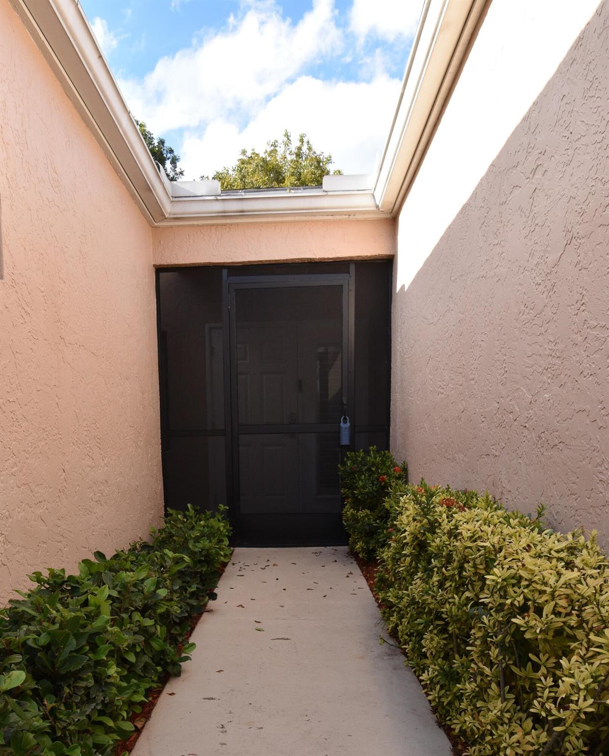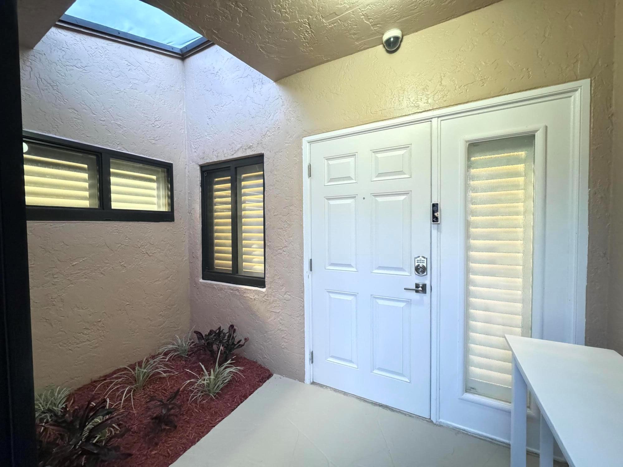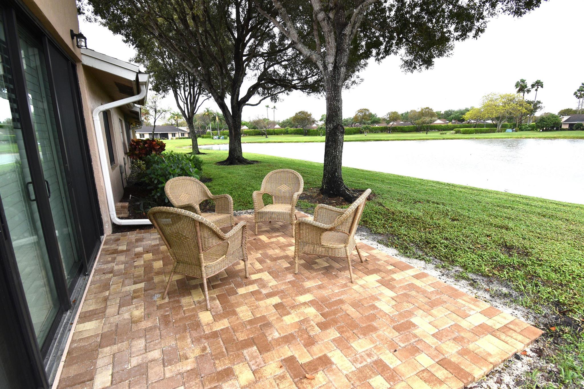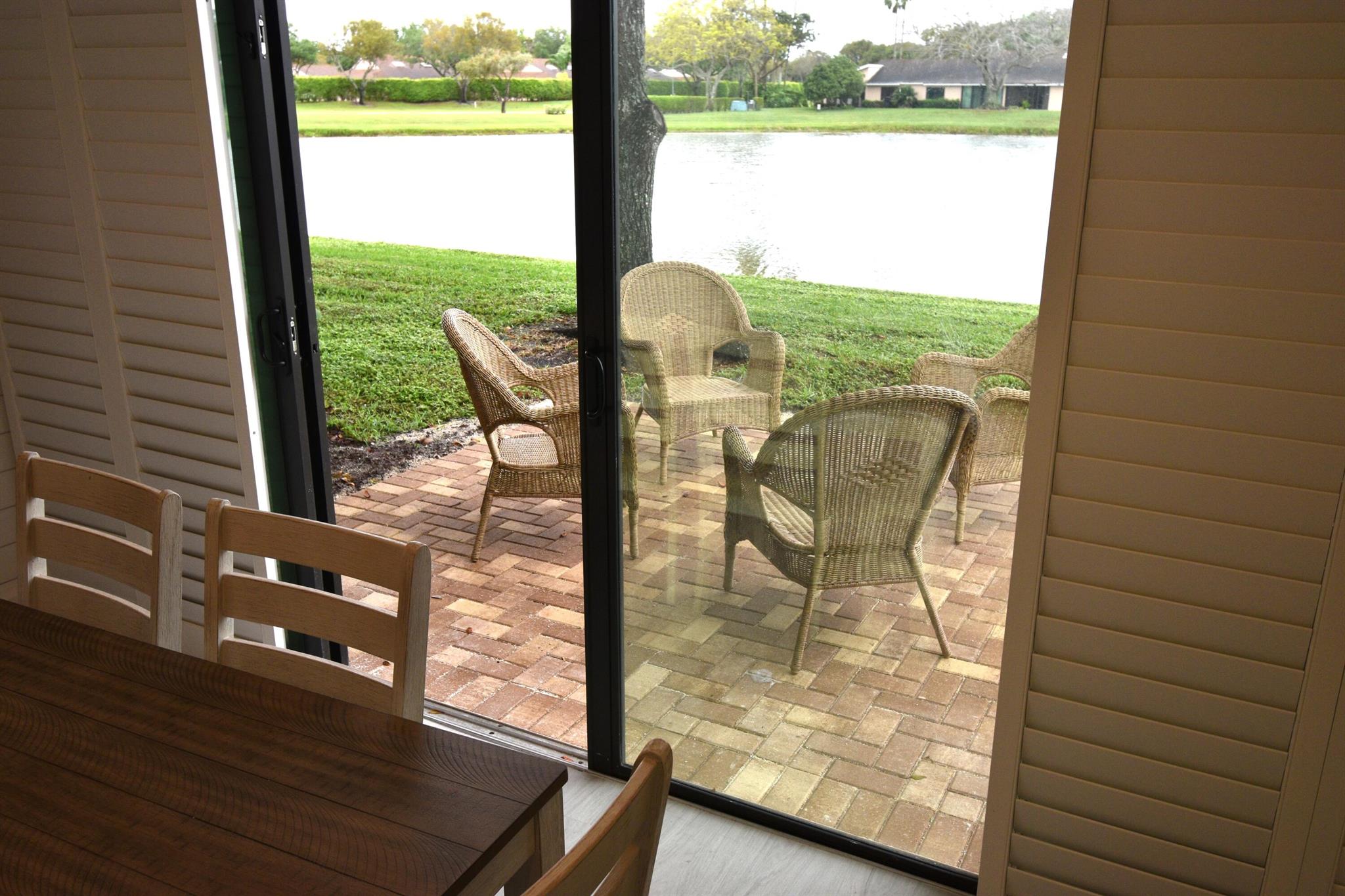 Turnkey furnished option. Designer style upgraded Chateau villa end unit with water view. New fully paid roof and gutters (11/2024). New 3-ton 15.2 SEER2 HVAC system (8/2024). New hot water heater (2023). The villa is secured with complete high impact doors and windows, including the floor-to-ceiling Florida room sliders and garage door. The original exterior sunroom was legally enclosed creating an interior air-conditioned Florida room with a PBC building permit. The villa is now 1409sf under air, the largest in Eastgate! With the revision, the villa is now stepless from the driveway, throughout the interior to the backyard brick pavers patio overlooking the water. The end-unit wall faces east, avoiding the hot afternoon sun, with 4 windows, one for each bedroom and bath.