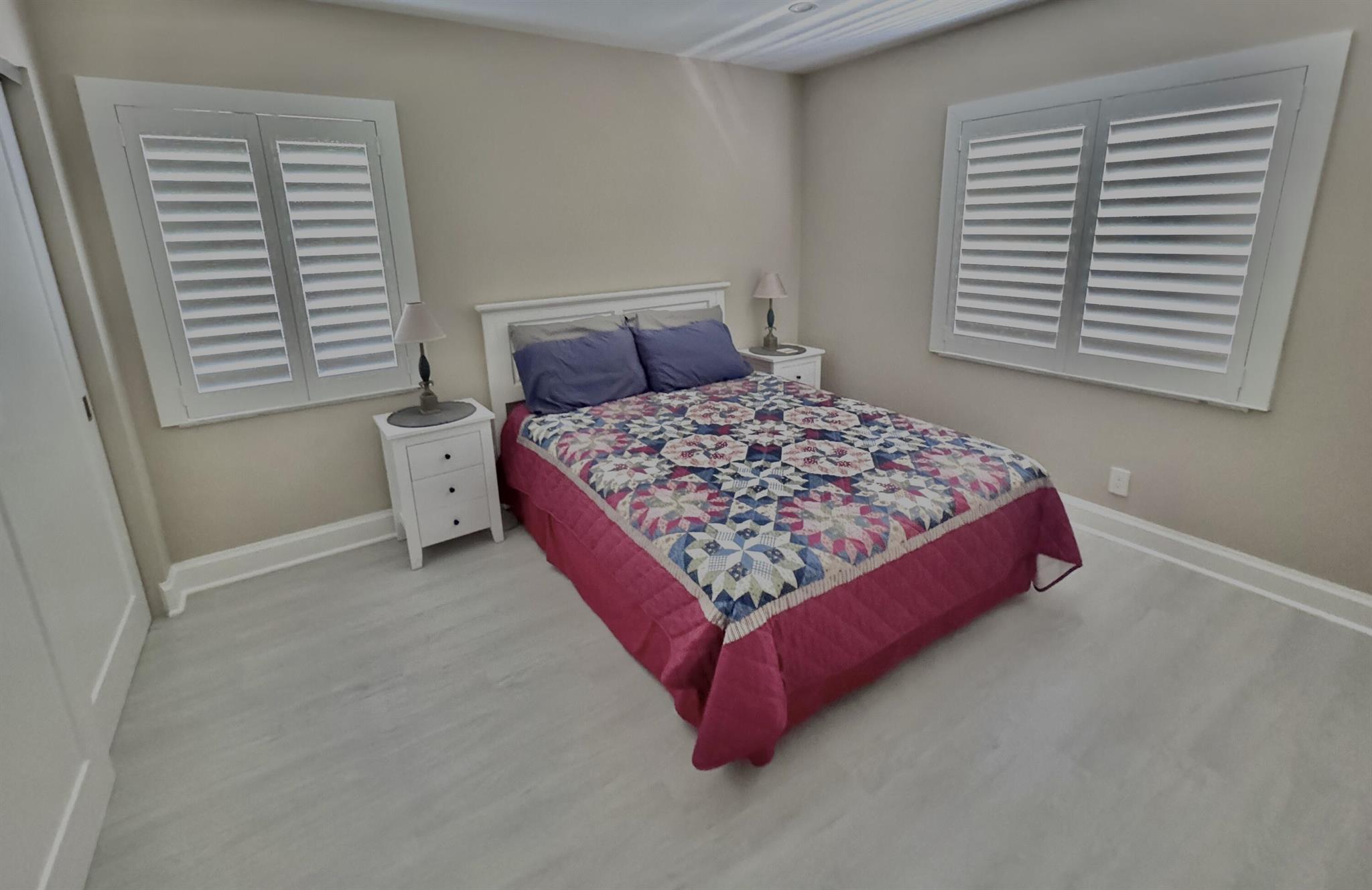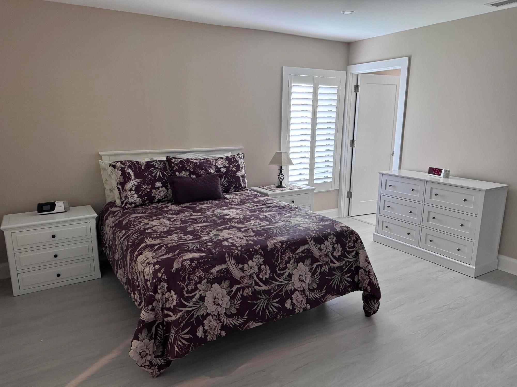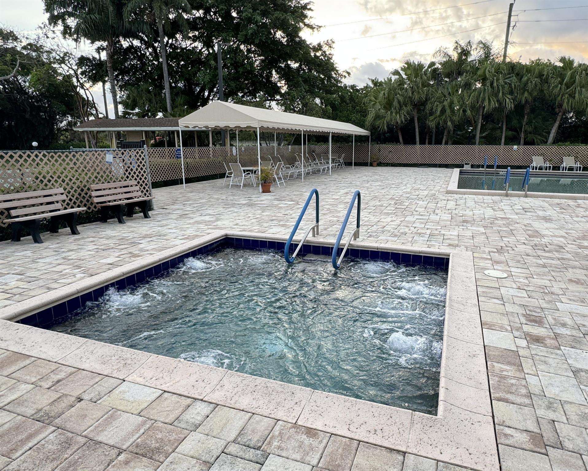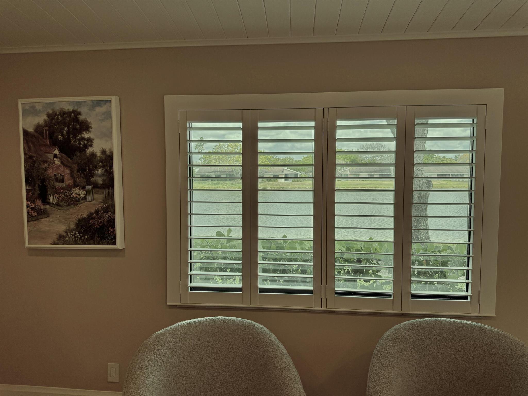 Turnkey furnished option. Designer style upgraded Chateau villa end unit with water view. New fully paid roof and gutters (11/2024). New 3-ton 15.2 SEER2 HVAC system (8/2024). New hot water heater (2023). The villa is secured with complete high impact doors and windows, including the floor-to-ceiling Florida room sliders and garage door. The original exterior sunroom was legally enclosed creating an interior air-conditioned Florida room with a PBC building permit. The villa is now 1409sf under air, the largest in Eastgate! With the revision, the villa is now stepless from the driveway, throughout the interior to the backyard brick pavers patio overlooking the water. The end-unit wall faces east, avoiding the hot afternoon sun, with 4 windows, one for each bedroom and bath.