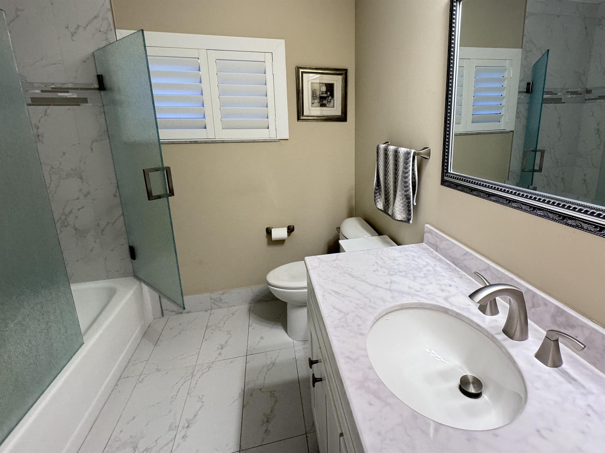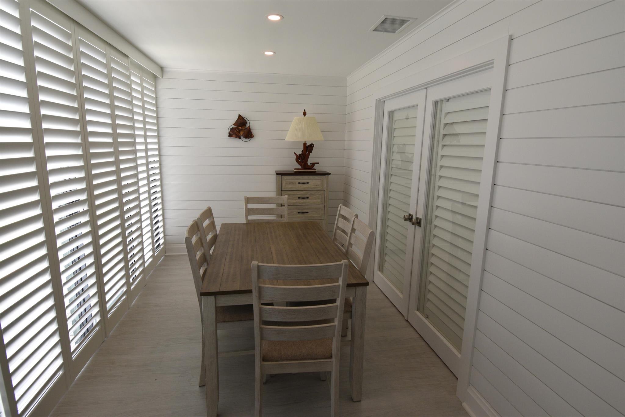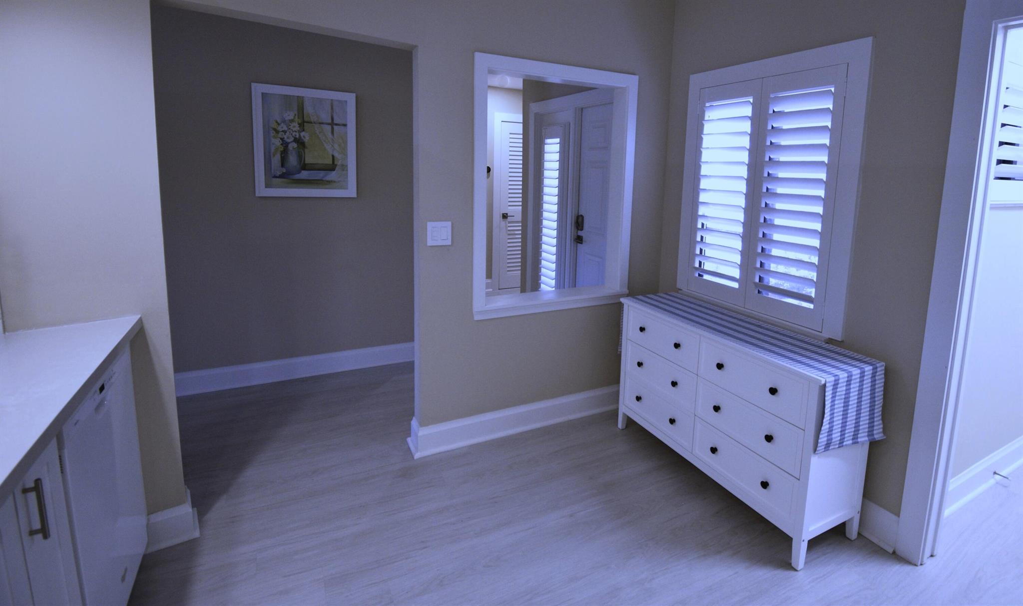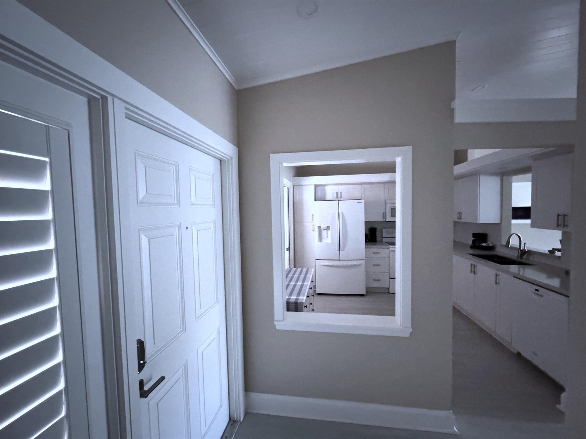 Turnkey furnished option. Designer style upgraded Chateau villa end unit with water view. New fully paid roof and gutters (11/2024). New 3-ton 15.2 SEER2 HVAC system (8/2024). New hot water heater (2023). The villa is secured with complete high impact doors and windows, including the floor-to-ceiling Florida room sliders and garage door. The original exterior sunroom was legally enclosed creating an interior air-conditioned Florida room with a PBC building permit. The villa is now 1409sf under air, the largest in Eastgate! With the revision, the villa is now stepless from the driveway, throughout the interior to the backyard brick pavers patio overlooking the water. The end-unit wall faces east, avoiding the hot afternoon sun, with 4 windows, one for each bedroom and bath.