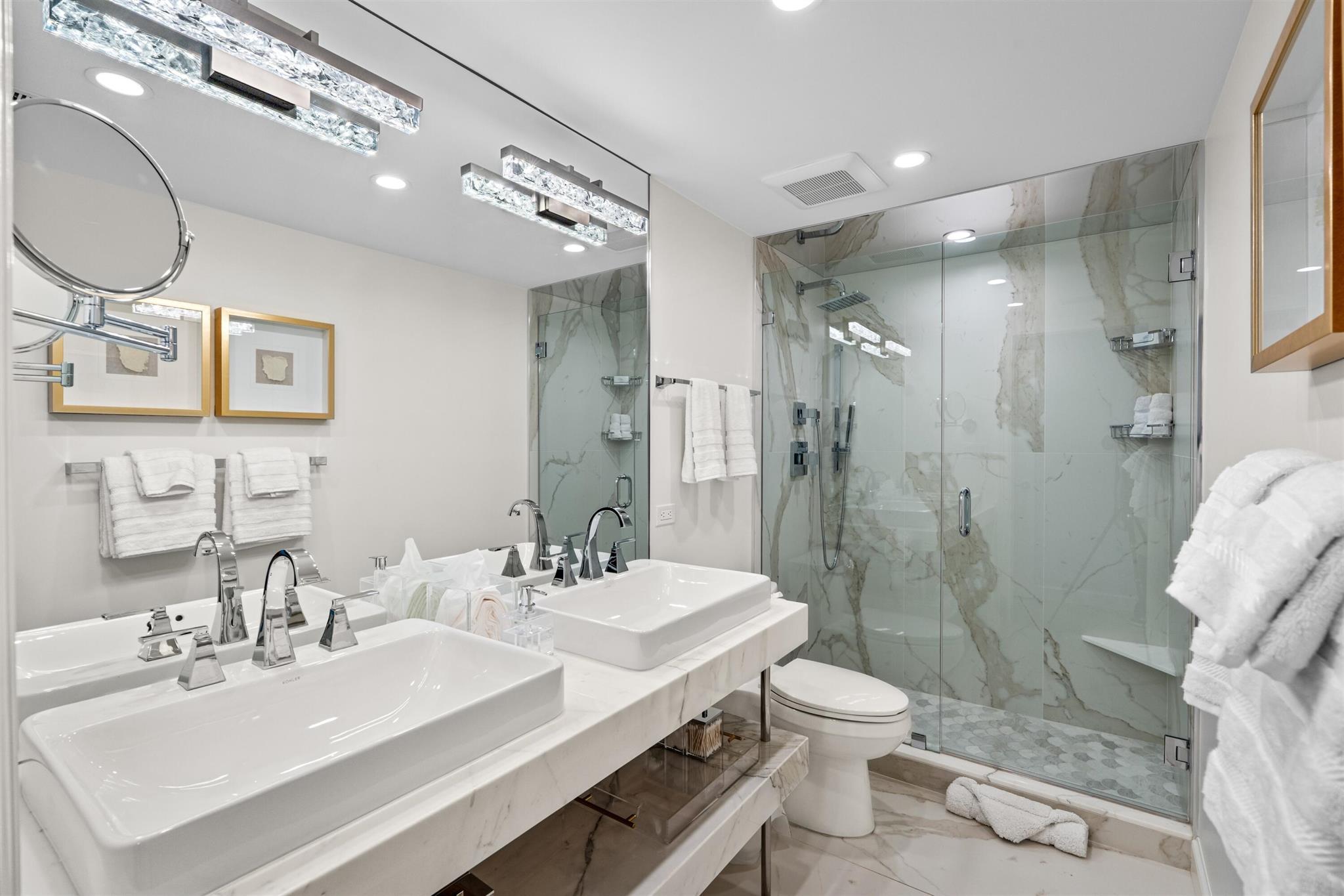 Enjoy unimpeded water and sunset views from this 2BR/2BA first floor corner unit with an open living concept design. This gorgeous home was recently completely gutted and rebuilt with impact floor to ceiling windows and doors in every room, new kitchen, new baths, new coral tile floors, and new hide-a-way Bluetooth blinds throughout. Exquisite finishes include Gracie hand painted wallpaper, elegant kitchen with under-lit counters & top of the line all new Thermador appliances plus marble bathrooms with custom floating vanities. Villa Serein condo complex living uniquely boutique with only 2 stories high and 8 units. Sold beautifully furnished right down to the dishes, flatware, pots, pans and bed linens too! All brand new.
