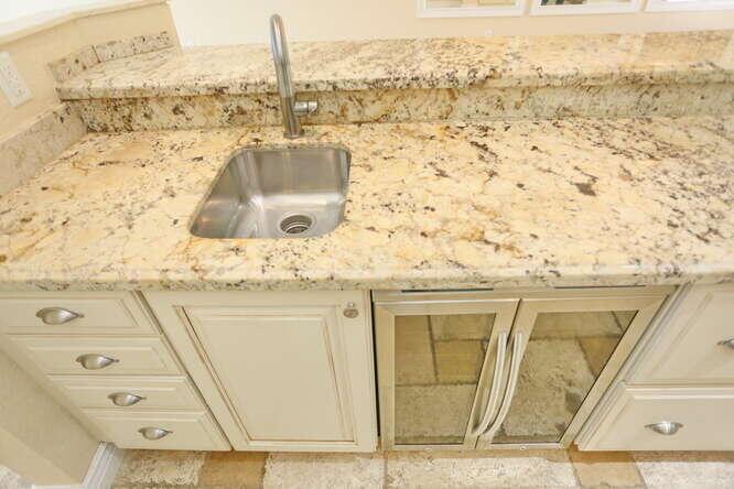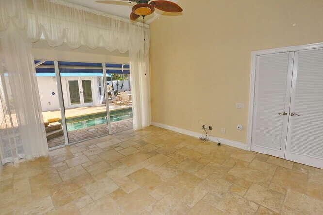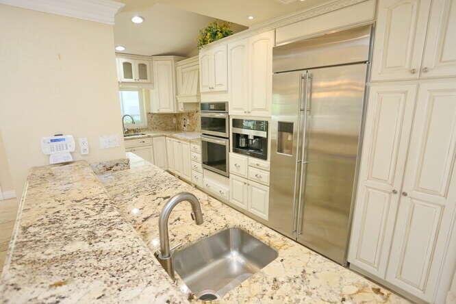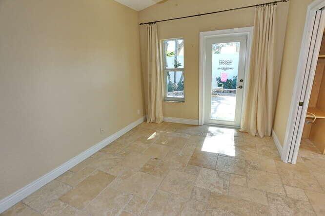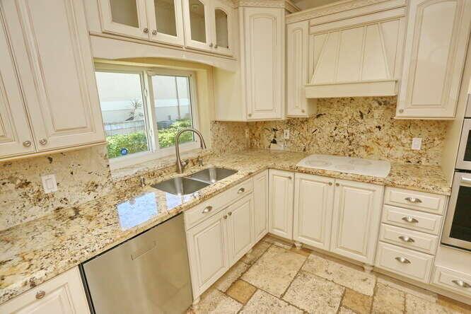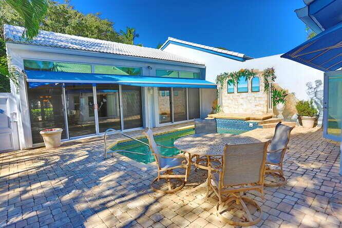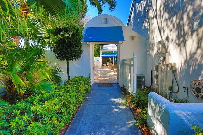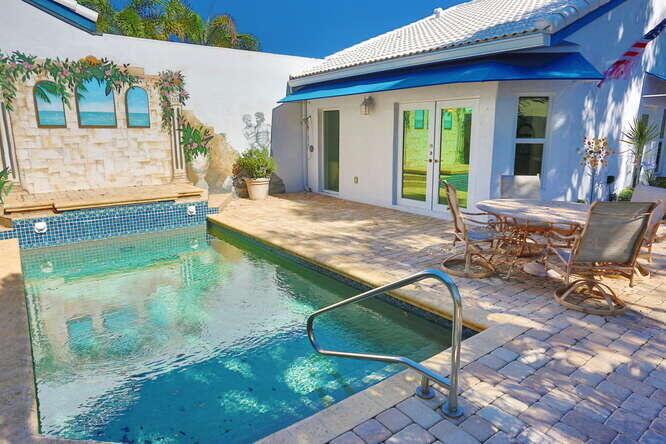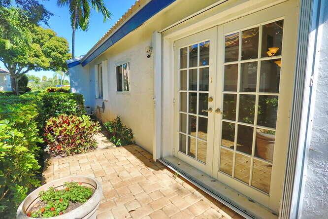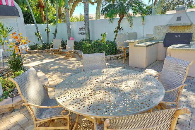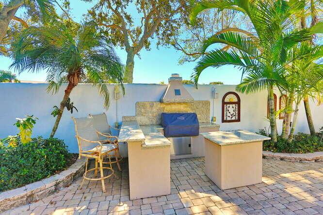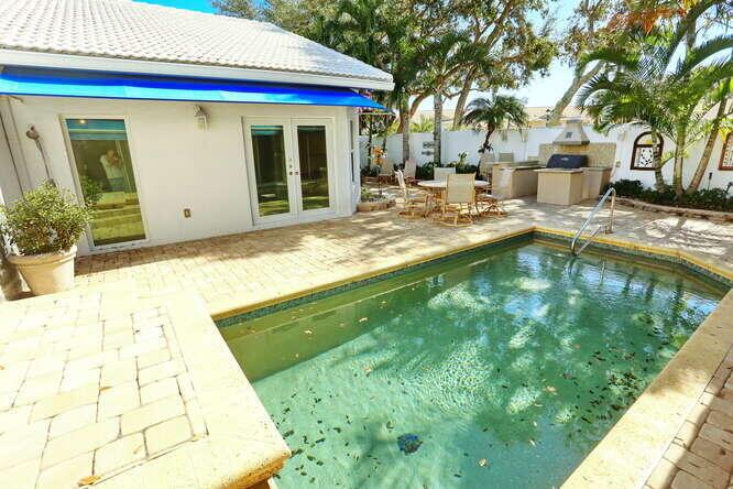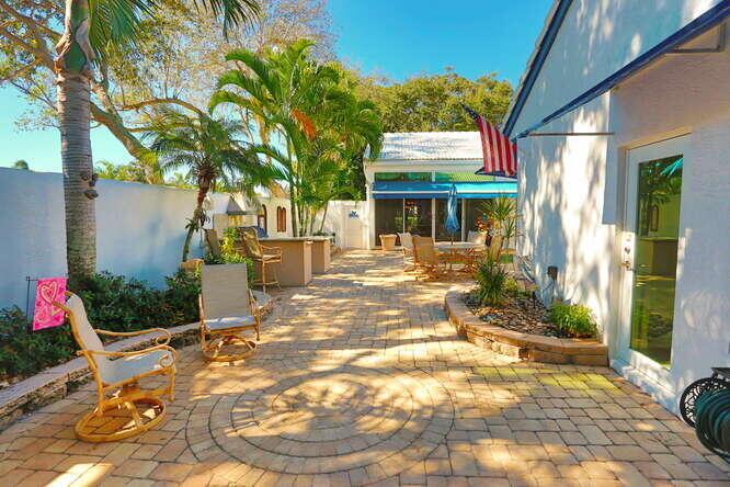 MUST CALL TINA FOR GATE ACCESS!! Dramatic price reduction. This amazing corner courtyard home with a pool in a beautiful, gated community. Full hurricane protection. Roof 2018, A/Cs 2018, garage freezer 2020. Walk thru the double door entrance, to be amazed by the secluded garden like setting with a granite summer kitchen and sparkling private pool. Main house has an updated kitchen, wall removed for a more open look. Upgraded appliances including a $7,000 Miele coffee center. Pull out shelves throughout the kitchen. Perfect sized primary suite. Bath has double sinks, separate tub/shower. Across the courtyard is a versatile guest house. 2 bedrooms (both have window, door and closet) and remodeled bath or 1 bedroom plus an office/den/living room. W/D in guest house. New awnings 2020