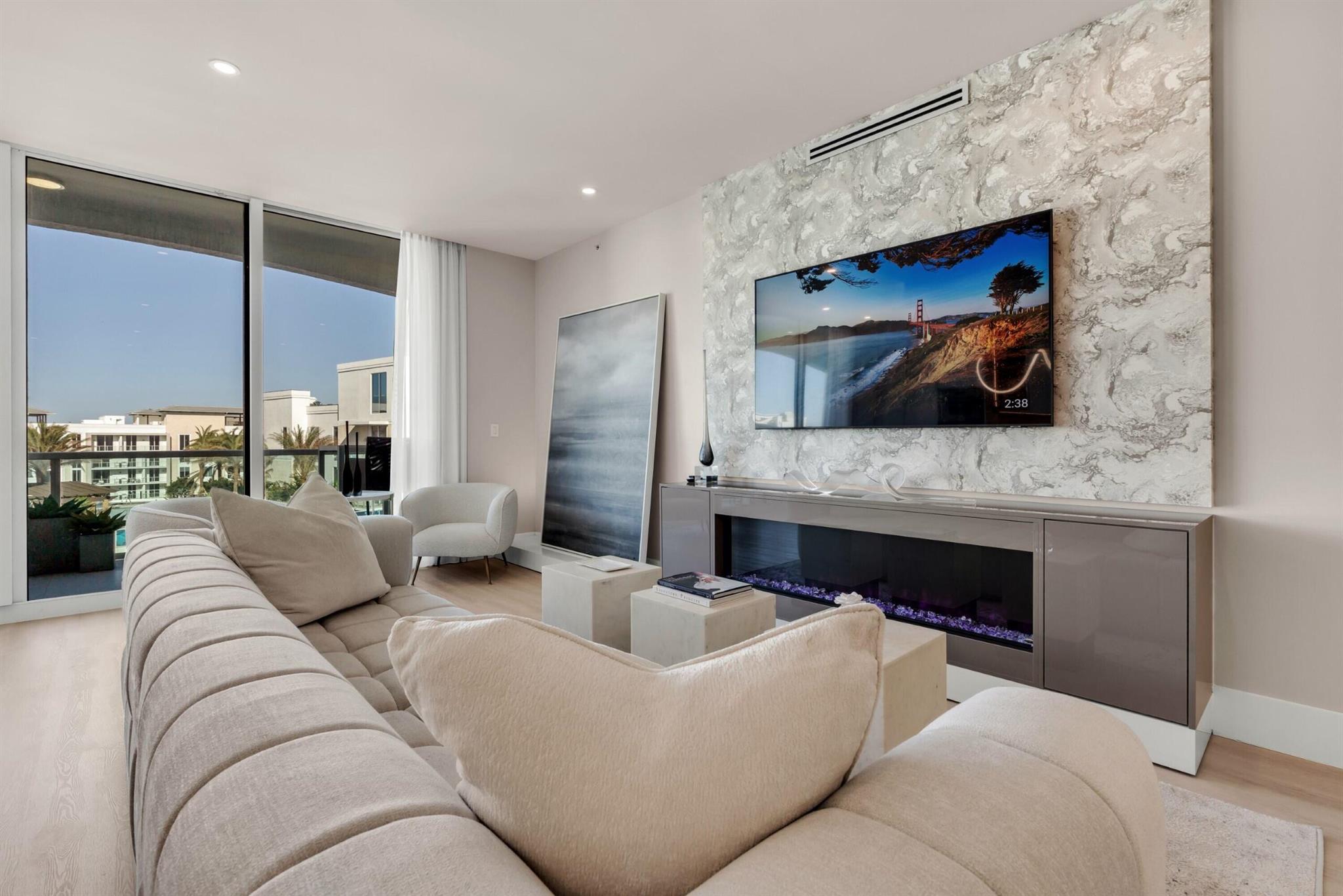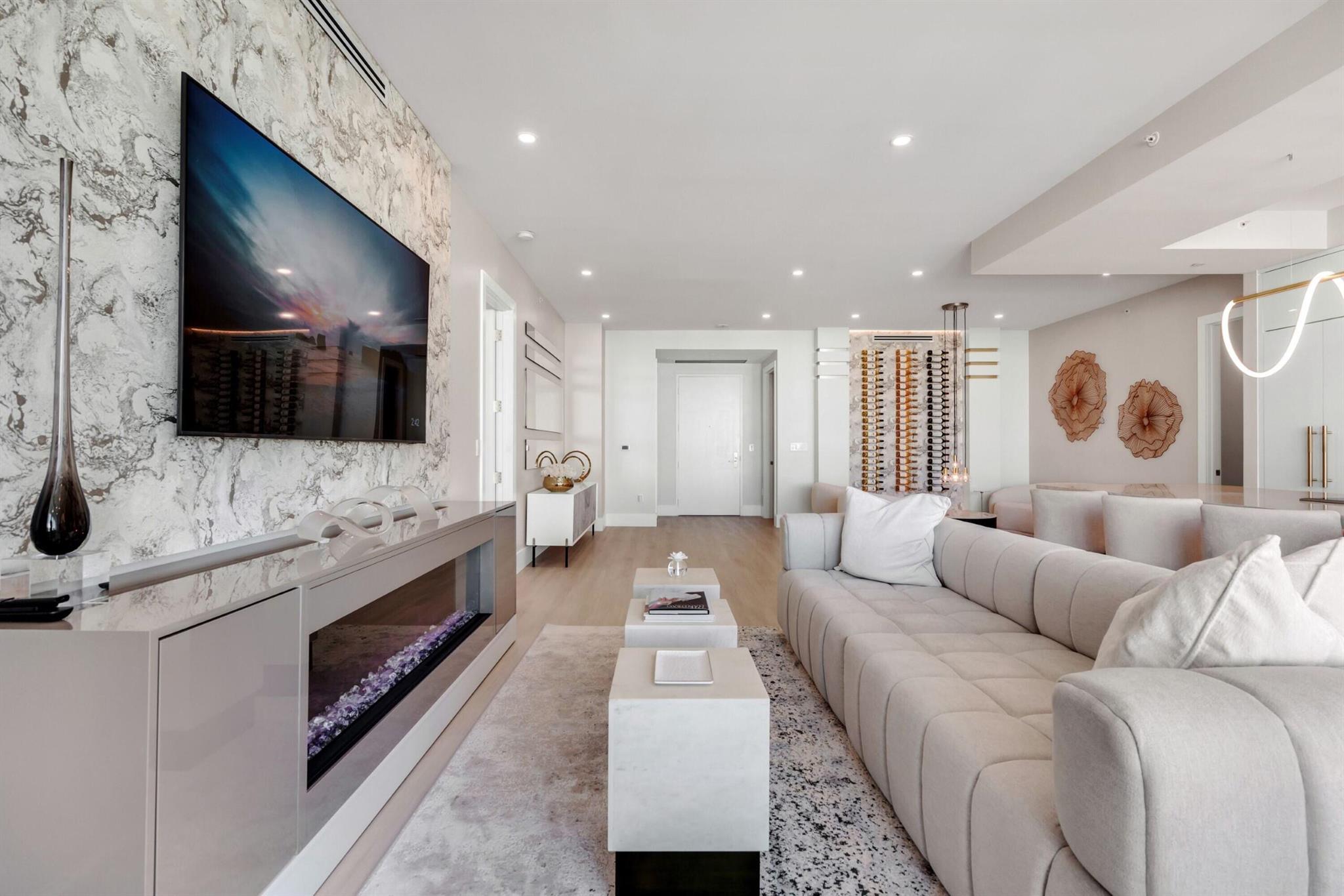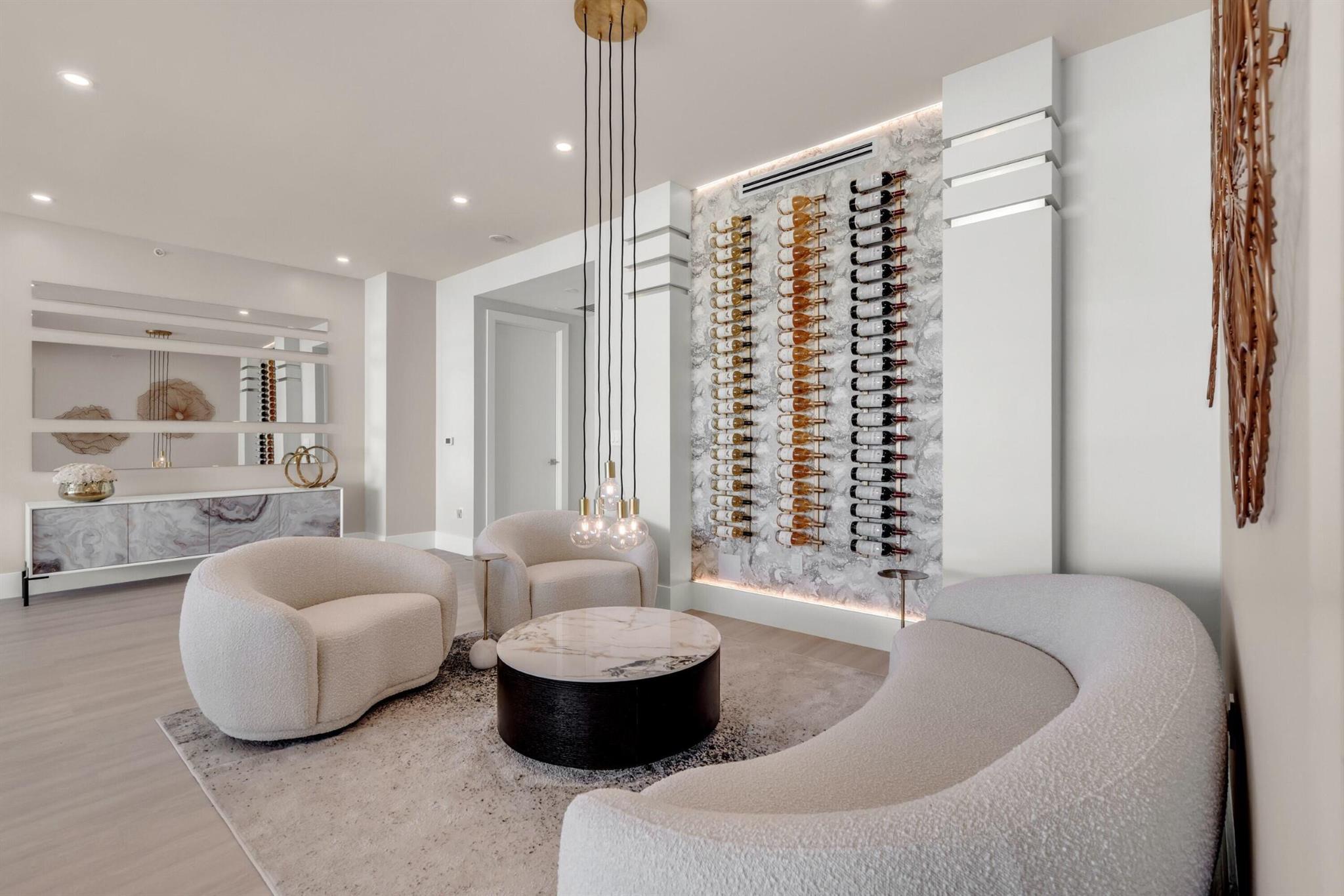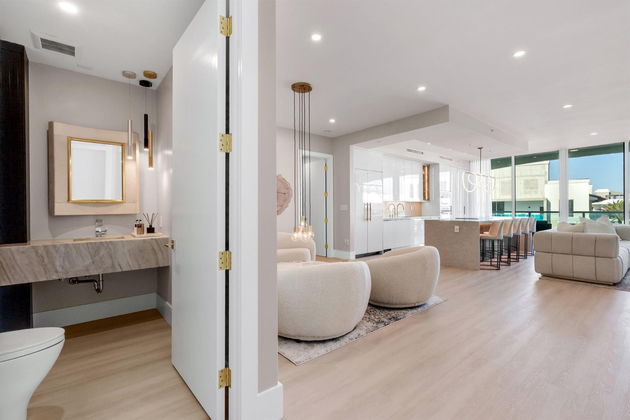 This renovated Townsend Place penthouse features a sleek ultra-modern aesthetic that fits the downtown Boca Raton lifestyle. Details include an open floorplan with soaring 10-foot ceilings, a spacious terrace accessible from every room, a minimalist design with a neutral monochromatic palette accented by gold, and bold-statement light fixtures that combine to create the ultimate in modern luxury.