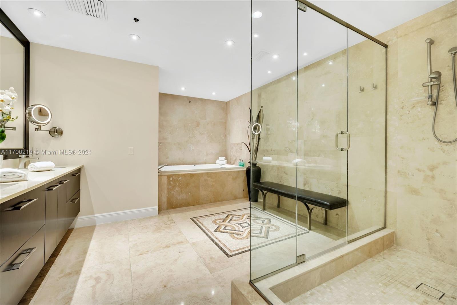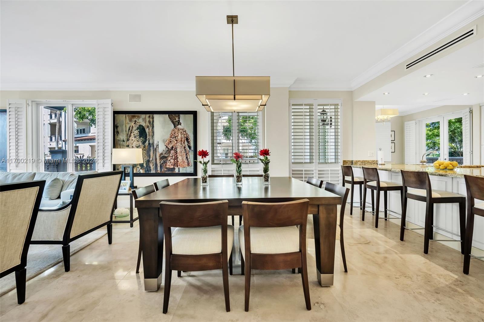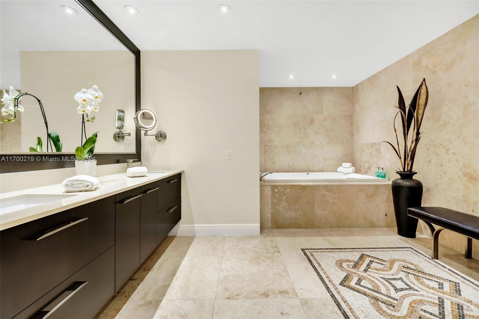 Impeccable ground level 3BR, 3.5 baths on Bayside. Updated in 2019 with contemporary relaxed decor, and luxurious finishes, pristine marble floors throughout, 10.5ft ceilings, OPEN chef kitchen features marble countertops, stainless steel appliances, built-in custom cabinetry, an updated SONOS media system, and Smart Home. Garage space(s) feat. brand new Tesla Charger, two best parking spaces, golf cart space, and Garia golf cart. Conveniently located adjacent to the pool. “D” model is one of the most sought-after split bedroom floor plans on the Island boasting a deep wraparound terrace with stunning panoramic Bay and city skyline views and mesmerizing sunsets. All windows and doors are impact glass. New central VAC.