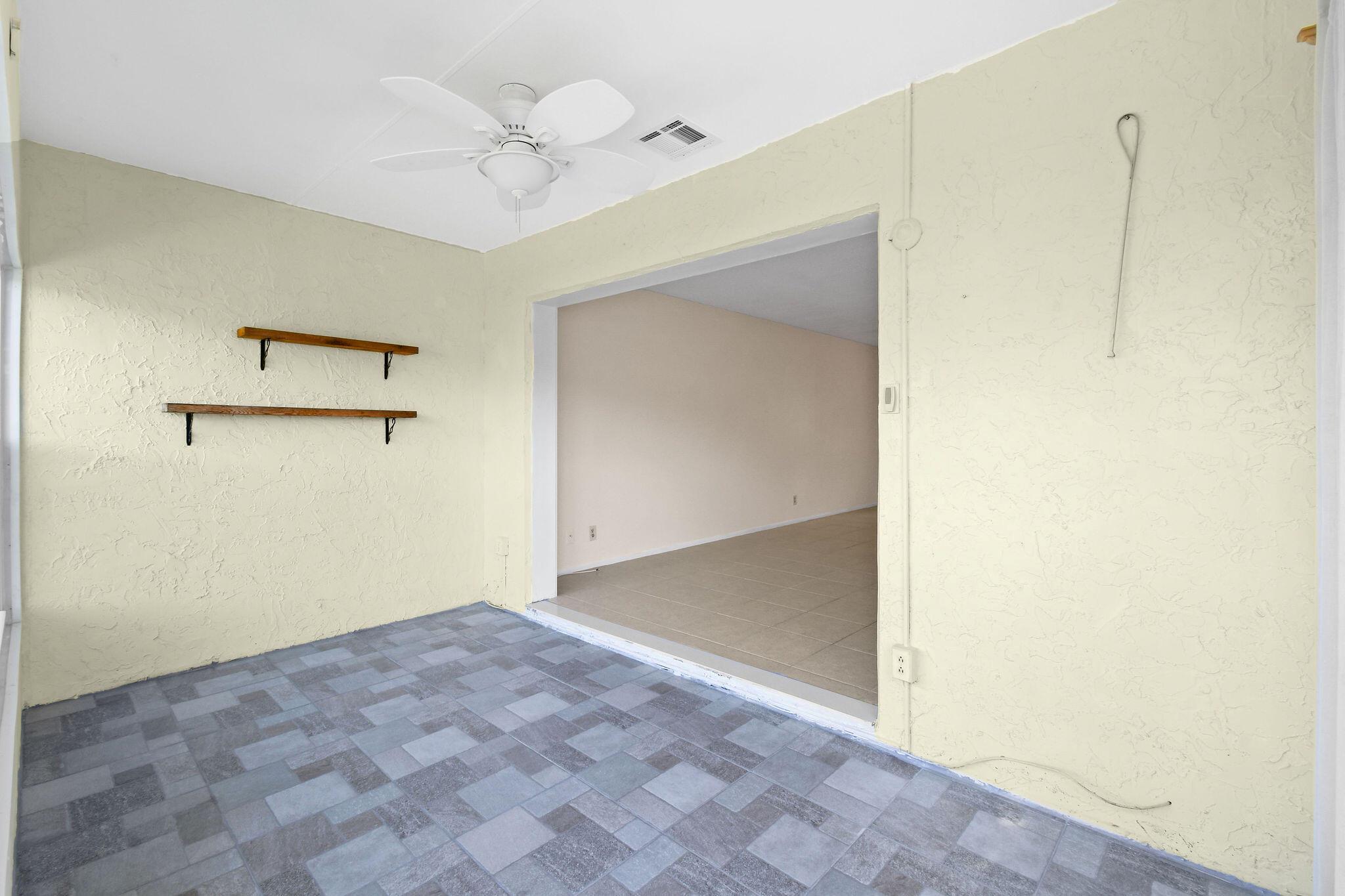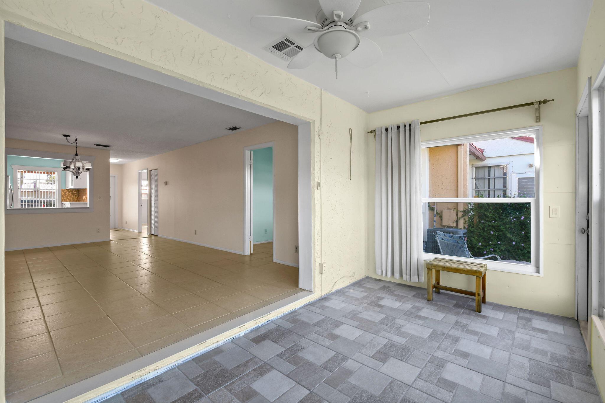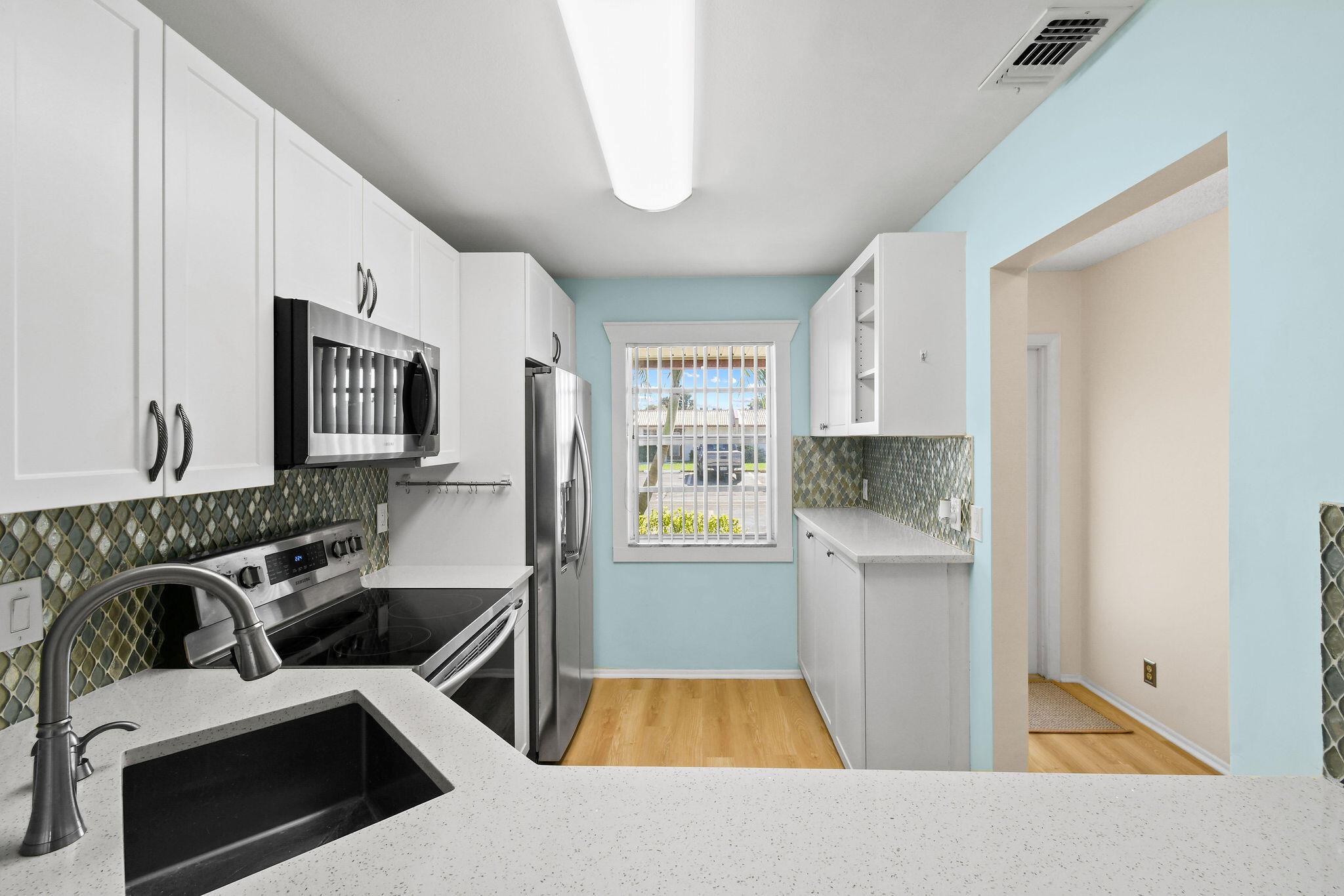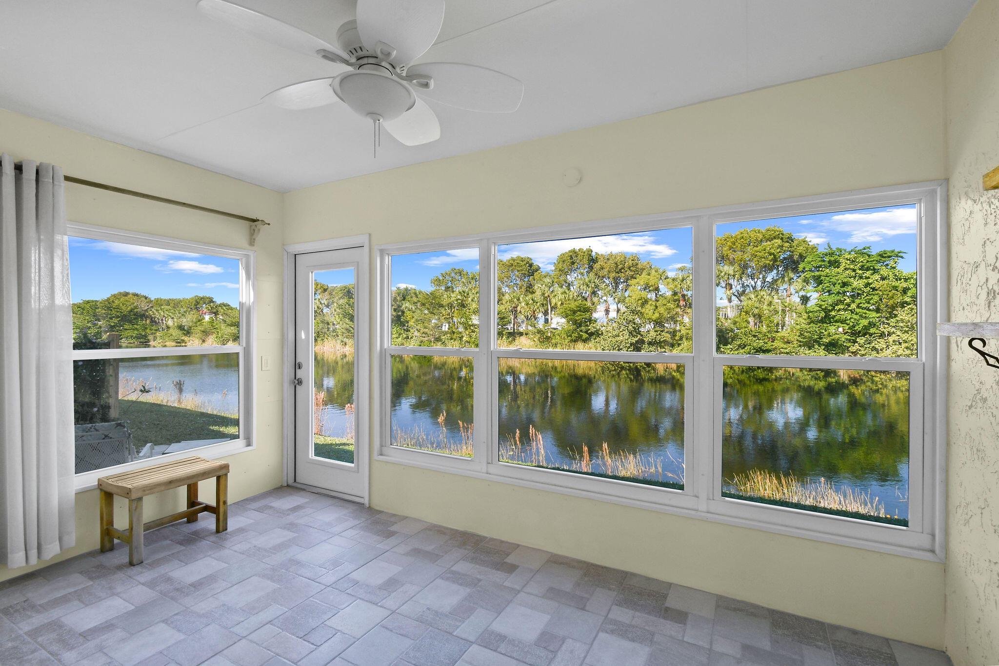Totally renovated 2/2 Villa. Interior just painted. New A/C, IMPACT windows, porcelain tile floors. Enclosed Patio with A/C overlooking waterway. 24/7 Guard gated, full time social director schedules trips, shows and many events. Pool, Gym, Hot tub, Billiards, Bocce Ball court and so much more. Inside washer/dryer installed. Great location, close to shopping, dining, airport and approx 20 min to downtown West Palm Beach. Come discover Golden Lakes Village.
