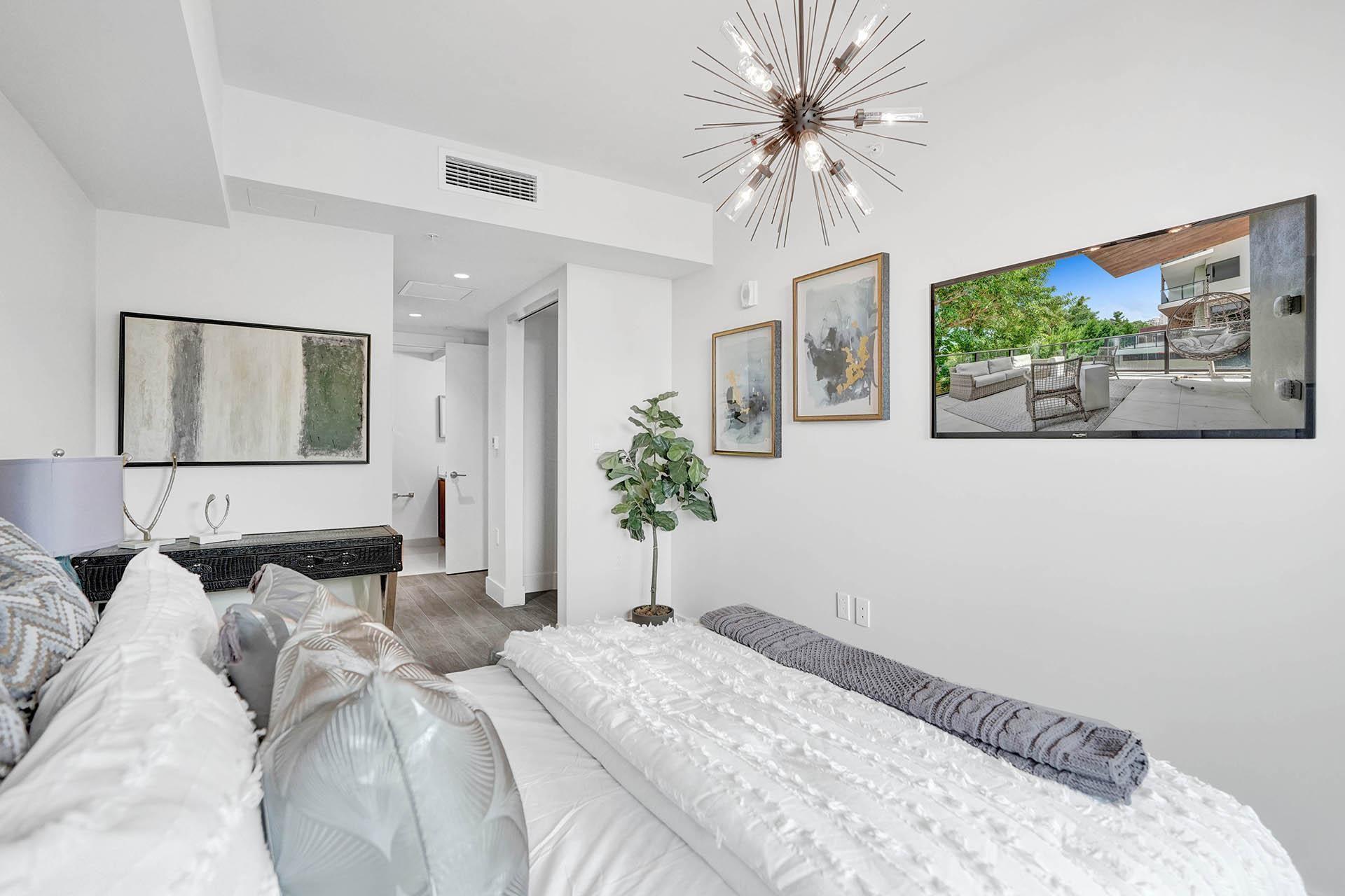 Newer construction-corner 2-story condo w/floor-to-ceiling glass lets the light pour in & has views of lush greenery, bringing the outdoors in. Beautiful large gourmet kitchen has high-end finishes w/subzero & wolf appliances, quartz counters & Italian cabinetry. Direct elevator entrance into this move-in ready property furnished w/a neutral palette. Huge terrace w/summer kitchen & backyard atmosphere. Private home feel w/the convenience condo living. Large main bedroom w/double w-i-c. Bedrooms are ensuite & have balconies. 2 covered parking spaces & storage closet. 2-story clubhouse w/pool, fitness center & more. Maintenance fee incl. EVERYTHING except electric. This amazing residence is very close to restaurants, shopping and only 600 ft to the beach! Pets welcome. 2 parking spaces.