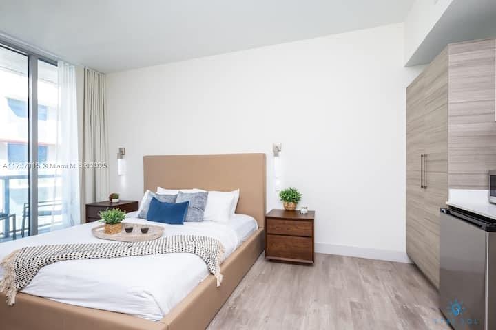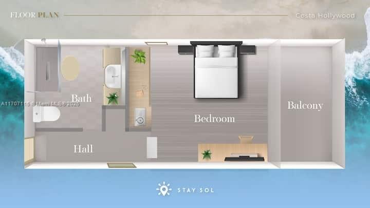 PRICE TO SELL! Beautiful studio with balcony! Fully furnished and equipped in a luxury Condo Hotel with partial Ocean/Bay views. Just steps from Hollywood Boardwalk with many restaurants, bakery, shops, sports. Amazing rooftop with bar, pool, jacuzzi, lounge areas and spectacular views of the City, Intracoastal and Beach. NO RENTAL RESTRICTIONS! Association fee includes Cable TV, Internet, water, gym, Electric, facilities, amenities. Unit management by Stay Sol. Don't miss the opportunity to live in paradise!!!