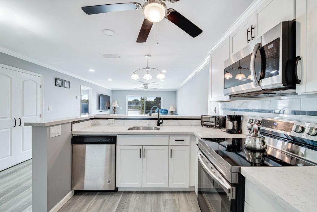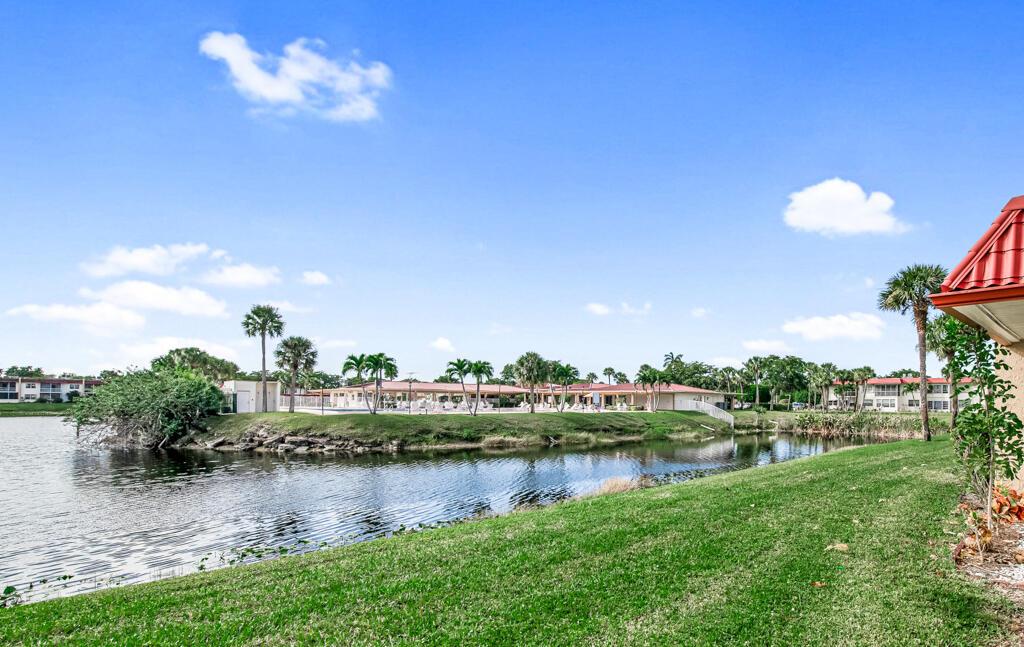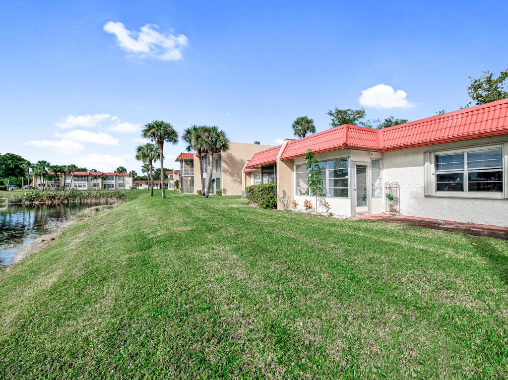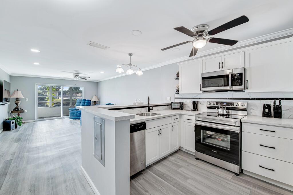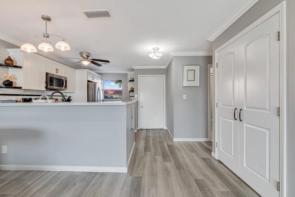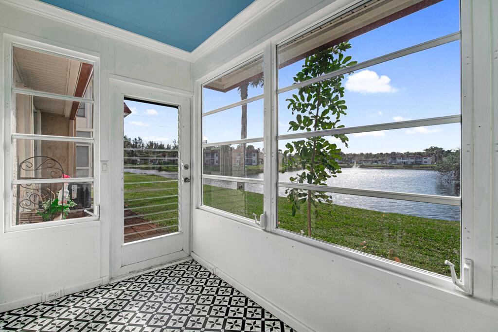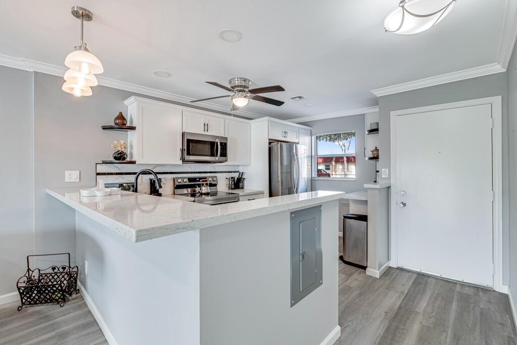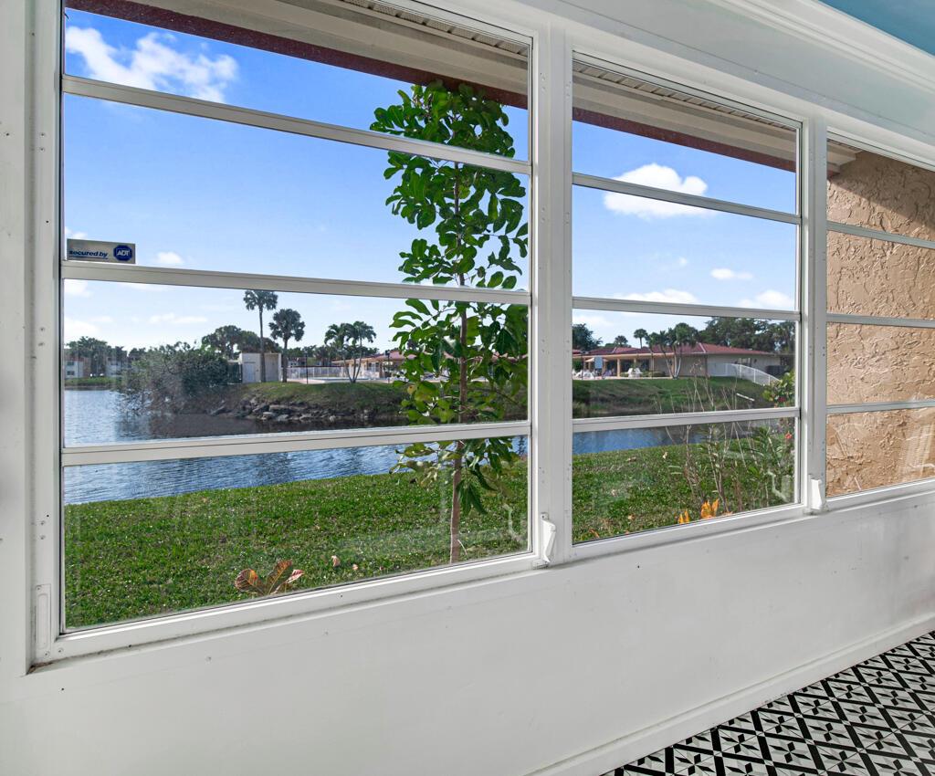 Completely remodeled waterfront villa in the gated community of Golden Lakes! Move-in ready with laminate floors throughout living areas and bdrms. The upgraded kitchen features quartz counters, tile backsplash, and stainless steel appliances. A/C and water heater approx. 4 yrs old. Includes a private laundry rm with full-size W/D and accordion shutters for hurricane protection. Imagine enjoying your morning coffee or reading in the FL room while taking in serene lake and clubhouse views. Conveniently located near shopping and dining. Amenities include clubhouse, 24-hr security, cable, water, and high-speed internet starting in Jan--all with a low monthly HOA fee.
