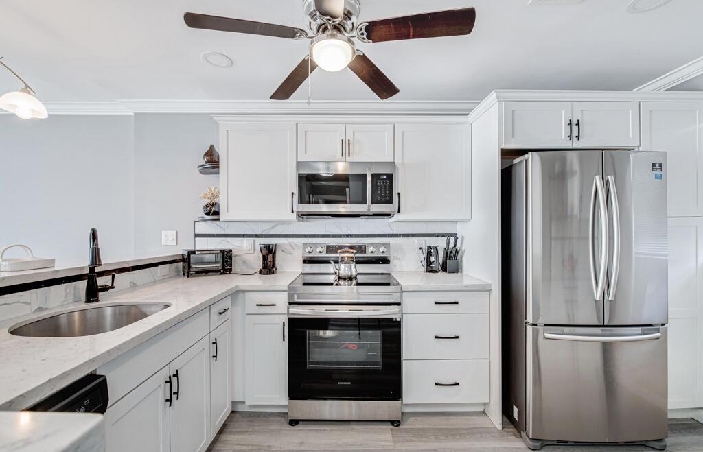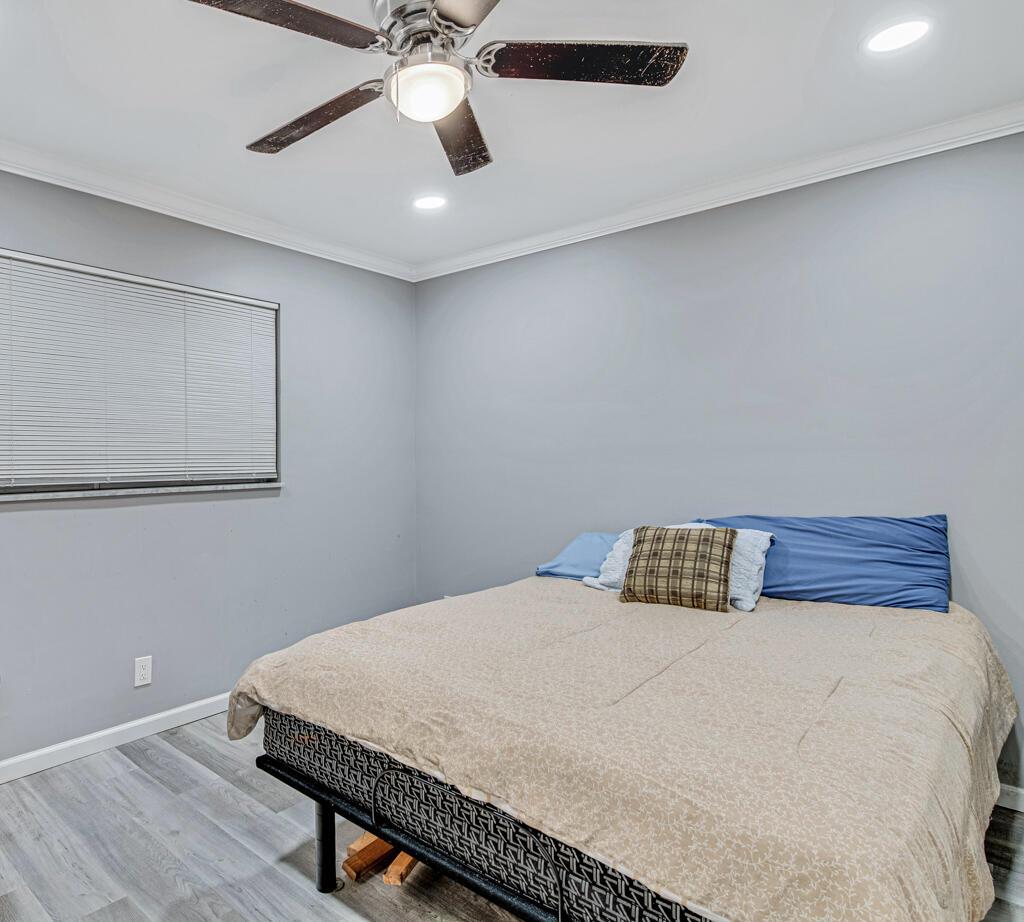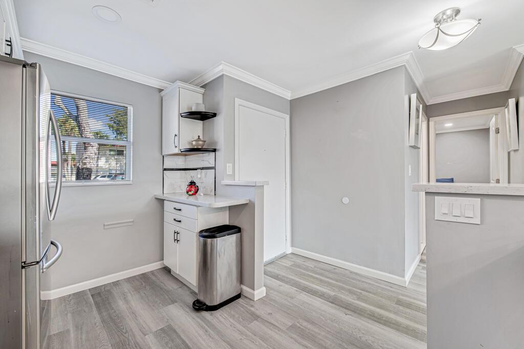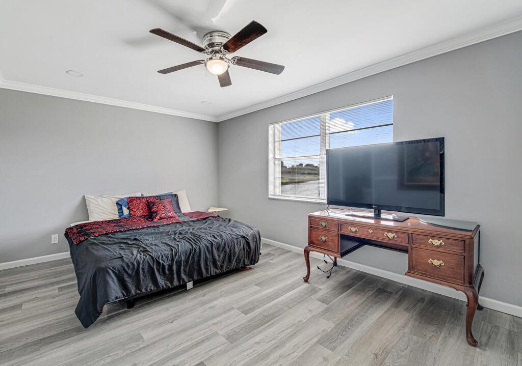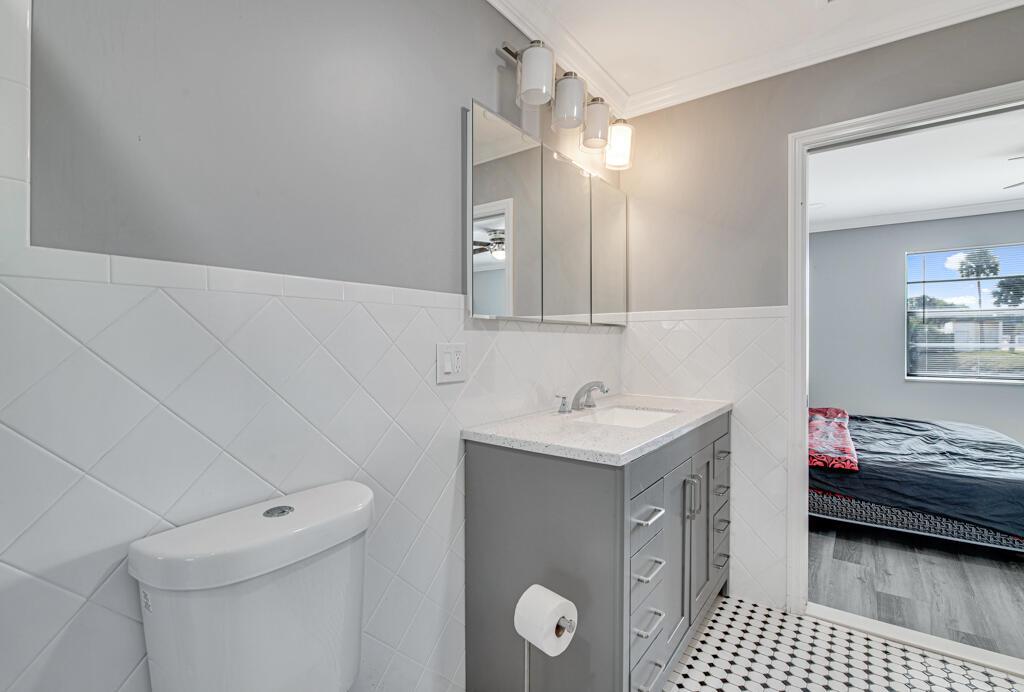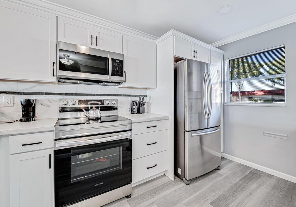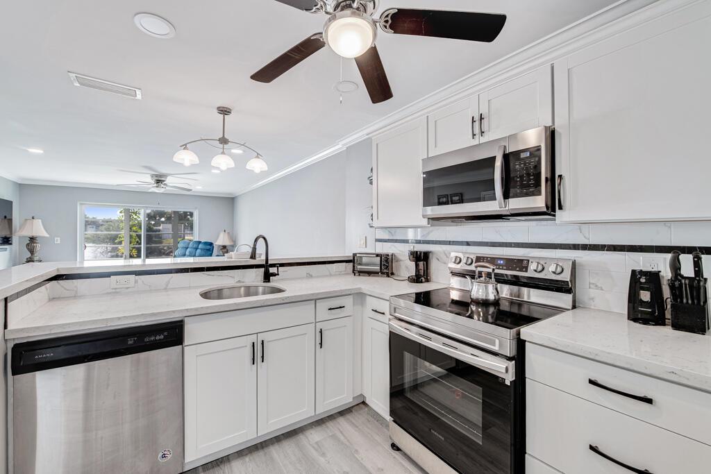 Completely remodeled waterfront villa in the gated community of Golden Lakes! Move-in ready with laminate floors throughout living areas and bdrms. The upgraded kitchen features quartz counters, tile backsplash, and stainless steel appliances. A/C and water heater approx. 4 yrs old. Includes a private laundry rm with full-size W/D and accordion shutters for hurricane protection. Imagine enjoying your morning coffee or reading in the FL room while taking in serene lake and clubhouse views. Conveniently located near shopping and dining. Amenities include clubhouse, 24-hr security, cable, water, and high-speed internet starting in Jan--all with a low monthly HOA fee.