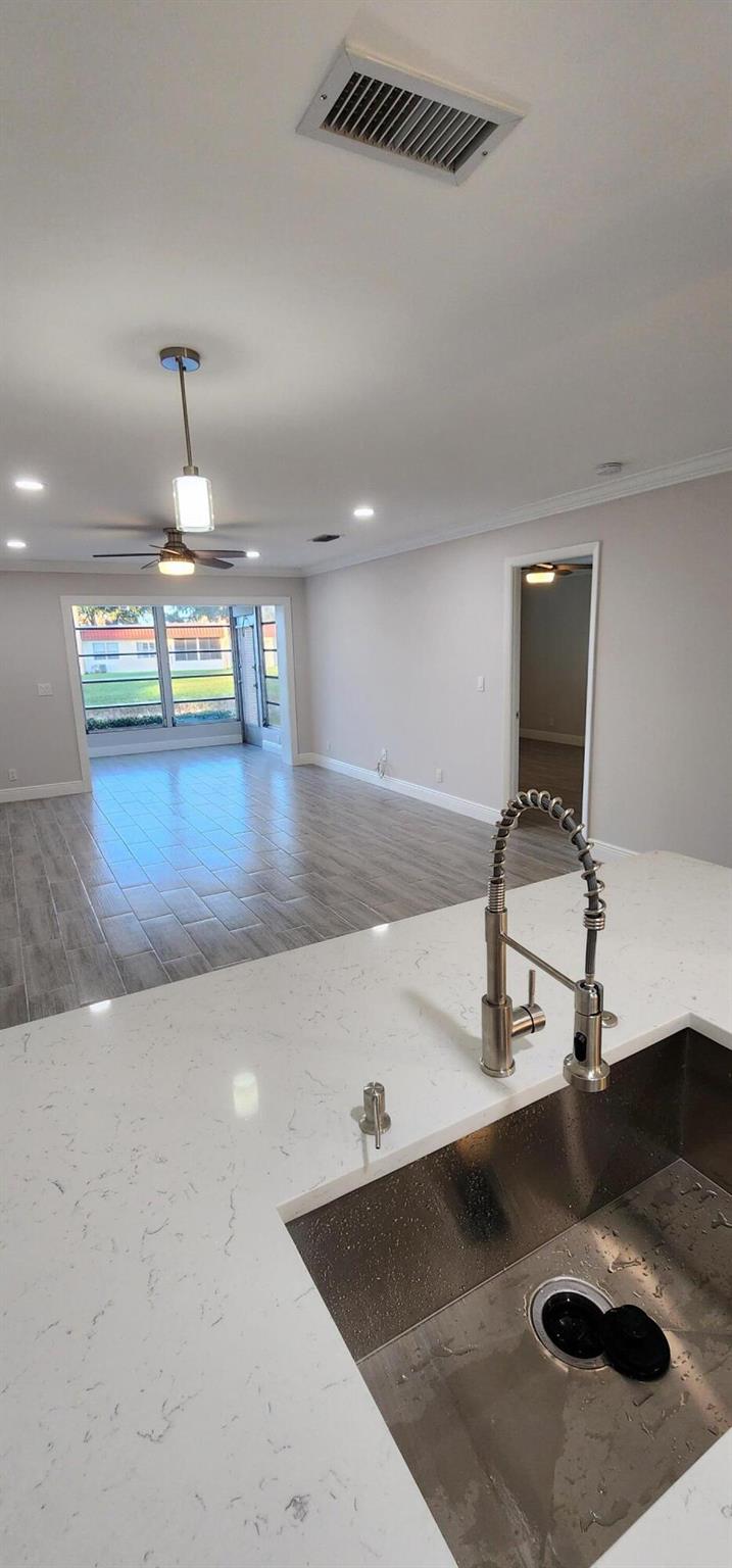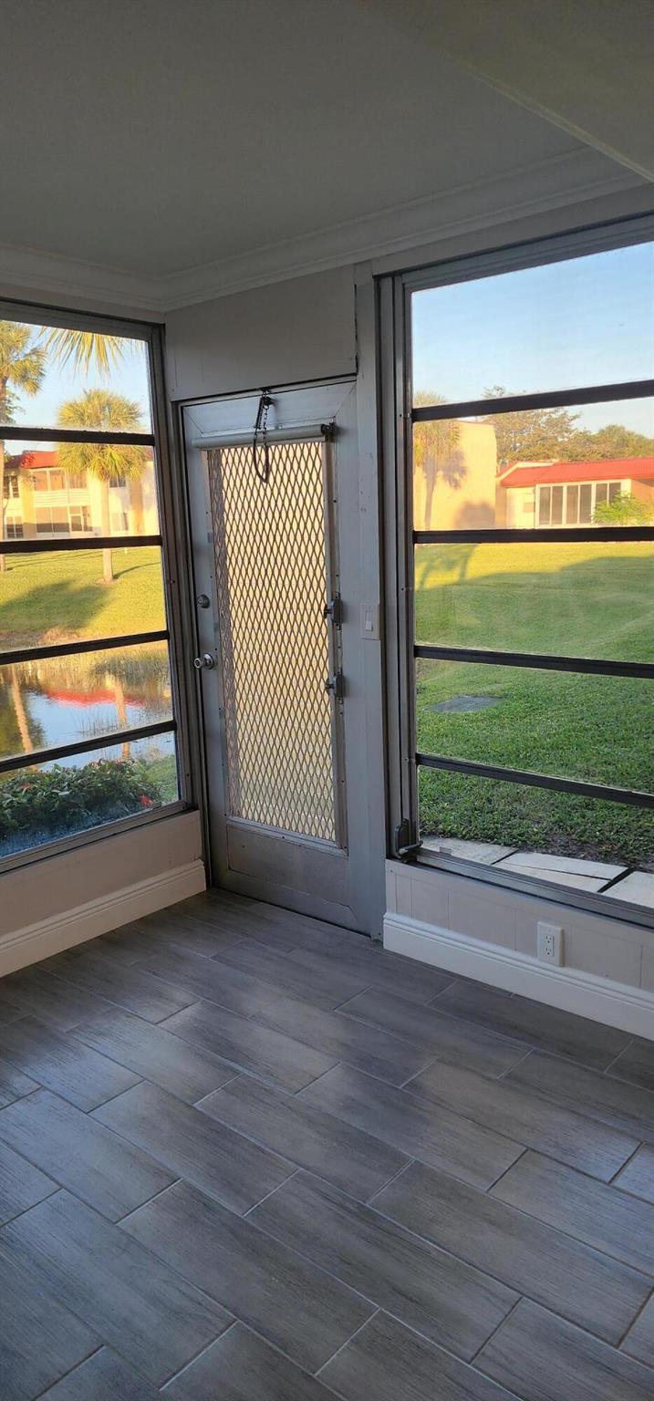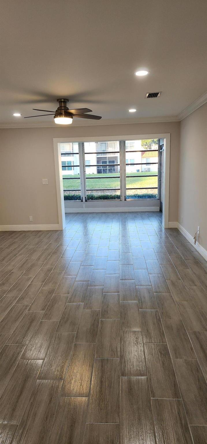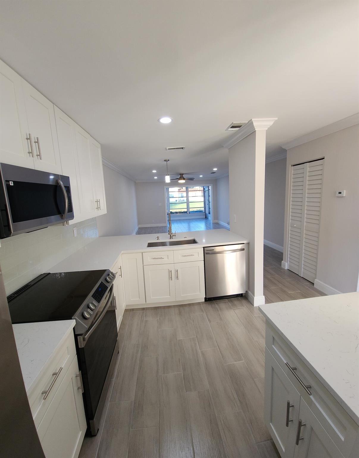 This villa has been totally renovated with a fresh modern look and feel. This villa offers ceramic tile flooring throughout the unit. Beautiful white wooden kitchen cabinets/Quartz countertop. New stainless steel kitchen appliances. The bathrooms have the latetest fixtures and barn glass doors. Hurricane impact windows throughout the unit and Hurricane shutters for the porch. Relax with a peaceful lake view from the porch. This villa is centrally located to restaurants, shopping, and Florida's Turnpike. A Courtesy bus is scheduled twice a week to transport residents for their shopping needs. The Community also offers a full time Social Director to coordinate resident activities. This gated community has 24 hour manned security. Come see it for yourself and start living the Florida Life!