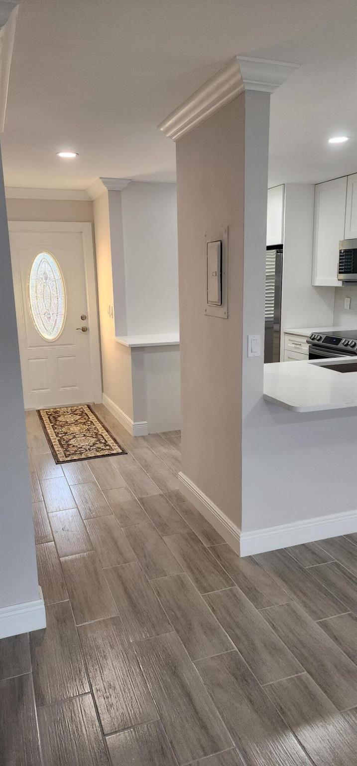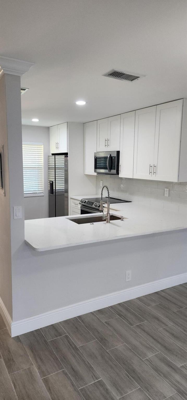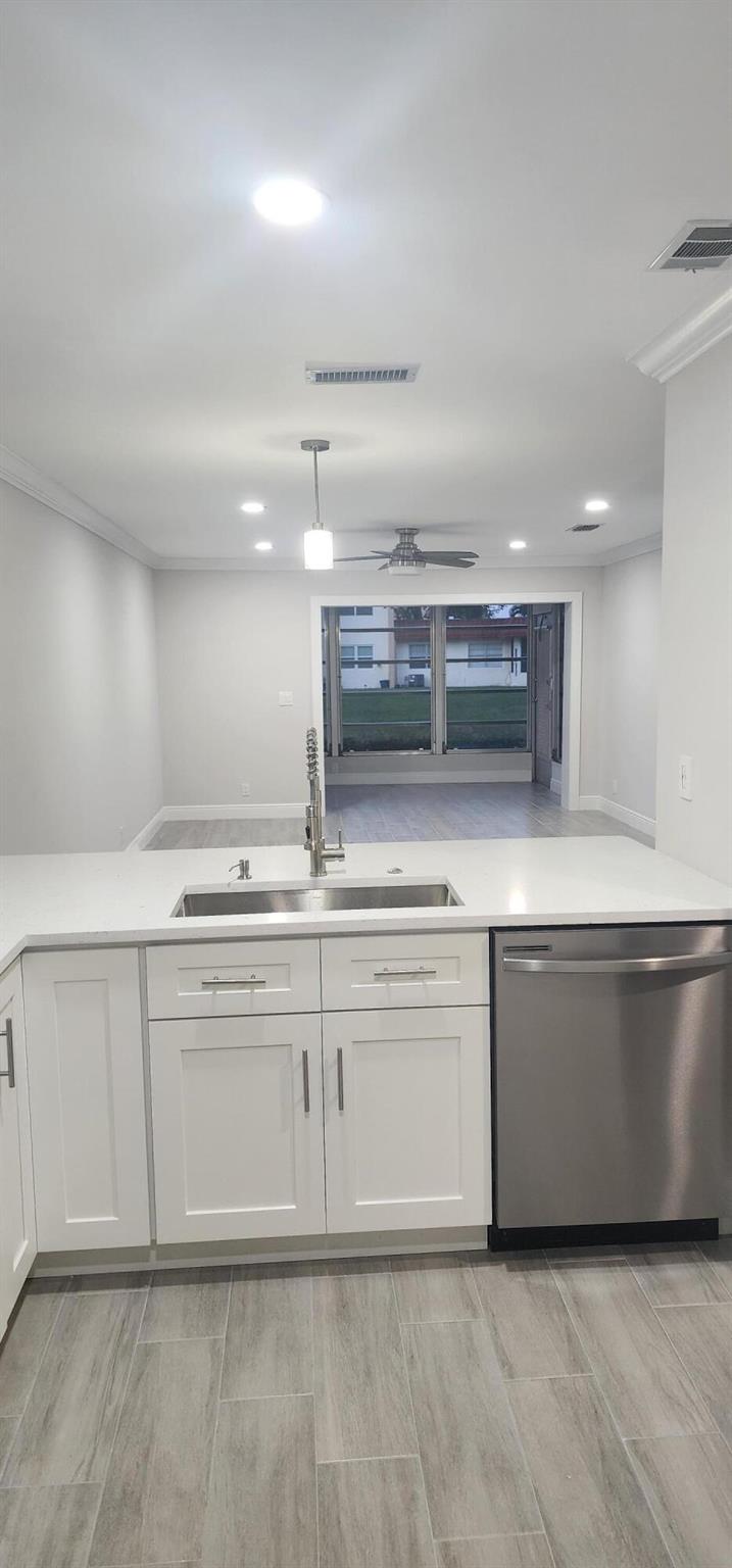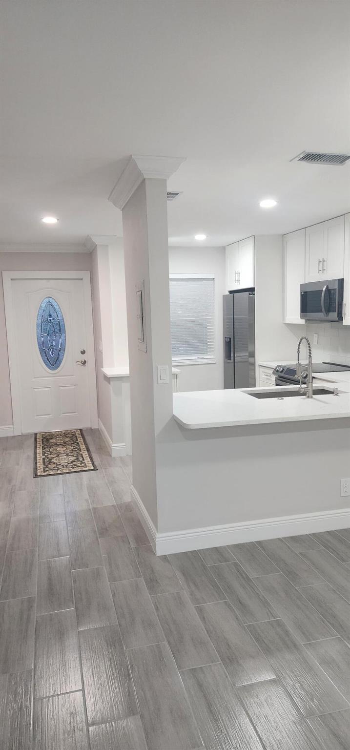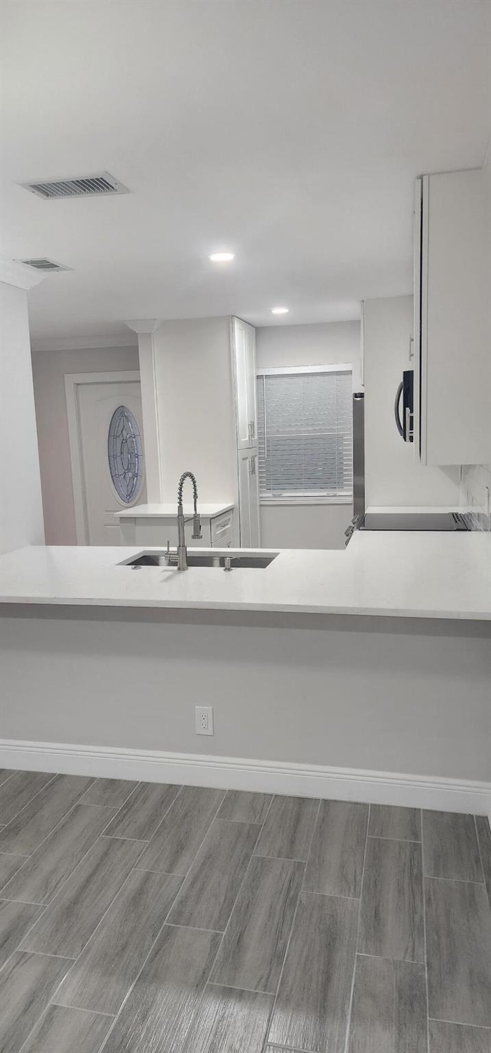 This villa has been totally renovated with a fresh modern look and feel. This villa offers ceramic tile flooring throughout the unit. Beautiful white wooden kitchen cabinets/Quartz countertop. New stainless steel kitchen appliances. The bathrooms have the latetest fixtures and barn glass doors. Hurricane impact windows throughout the unit and Hurricane shutters for the porch. Relax with a peaceful lake view from the porch. This villa is centrally located to restaurants, shopping, and Florida's Turnpike. A Courtesy bus is scheduled twice a week to transport residents for their shopping needs. The Community also offers a full time Social Director to coordinate resident activities. This gated community has 24 hour manned security. Come see it for yourself and start living the Florida Life!