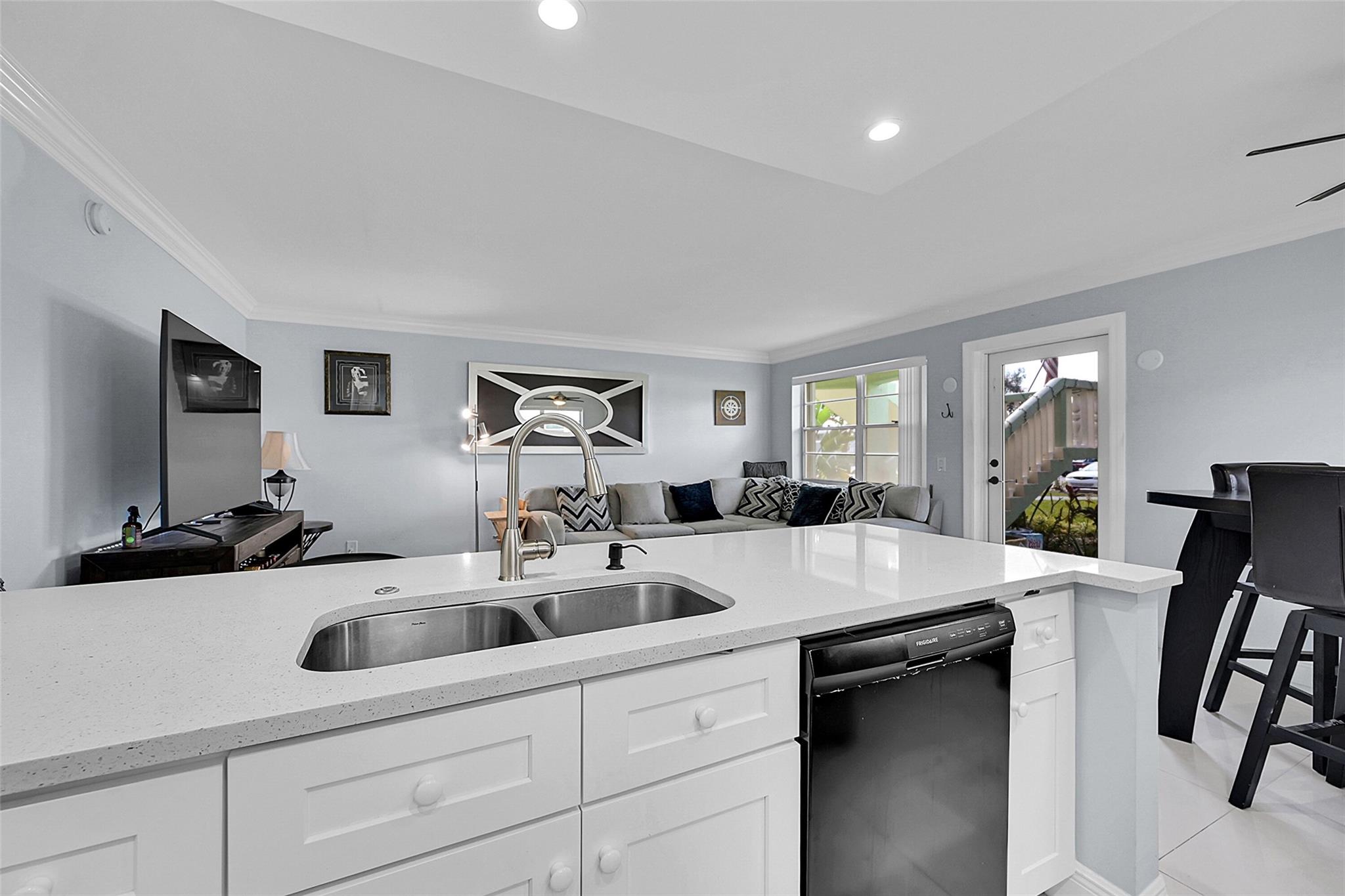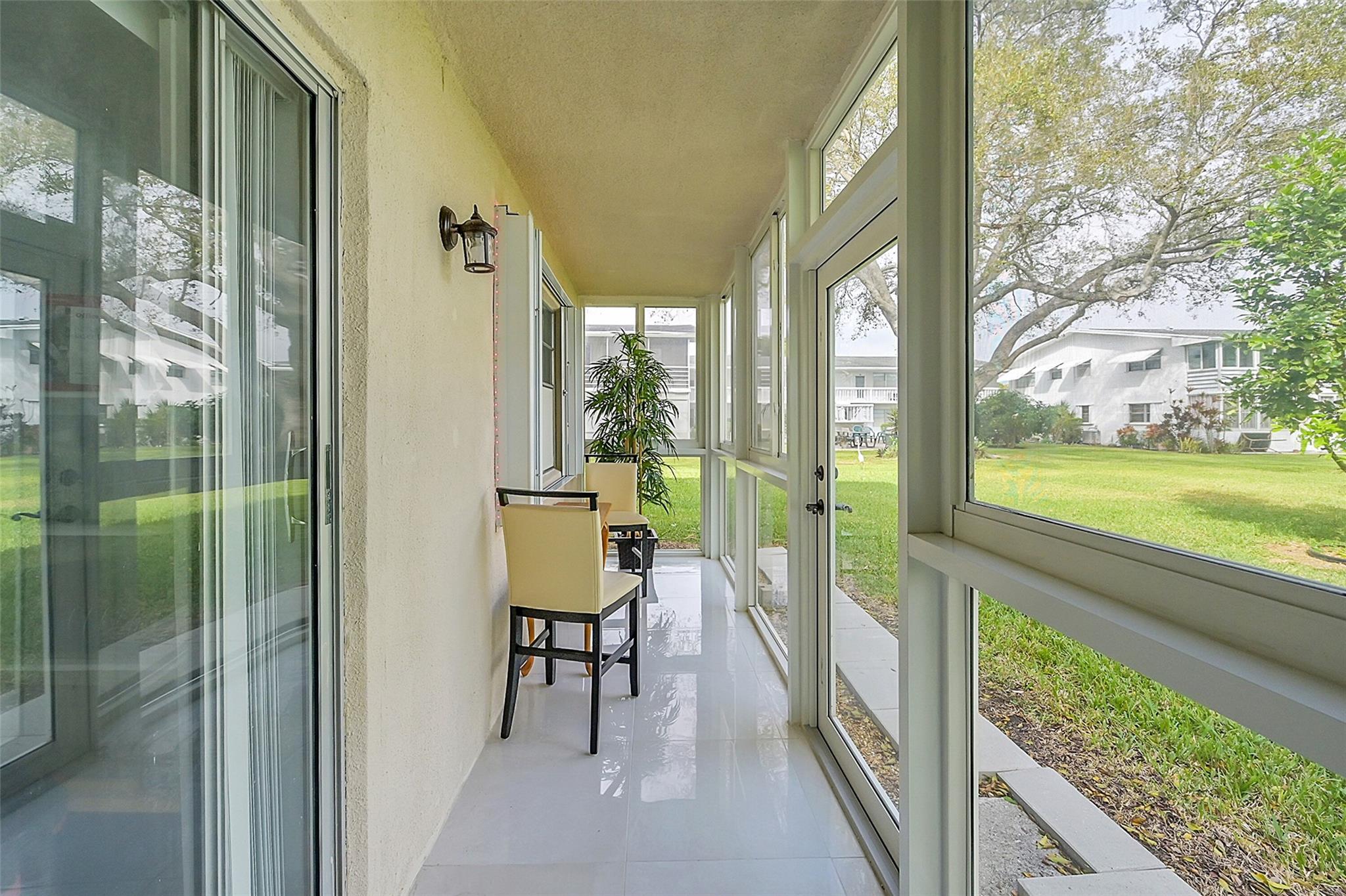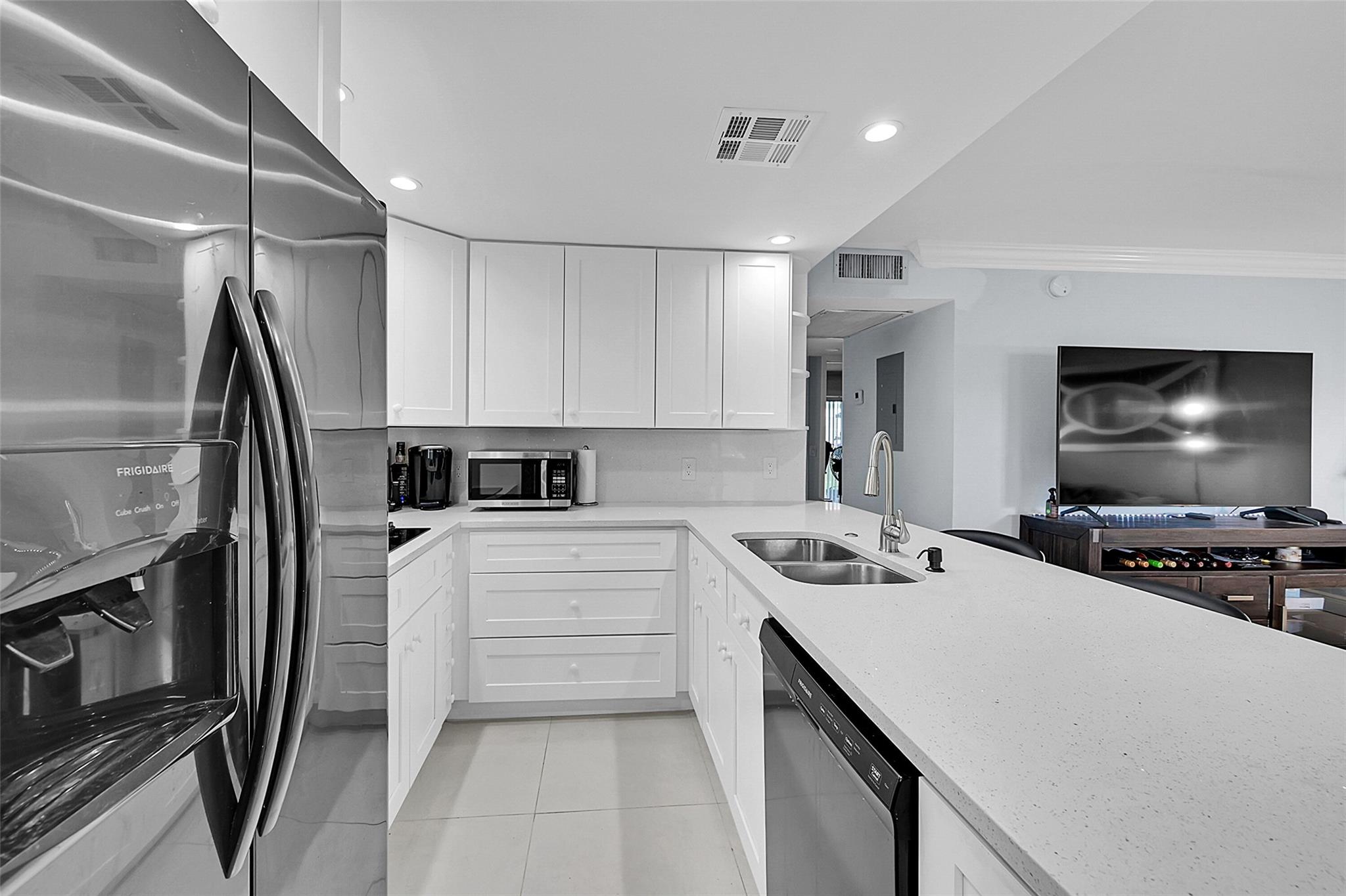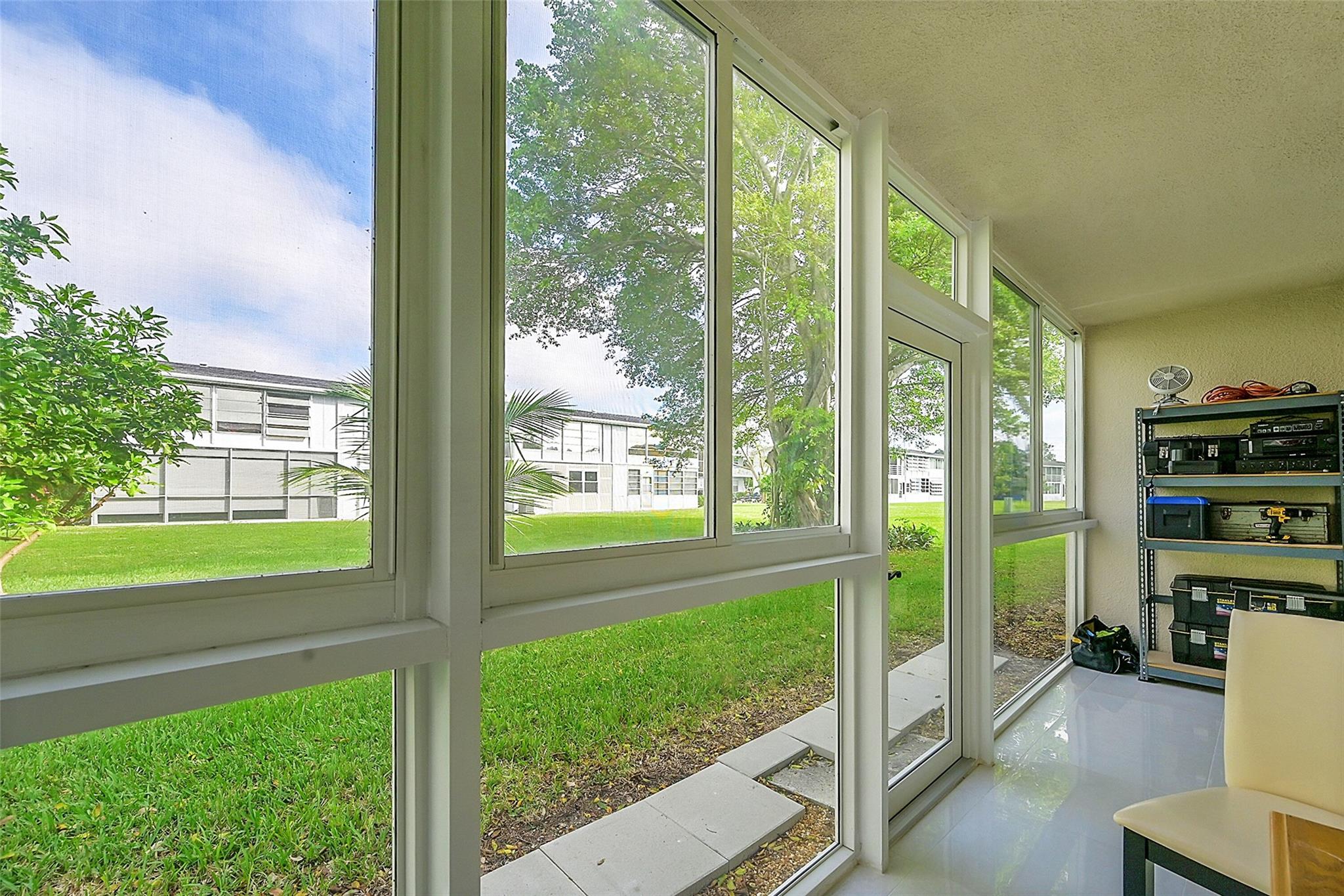 Fully renovated beautiful, ground floor corner unit. Open living concept with tastefully update kitchen with quartz countertops, black stainless refrigerator & dishwasher, induction stove top. New white tile flooring through-out including sunroom. Designer, updated bathrooms. Hurricane impact windows & doors, and accordion shutters on the windows. This 2-bedroom, 1.5-bathroom home offers incredible community amenities, including 16 heated pools (1 indoor), tennis, pickleball, volleyball, bocce ball, shuffleboard, community bus, and more. Barbecue area with a gazebo & dance floor, plus a 145,000 sq. ft. million dollar clubhouse with a theater, fitness center, billiards, library, arts studios, and social spaces. This 55+ community is perfect for Florida living!