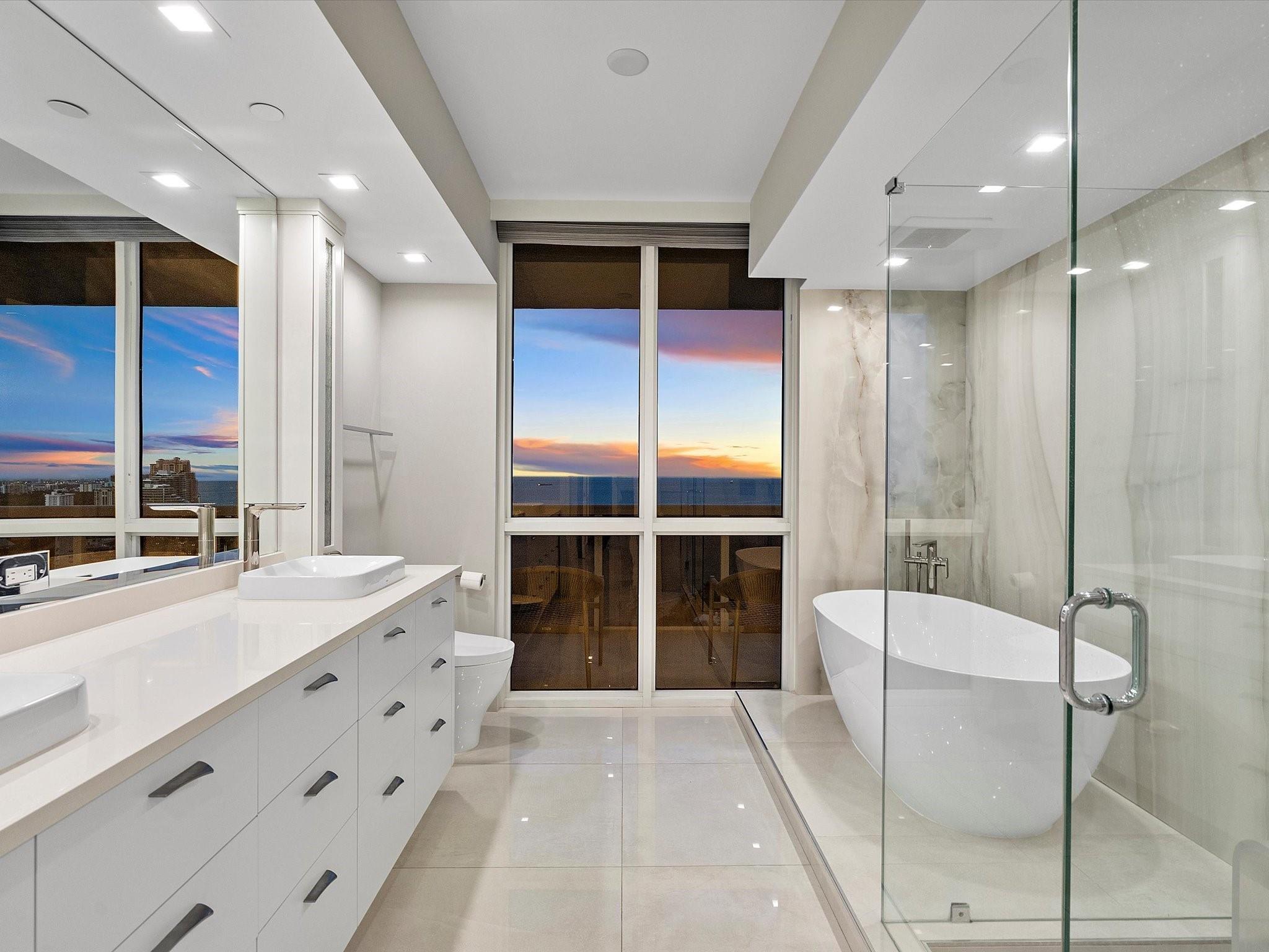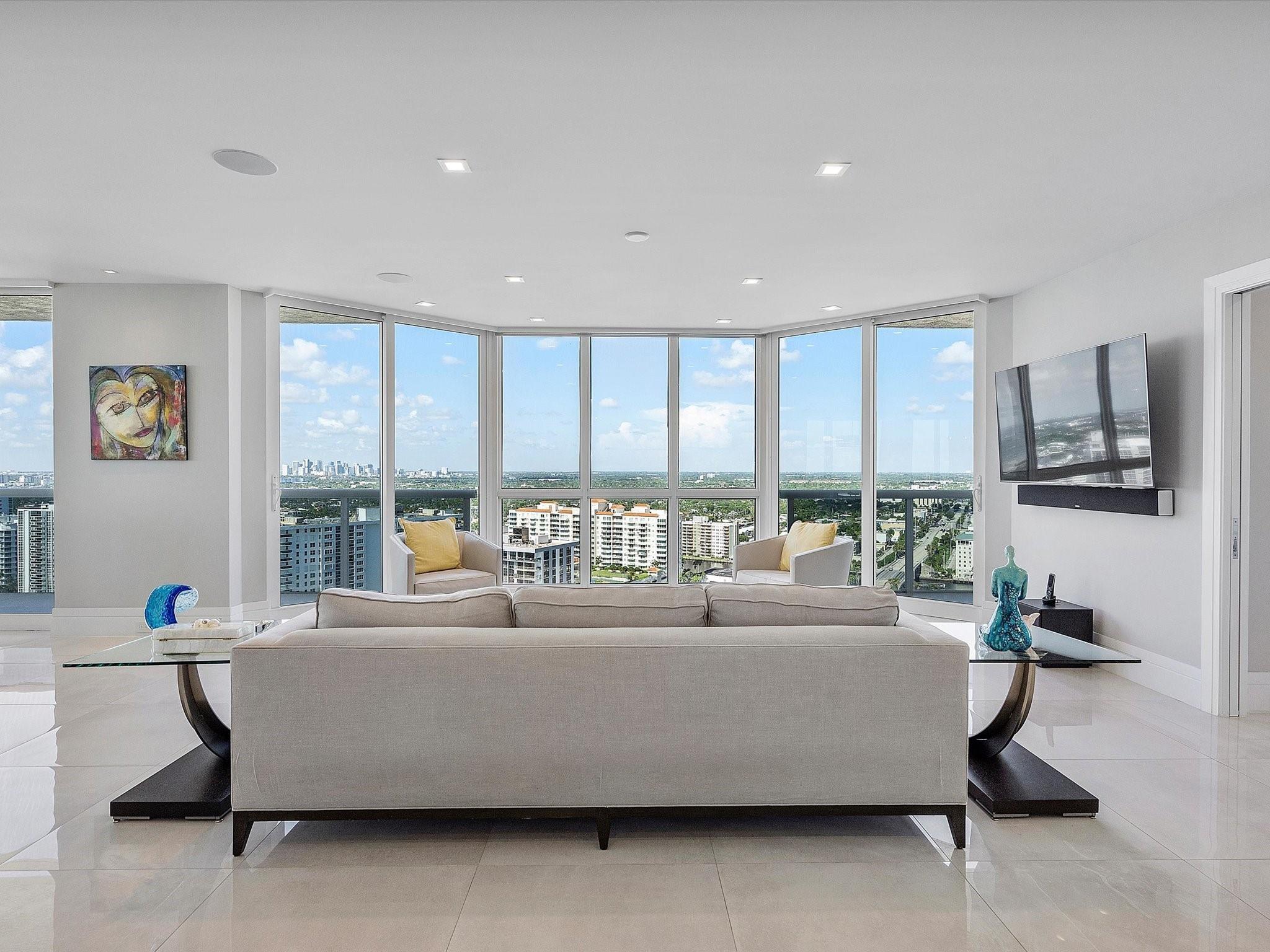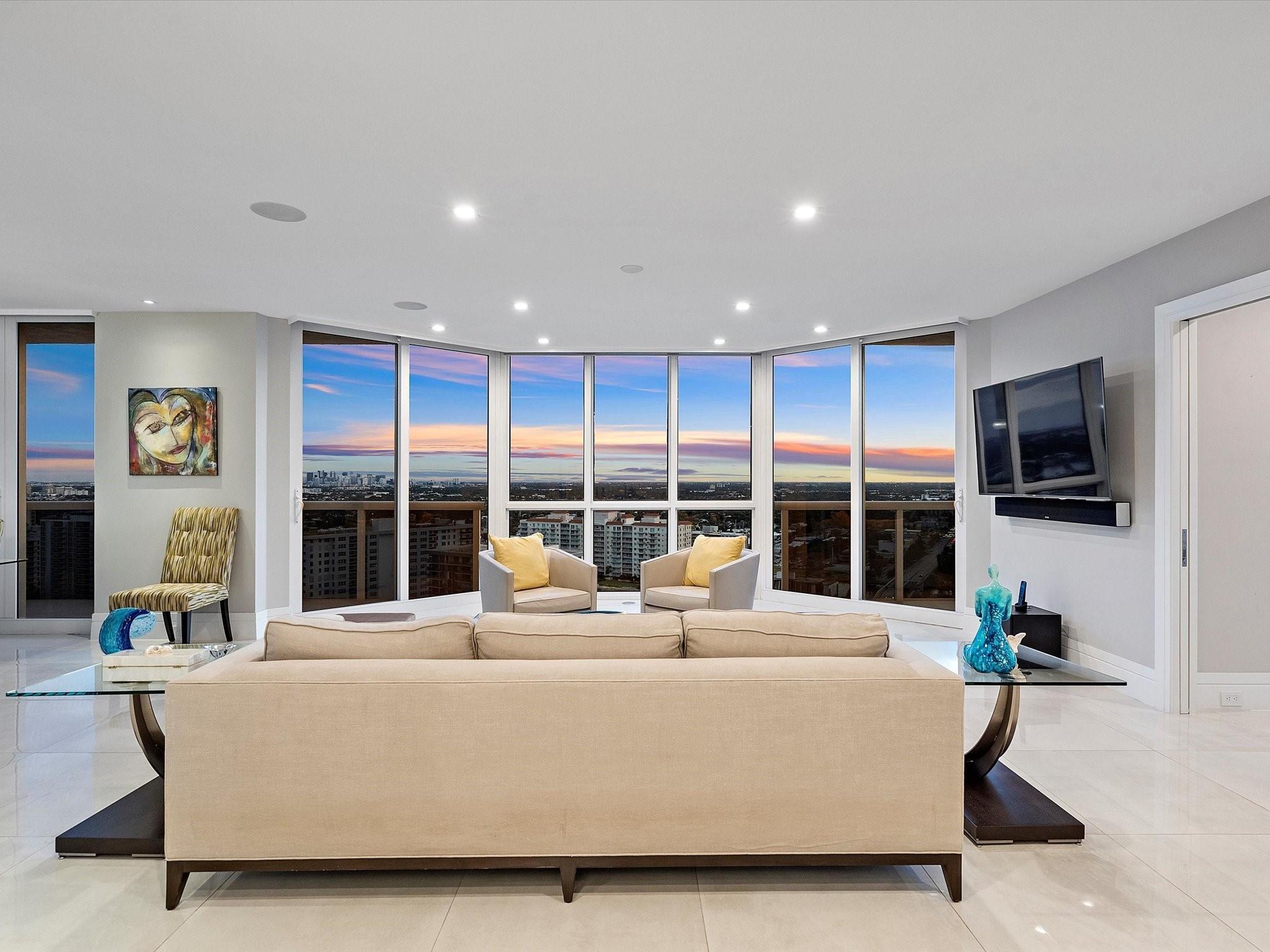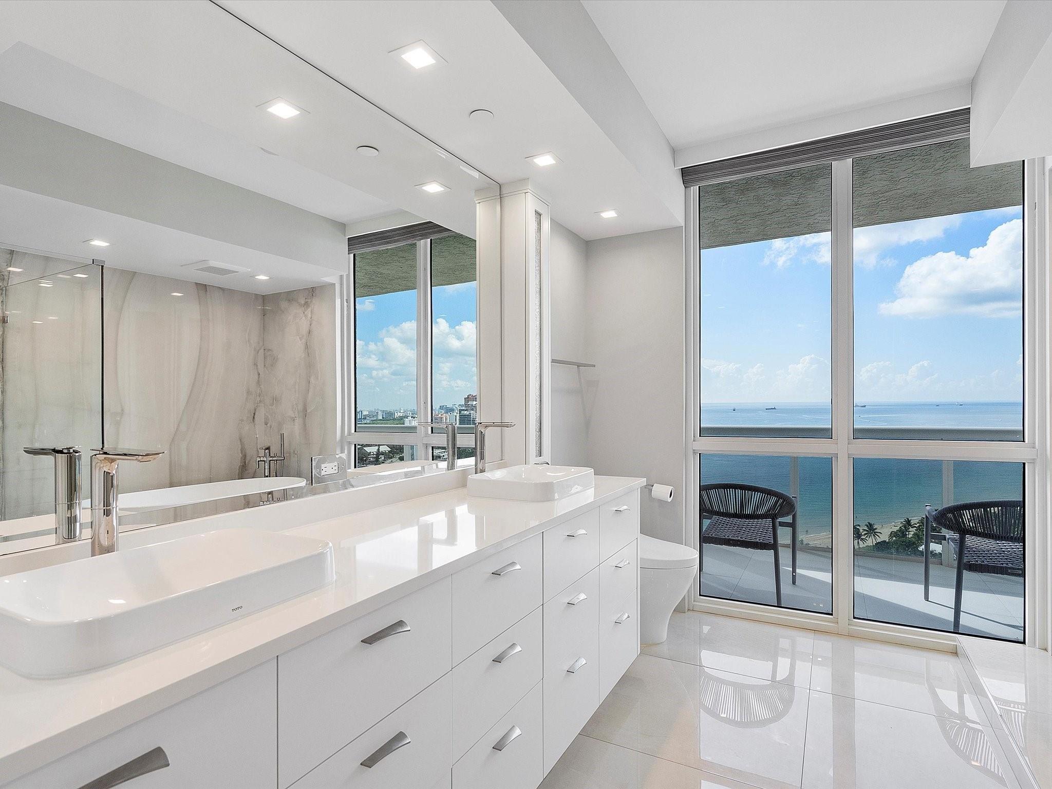 Enjoy breathtaking direct ocean, coastline, Intracoastal, and downtown views from every angle in this stunning high-floor double-corner unit at the Carlyle in L'Hermitage. This meticulously renovated residence offers a sophisticated blend of luxury and modern convenience, featuring high-impact windows, porcelain flooring, and an open-concept kitchen with top-tier cabinetry and appliances. The design layout includes extra closet space, a spacious laundry room, a den/third bedroom, and two expansive patio decks perfect for entertaining or relaxing. The unit also boasts private elevators, elegant glass front doors, a new A/C and water heater, a surround sound system, a smart thermostat, a smart lighting system, and a water filtration system. Pre-plumbing for wet bar in living room provided.