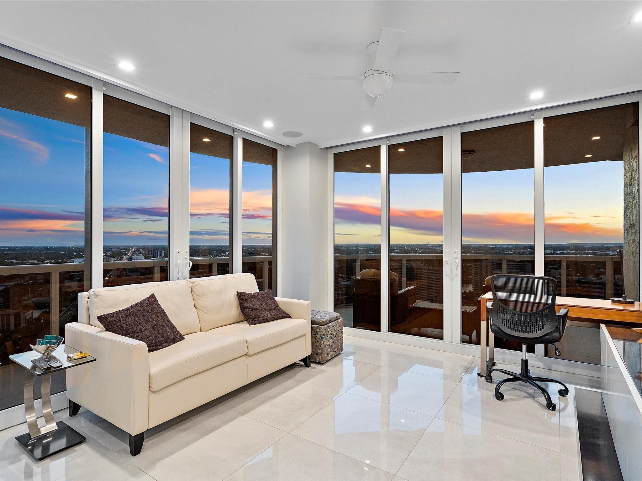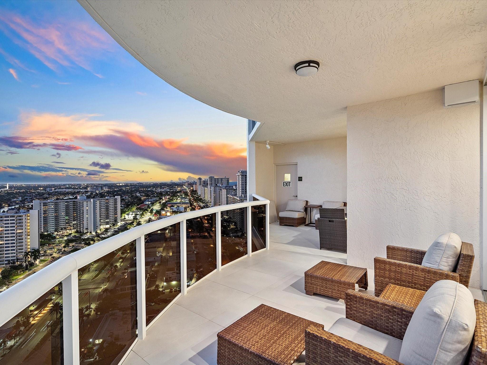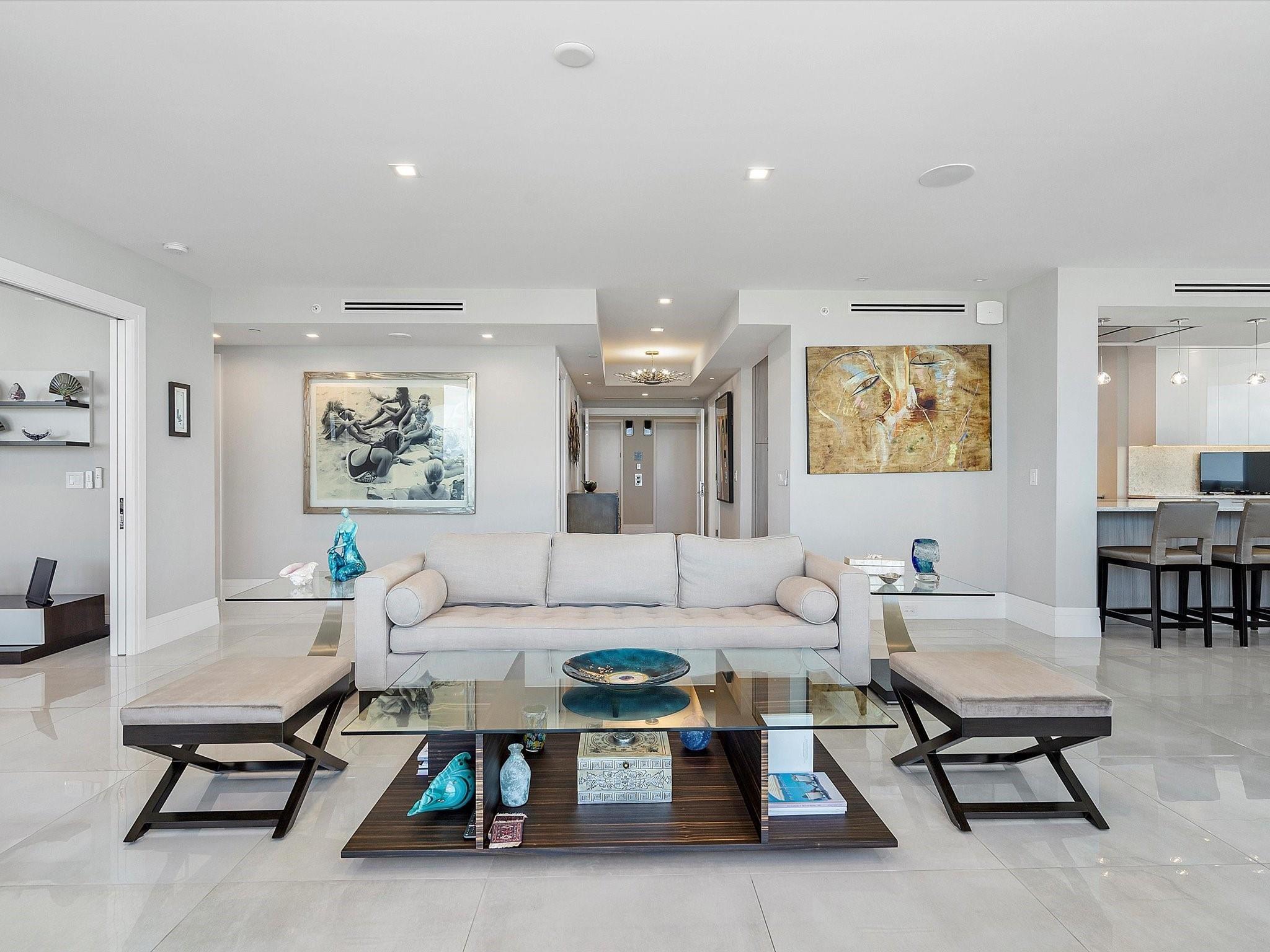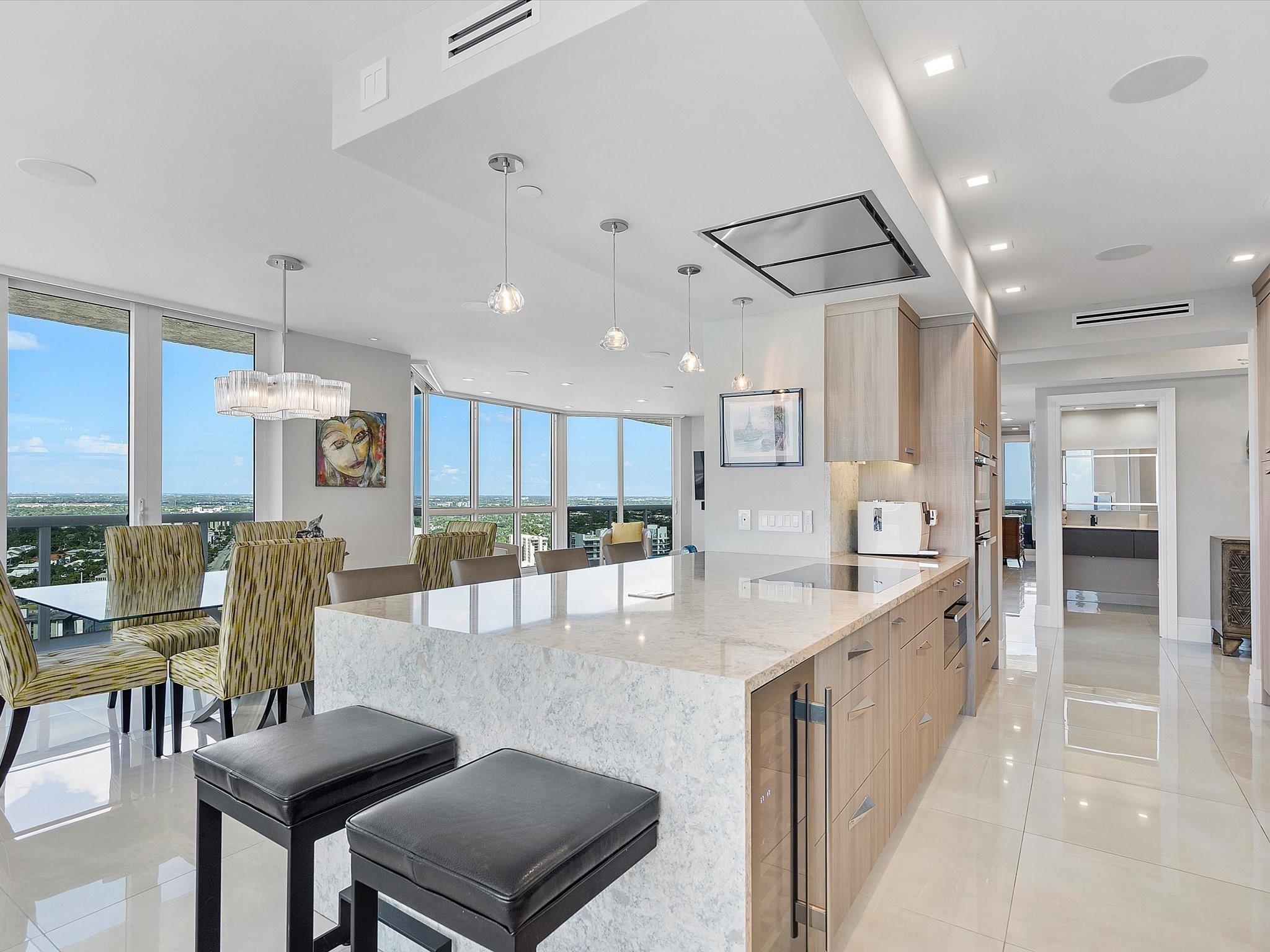 Enjoy breathtaking direct ocean, coastline, Intracoastal, and downtown views from every angle in this stunning high-floor double-corner unit at the Carlyle in L'Hermitage. This meticulously renovated residence offers a sophisticated blend of luxury and modern convenience, featuring high-impact windows, porcelain flooring, and an open-concept kitchen with top-tier cabinetry and appliances. The design layout includes extra closet space, a spacious laundry room, a den/third bedroom, and two expansive patio decks perfect for entertaining or relaxing. The unit also boasts private elevators, elegant glass front doors, a new A/C and water heater, a surround sound system, a smart thermostat, a smart lighting system, and a water filtration system. Pre-plumbing for wet bar in living room provided.