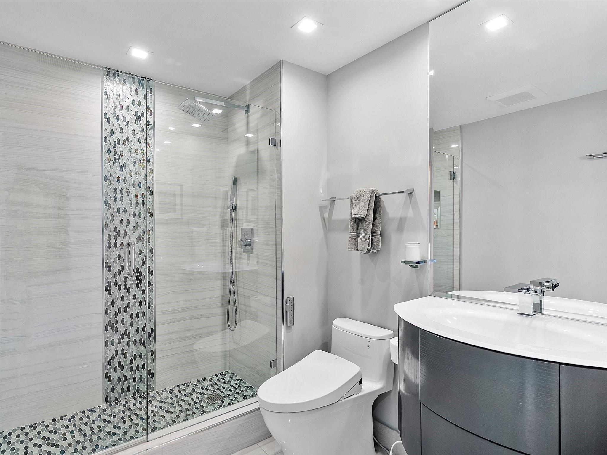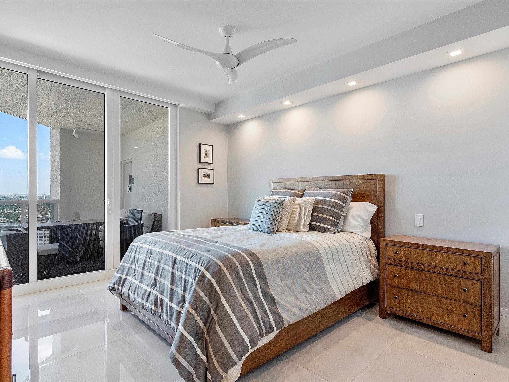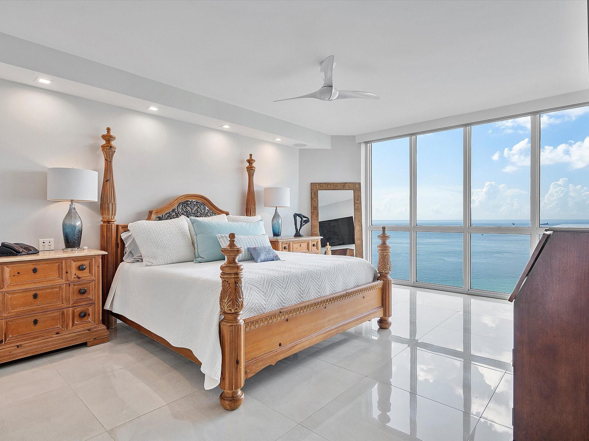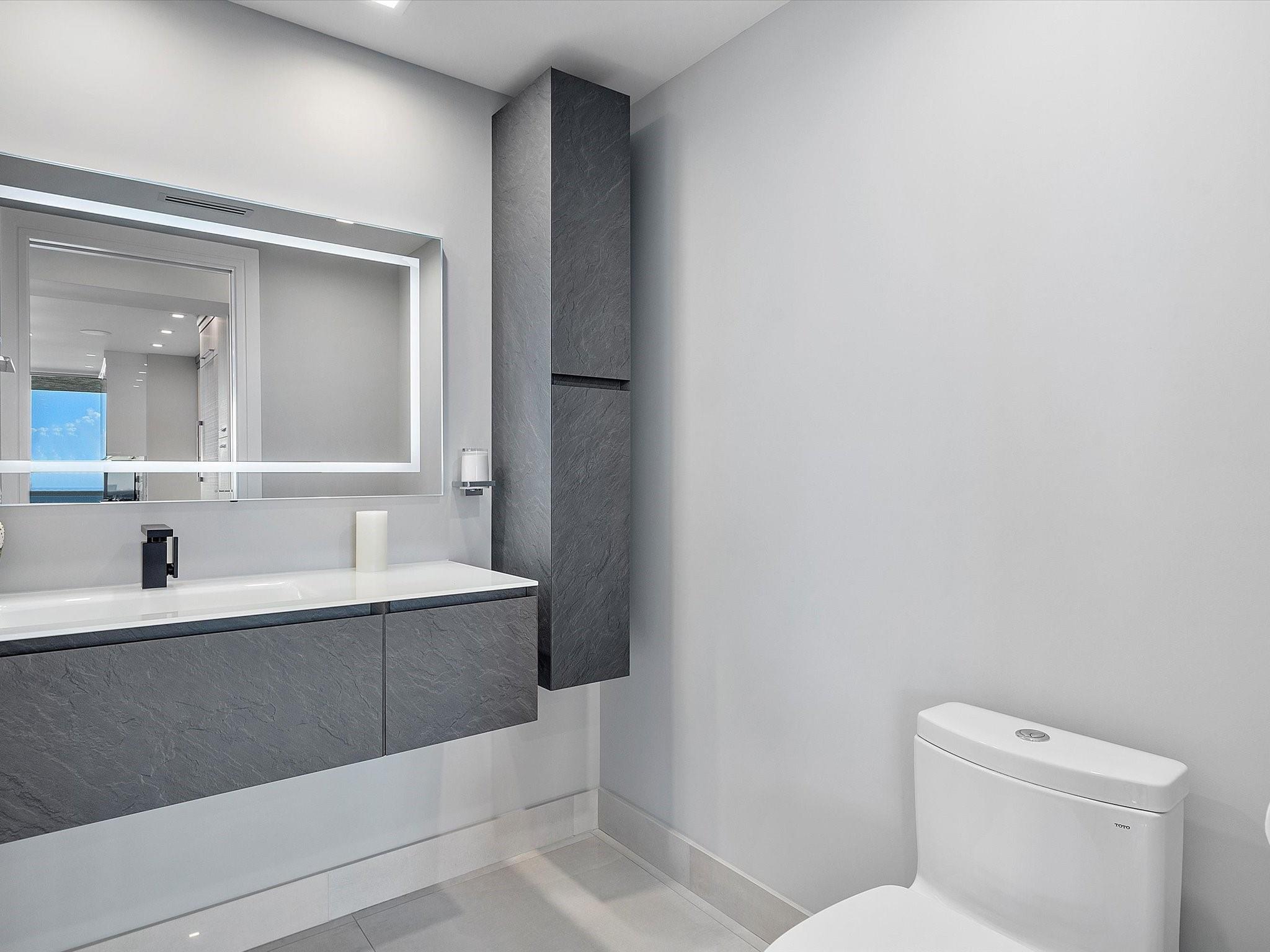 Enjoy breathtaking direct ocean, coastline, Intracoastal, and downtown views from every angle in this stunning high-floor double-corner unit at the Carlyle in L'Hermitage. This meticulously renovated residence offers a sophisticated blend of luxury and modern convenience, featuring high-impact windows, porcelain flooring, and an open-concept kitchen with top-tier cabinetry and appliances. The design layout includes extra closet space, a spacious laundry room, a den/third bedroom, and two expansive patio decks perfect for entertaining or relaxing. The unit also boasts private elevators, elegant glass front doors, a new A/C and water heater, a surround sound system, a smart thermostat, a smart lighting system, and a water filtration system. Pre-plumbing for wet bar in living room provided.