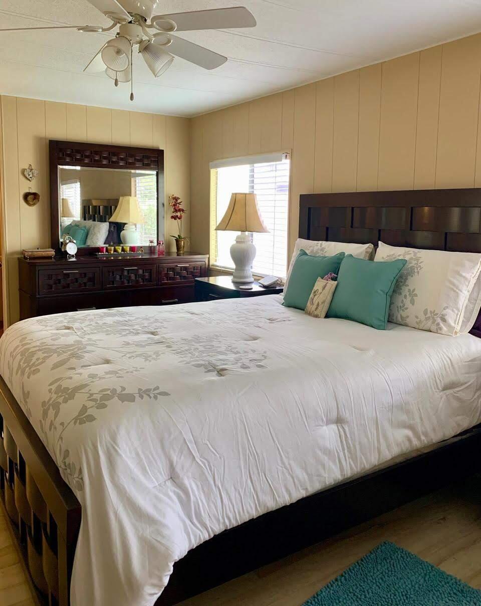 DOUBLE WIDE, 2 Bed/2 Bath Turn-key, Beautifully FURNISHED home in active 55+ community. Open to all offers. Den doubles as an extra room/office/living room! Well-maintained! 2019 ROOF, 2018 AC, 2023 VENTS, 2025 POWER WASHED & PAINTED DRIVEWAY, & Kitchen FLOOR REPLACED! Nestled in a warm, welcoming neighborhood, this home offers a true community. Neighbors are like family, hosting parades, dances & dinners while always looking out for one another. Enjoy a close-knit street where friendships flourish & social events unite.PRIME location; 15 min to beach but NO FLOOD ZONE, close to grocery, bank,pharmacy,grocery,postal,& more! Lot lease of 899.25 includes lawn care, trash,free private golf course,heated pool, gym,cards, pickleball, tennis, bocce & more!