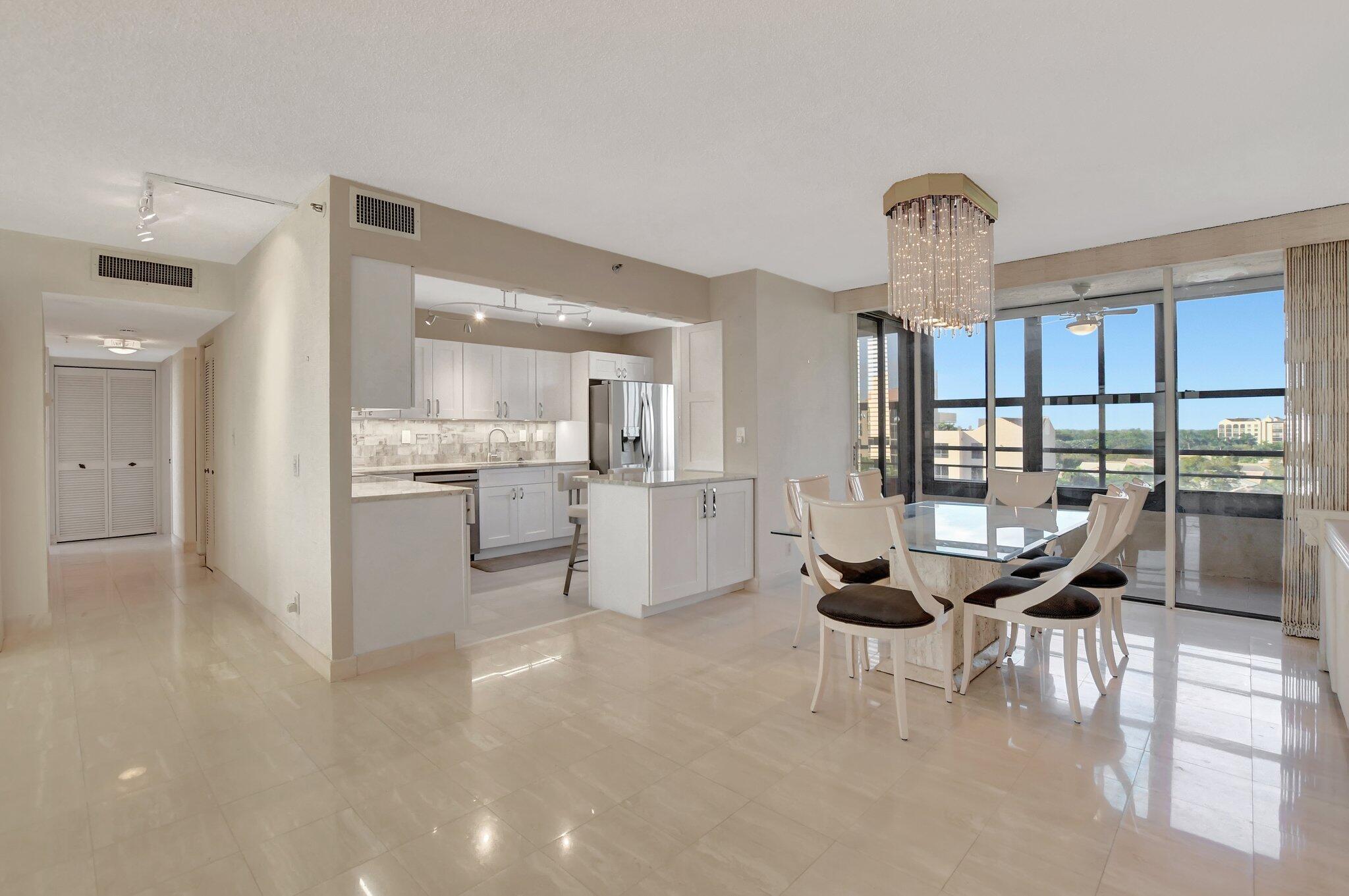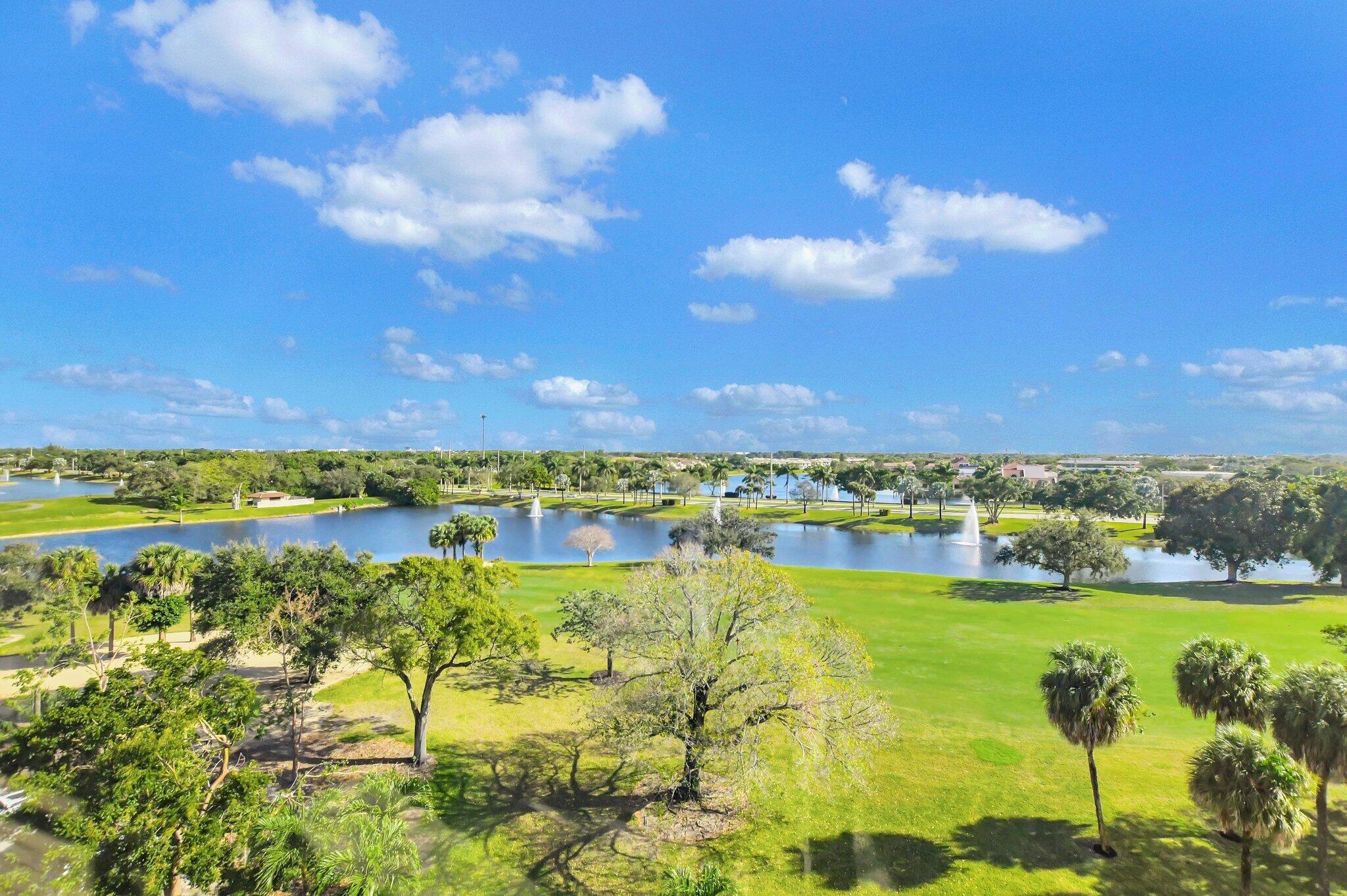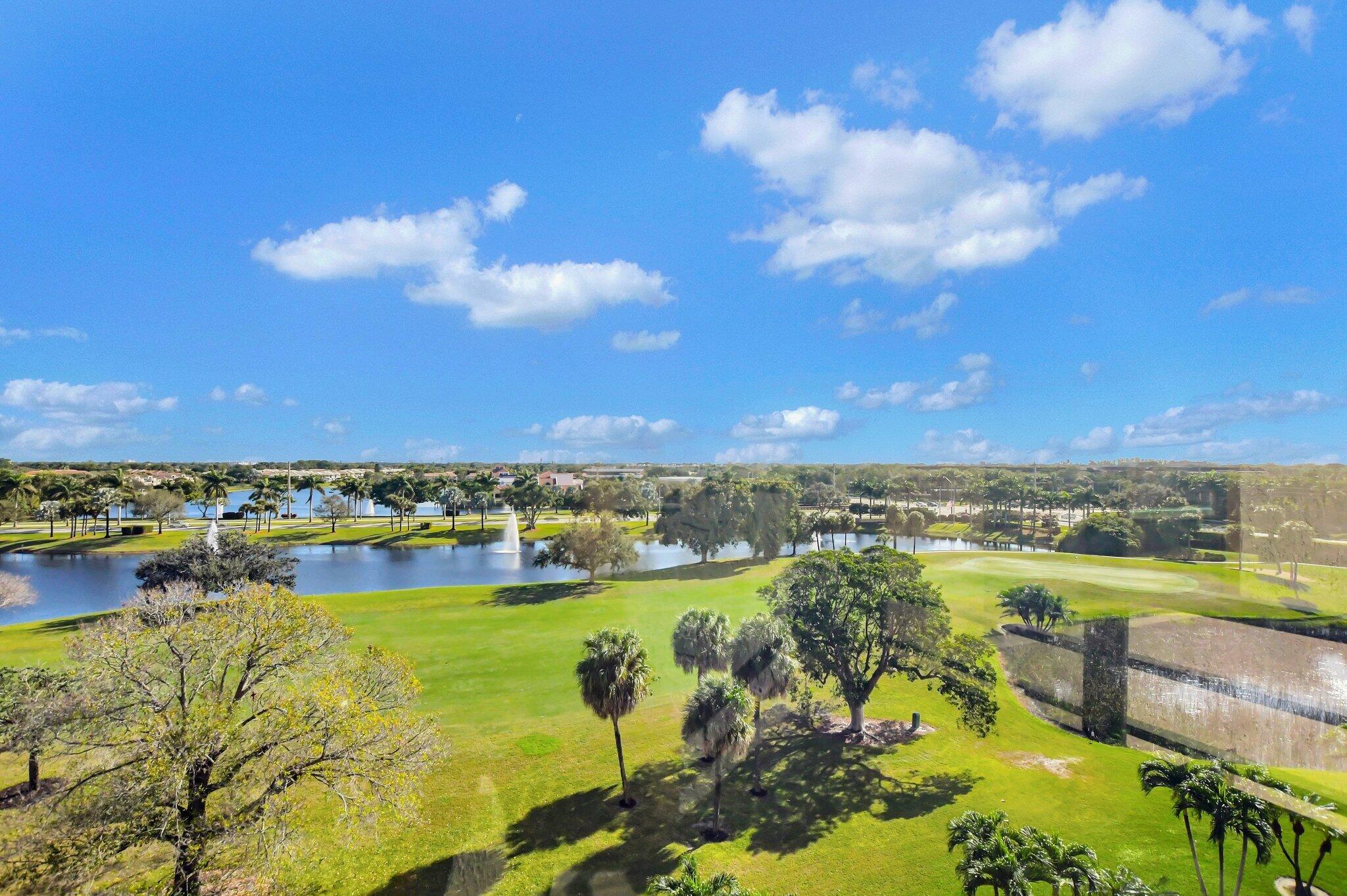 Highly desirable Brittany model on a high floor with stunning golf and water views now available in Promenade at Boca Pointe! The open kitchen has been beautifully updated with white cabinets, stainless steel appliances, custom counters, and a stylish backsplash. Both patios are glass-enclosed, with hurricane glass on the back patio and a storage closet. Marble floors adorn the living areas, while the bedrooms feature cozy carpet. Recent updates include A/C and water heater replacements within the last 5 years. The spacious primary suite offers a large walk-in closet and an additional storage closet. Additional features include plantation shutters, a half bath, an open den or 3rd bedroom, and one assigned covered parking space. Enjoy the community pool, clubhouse, and on-site manager!