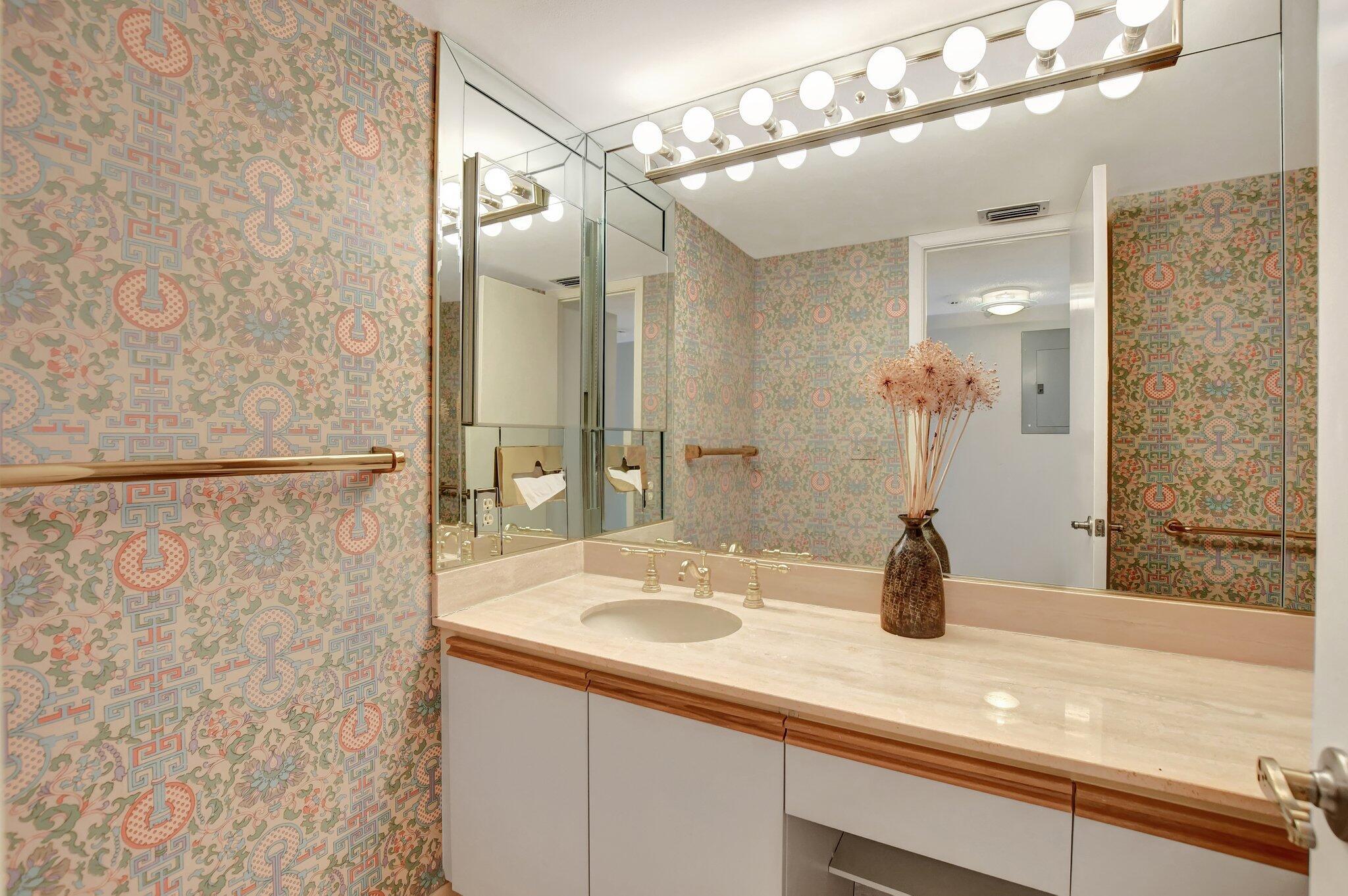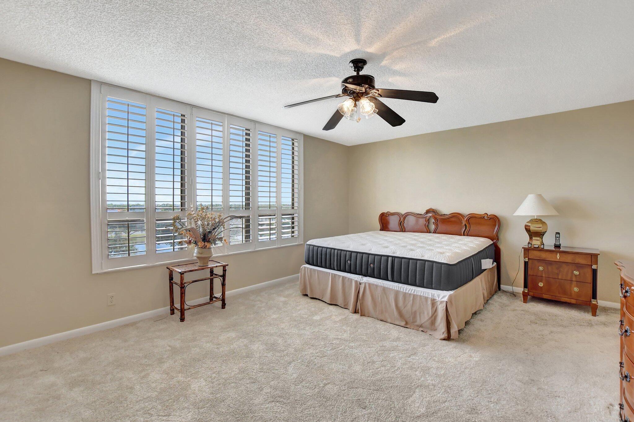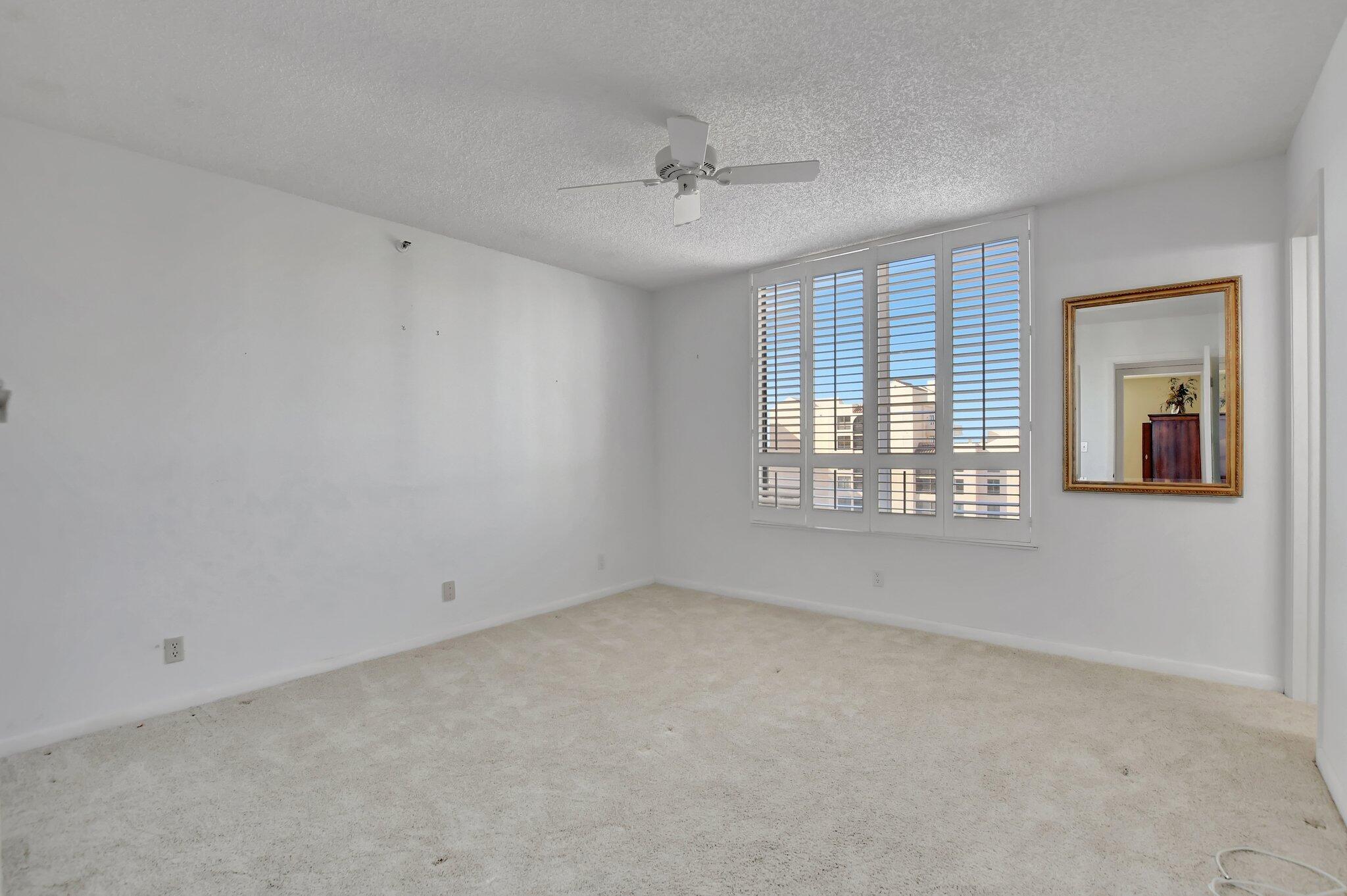 Highly desirable Brittany model on a high floor with stunning golf and water views now available in Promenade at Boca Pointe! The open kitchen has been beautifully updated with white cabinets, stainless steel appliances, custom counters, and a stylish backsplash. Both patios are glass-enclosed, with hurricane glass on the back patio and a storage closet. Marble floors adorn the living areas, while the bedrooms feature cozy carpet. Recent updates include A/C and water heater replacements within the last 5 years. The spacious primary suite offers a large walk-in closet and an additional storage closet. Additional features include plantation shutters, a half bath, an open den or 3rd bedroom, and one assigned covered parking space. Enjoy the community pool, clubhouse, and on-site manager!