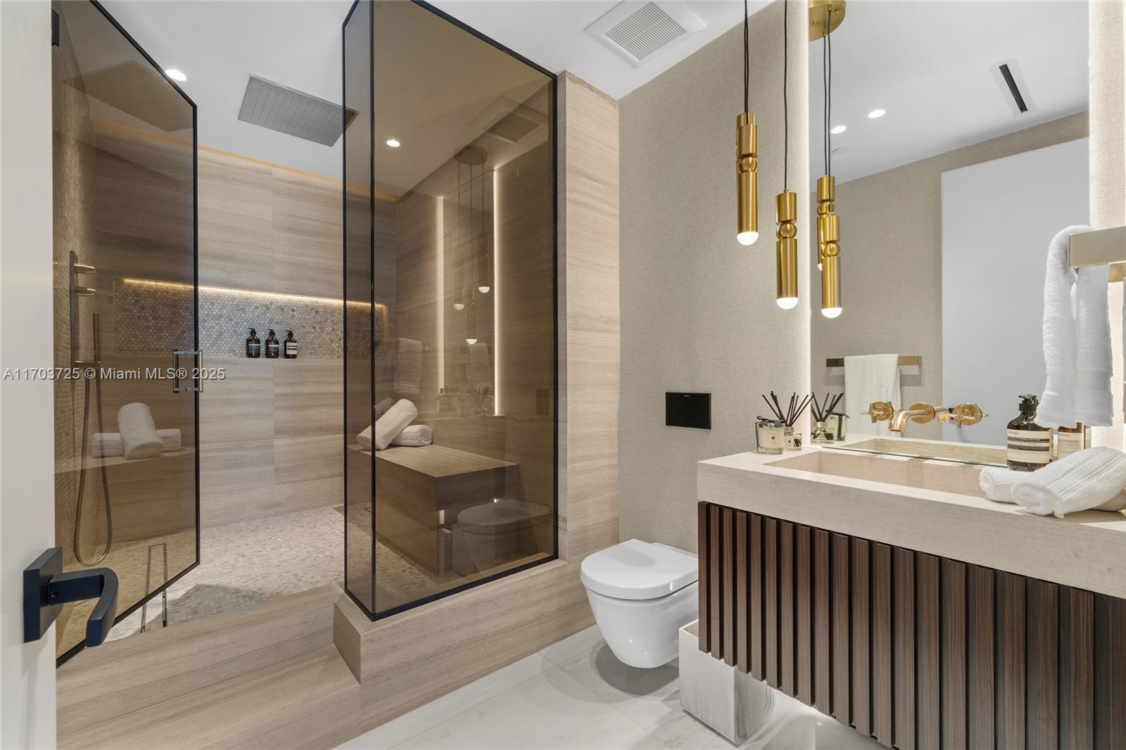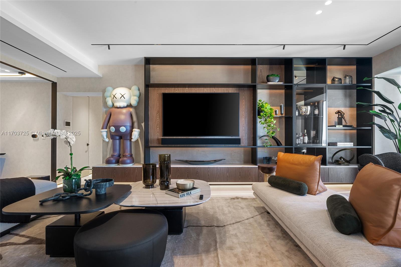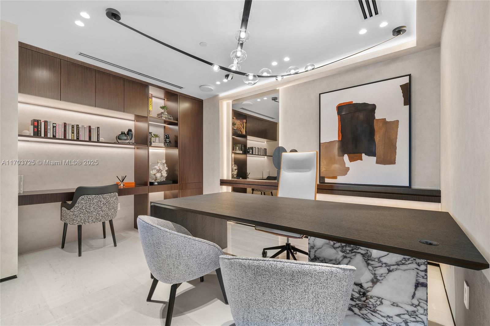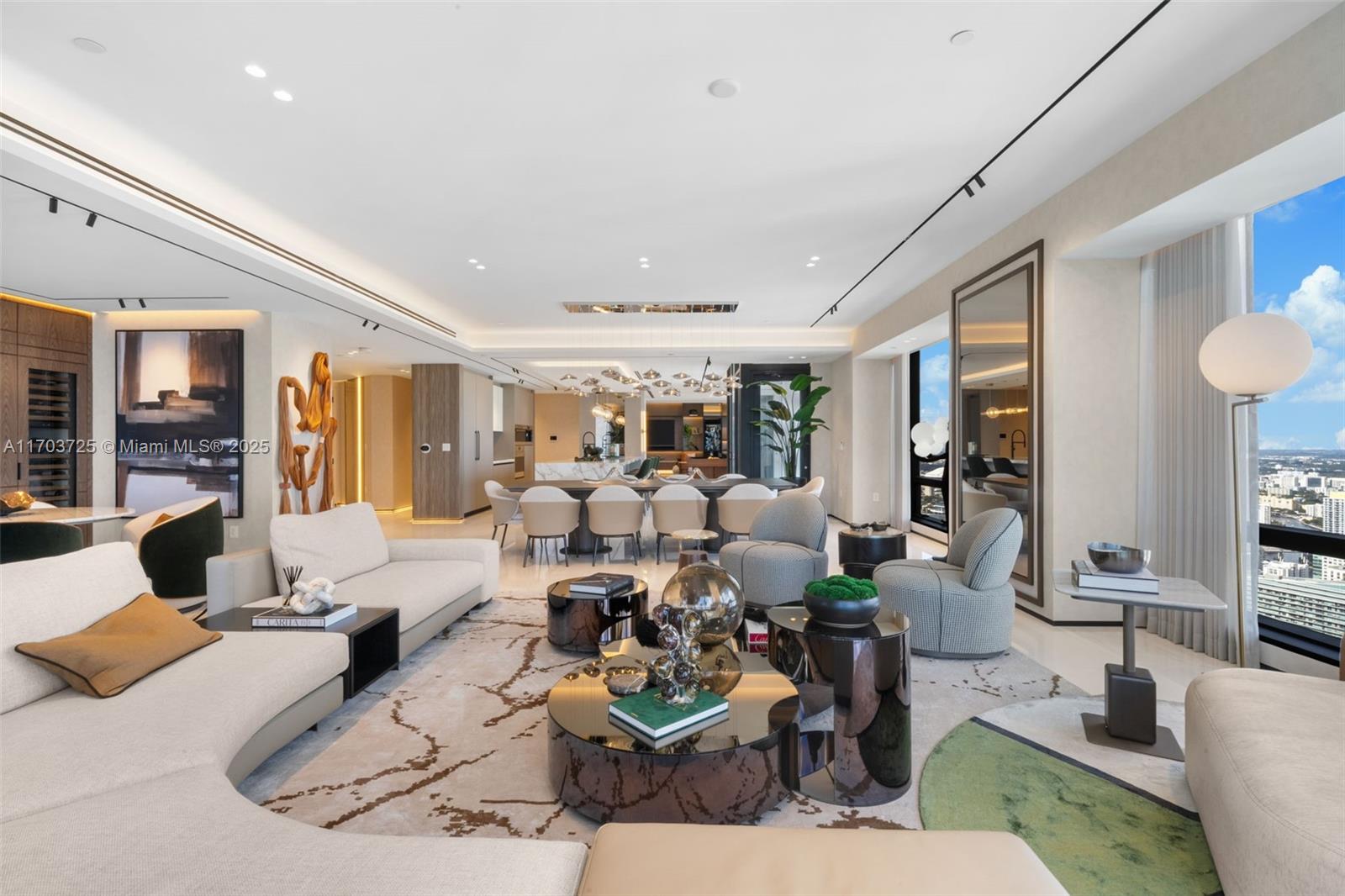 Welcome to Lower Penthouse 66. This fully renovated turnkey masterpiece in the prestigious Four Seasons Residences is situated on the 66th floor, in the building’s most desirable lines, D & E. This residence seamlessly merges two units, offering panoramic ocean and city views from every room. The interiors exude sophistication with Bianco Ondulato marble floors and an Ornare kitchen featuring Calacatta countertops. Furnished by Fendi, Minotti, and Luxury Living. Spa-like bathrooms with Armani fixtures, LED-lit recessed baseboards, gunmetal accents, and smart home technology. Ideal for entertaining, the home includes a lounge, bar, private office, family room, and maid’s quarters. World-class amenities include an Equinox fitness center, spa, multiple pools, and 24-hour concierge services