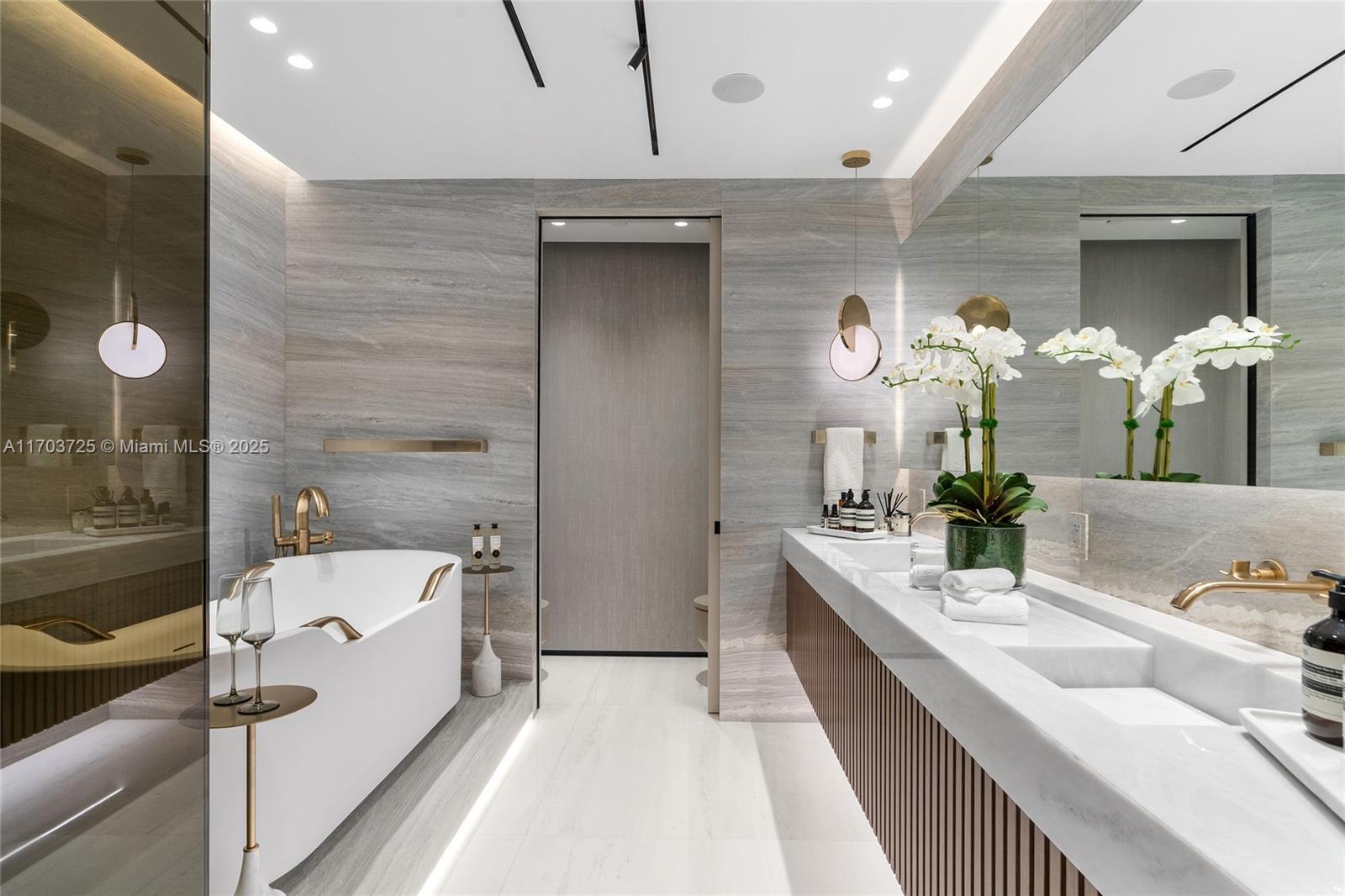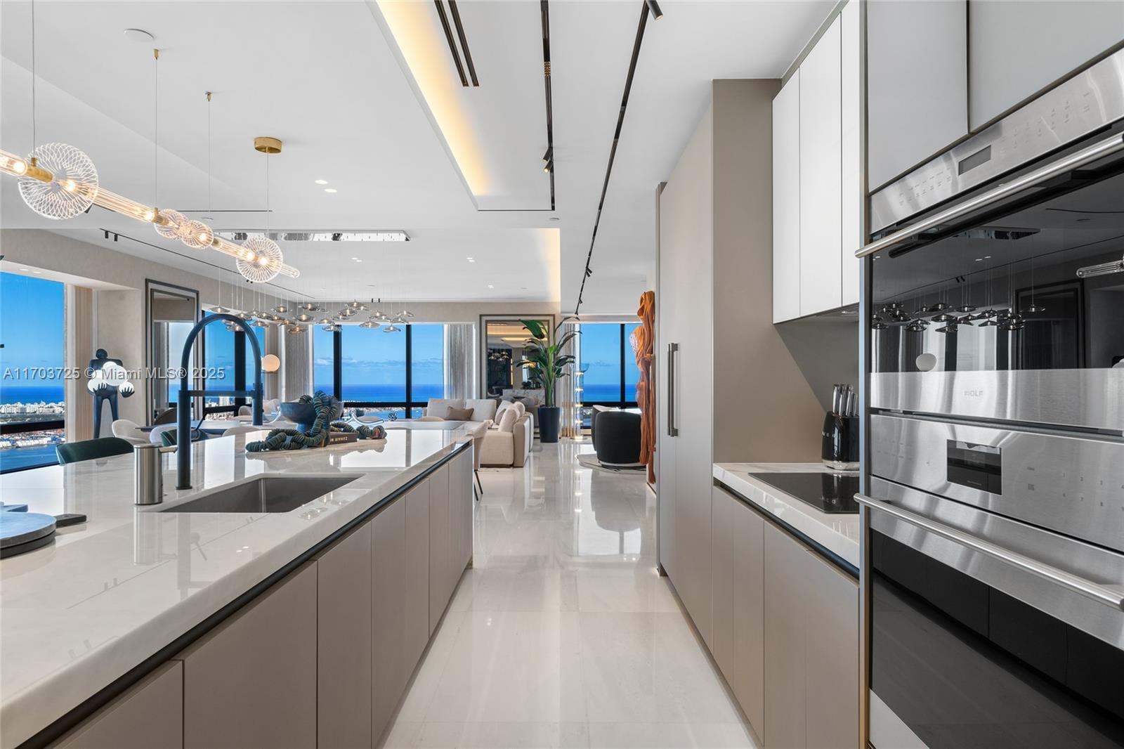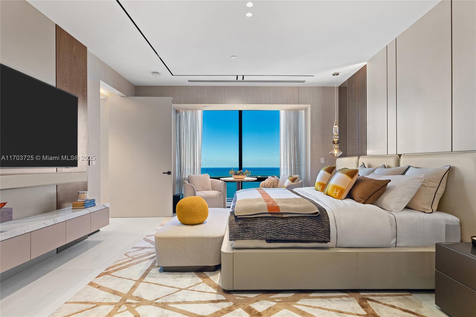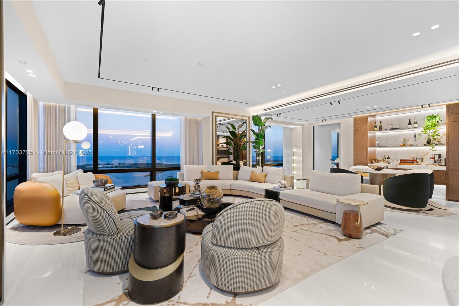Welcome to Lower Penthouse 66. This fully renovated turnkey masterpiece in the prestigious Four Seasons Residences is situated on the 66th floor, in the building’s most desirable lines, D & E. This residence seamlessly merges two units, offering panoramic ocean and city views from every room. The interiors exude sophistication with Bianco Ondulato marble floors and an Ornare kitchen featuring Calacatta countertops. Furnished by Fendi, Minotti, and Luxury Living. Spa-like bathrooms with Armani fixtures, LED-lit recessed baseboards, gunmetal accents, and smart home technology. Ideal for entertaining, the home includes a lounge, bar, private office, family room, and maid’s quarters. World-class amenities include an Equinox fitness center, spa, multiple pools, and 24-hour concierge services. Furniture and décor are included in the sale.