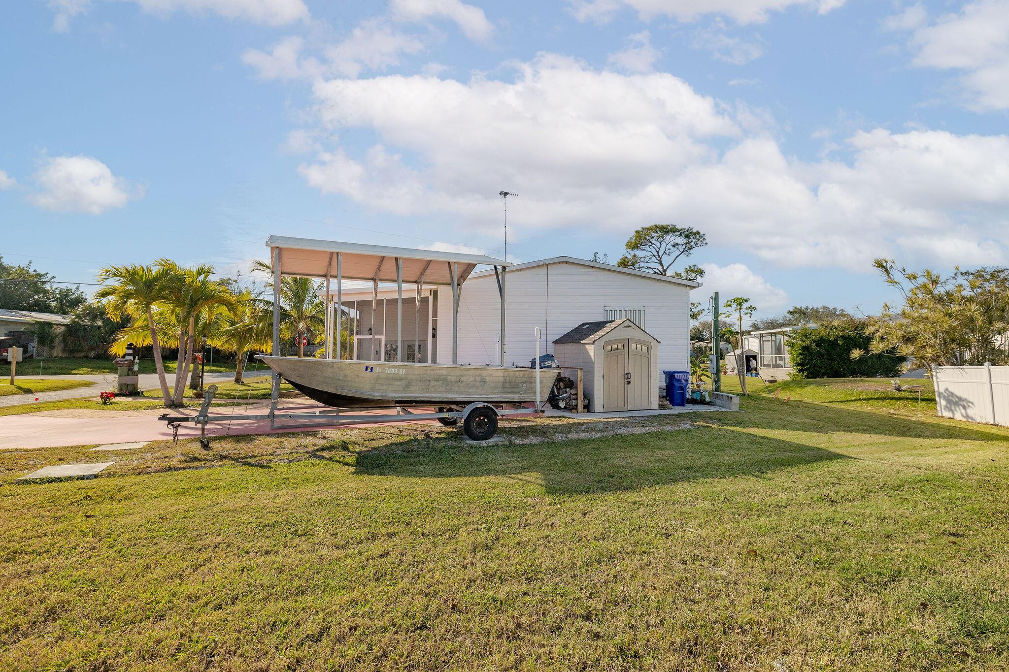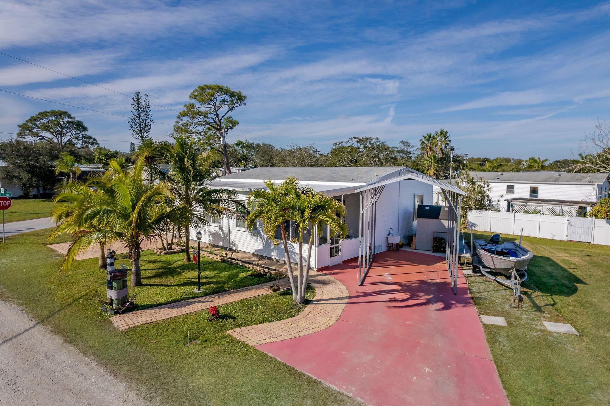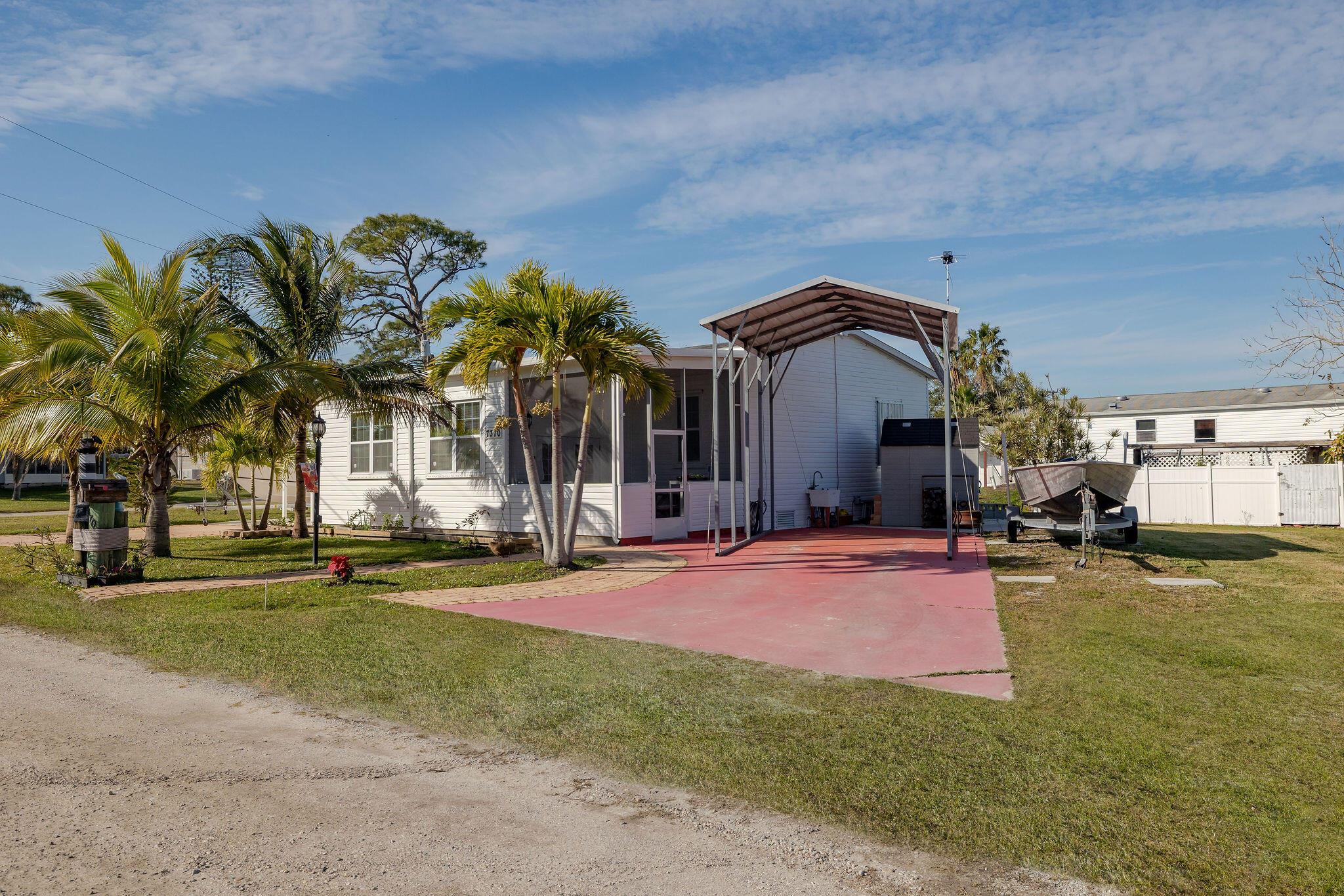 Discover this charming 2-bedroom, 2-bathroom home ideally located near the Indian River Lagoon and just minutes from the beaches! This unique community features a Community dock where homeowners can fish or keep a small boat, and two boat ramps are less than 7 minutes away for added convenience. Unlike many manufactured properties in the area, this home does not have a land lease--the land is owned. Enjoy the freedom of no HOA, allowing you to park your boat, RV, or other toys with ease. You're also within walking distance to the river and close to waterfront dining, shopping, and entertainment. Additional highlights include a 2016 roof, 2016 A/C, and a spacious yard with a shed for extra storage. Don't miss this fantastic opportunity to embrace the Florida lifestyle!