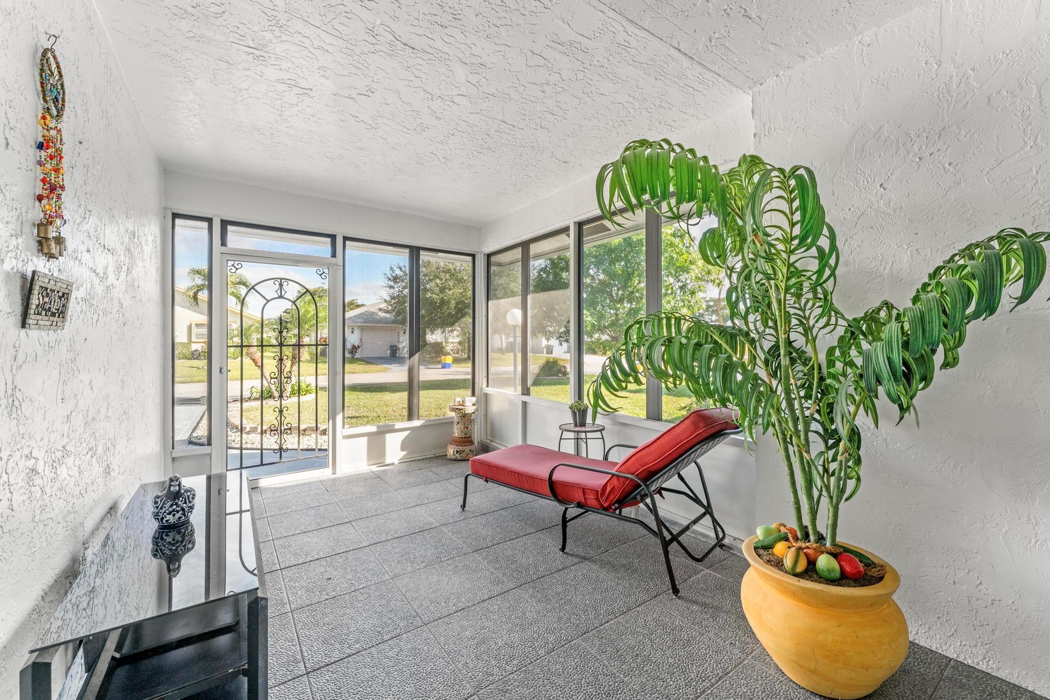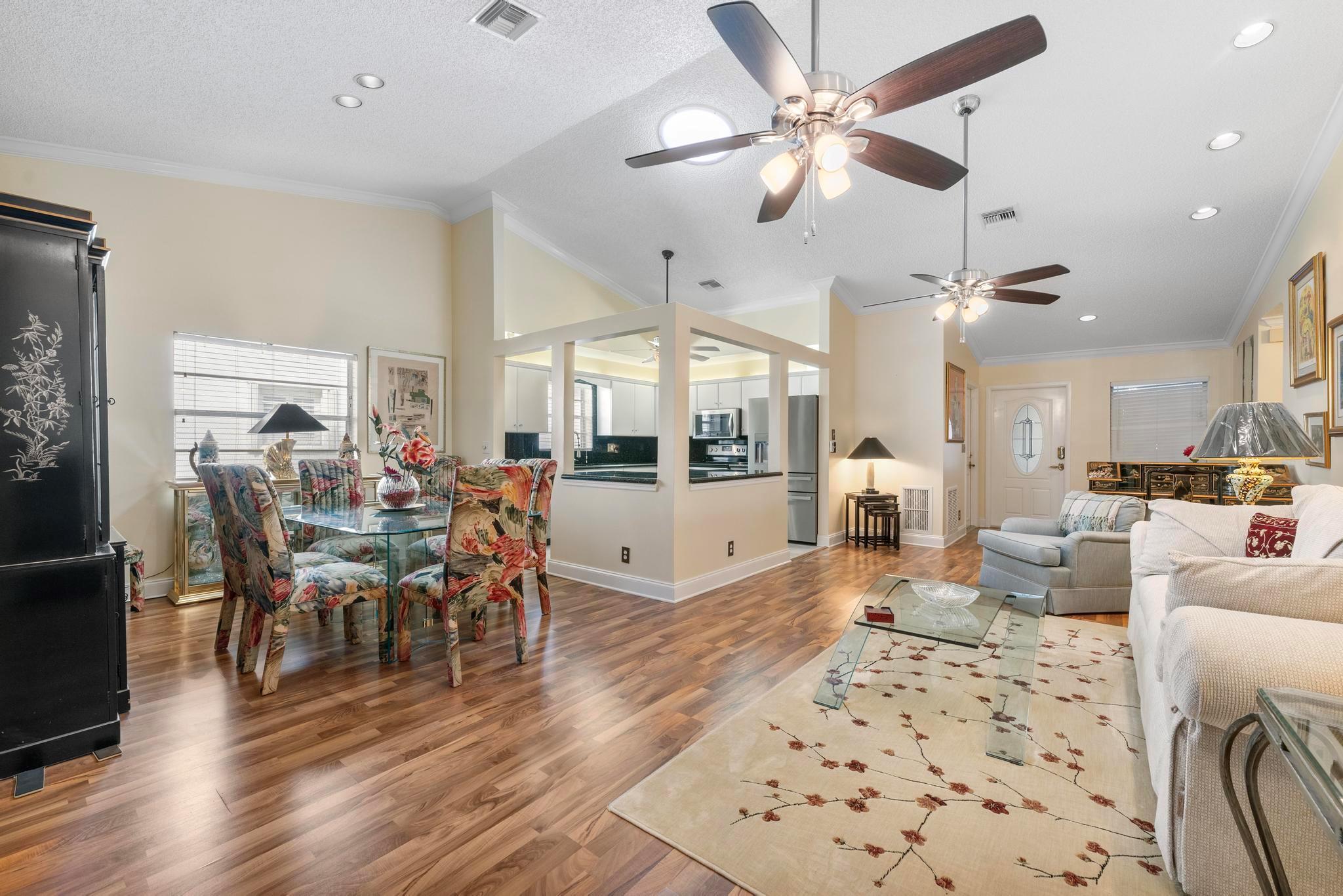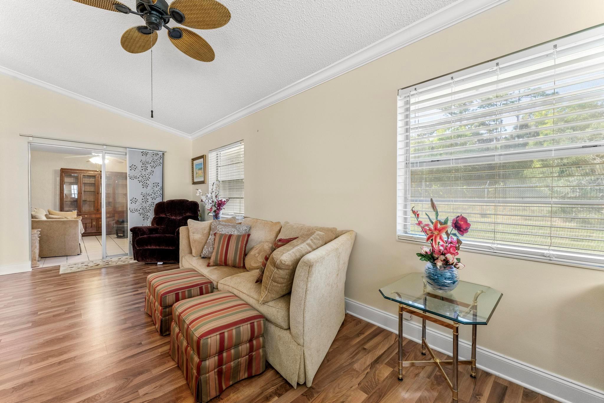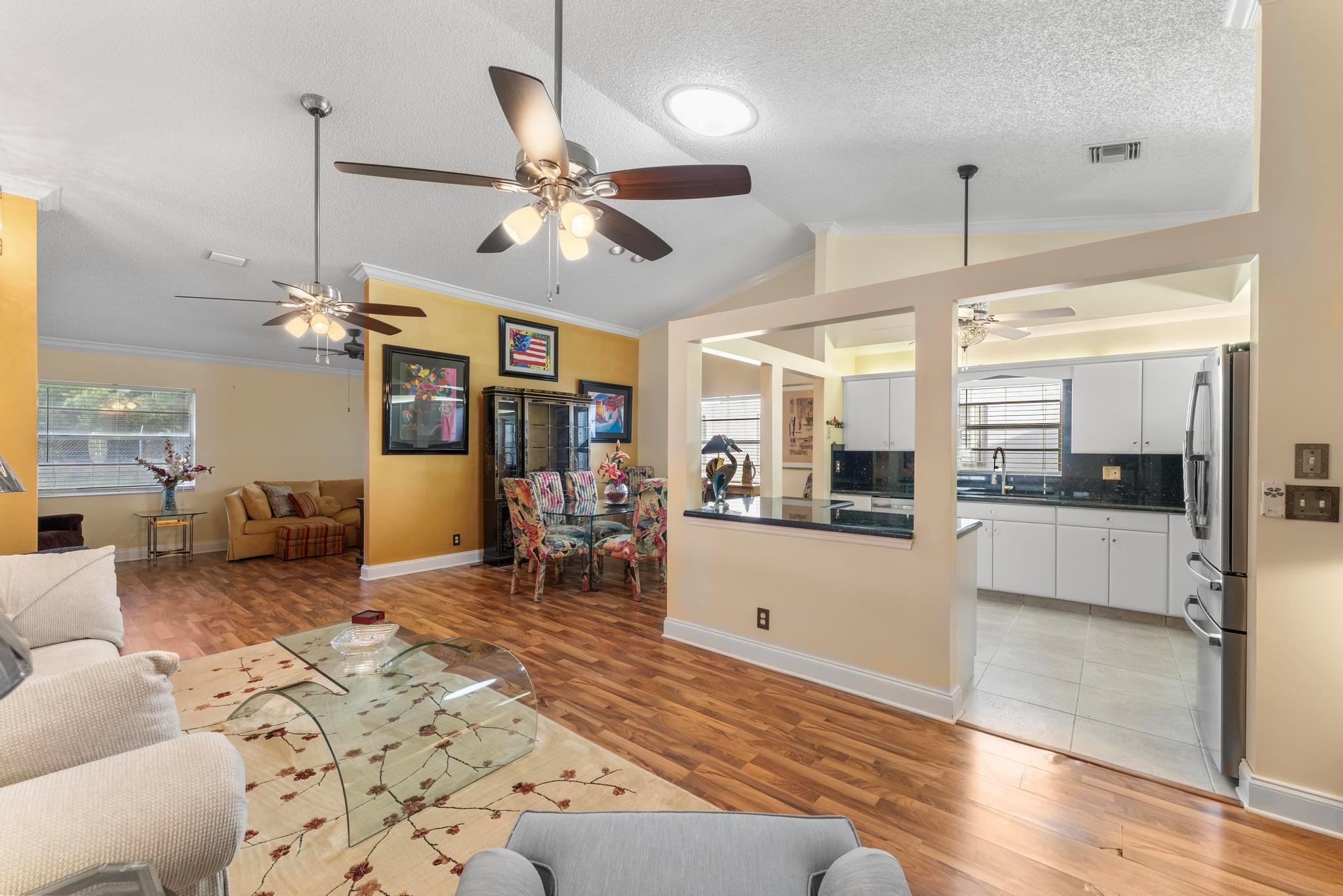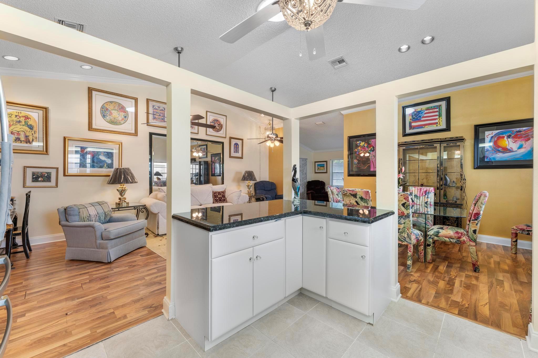 Welcome to this inviting 2 bedroom, 2 bathroom, 1 car garage home! The open floor plan features vaulted ceilings and crown molding, creating a bright and welcoming atmosphere throughout. The kitchen is equipped with white cabinetry, granite countertops, and stainless-steel appliances, along with a convenient snack bar for casual dining. The spacious primary bedroom provides plenty of room to relax and the updated primary bathroom includes a spacious shower for added convenience. Both bathrooms have been renovated with modern vanities and granite countertops. Additional living areas include a cozy family room, a sunroom for extra relaxation and a screened-in porch for outdoor enjoyment. This home offers the space and features you need for easy living.
