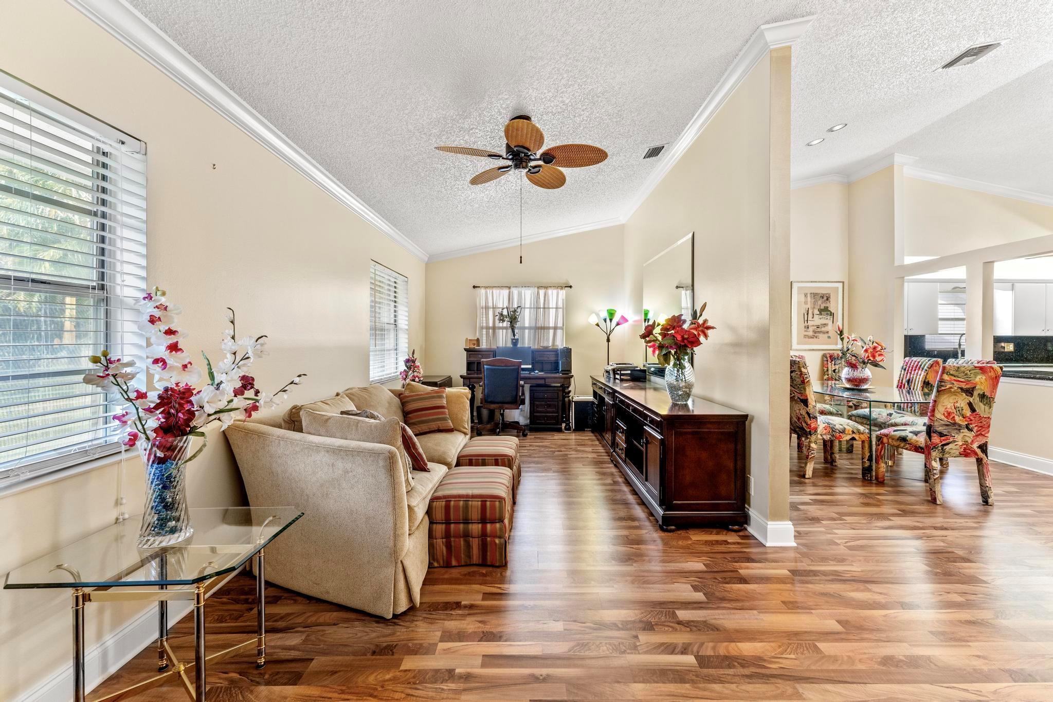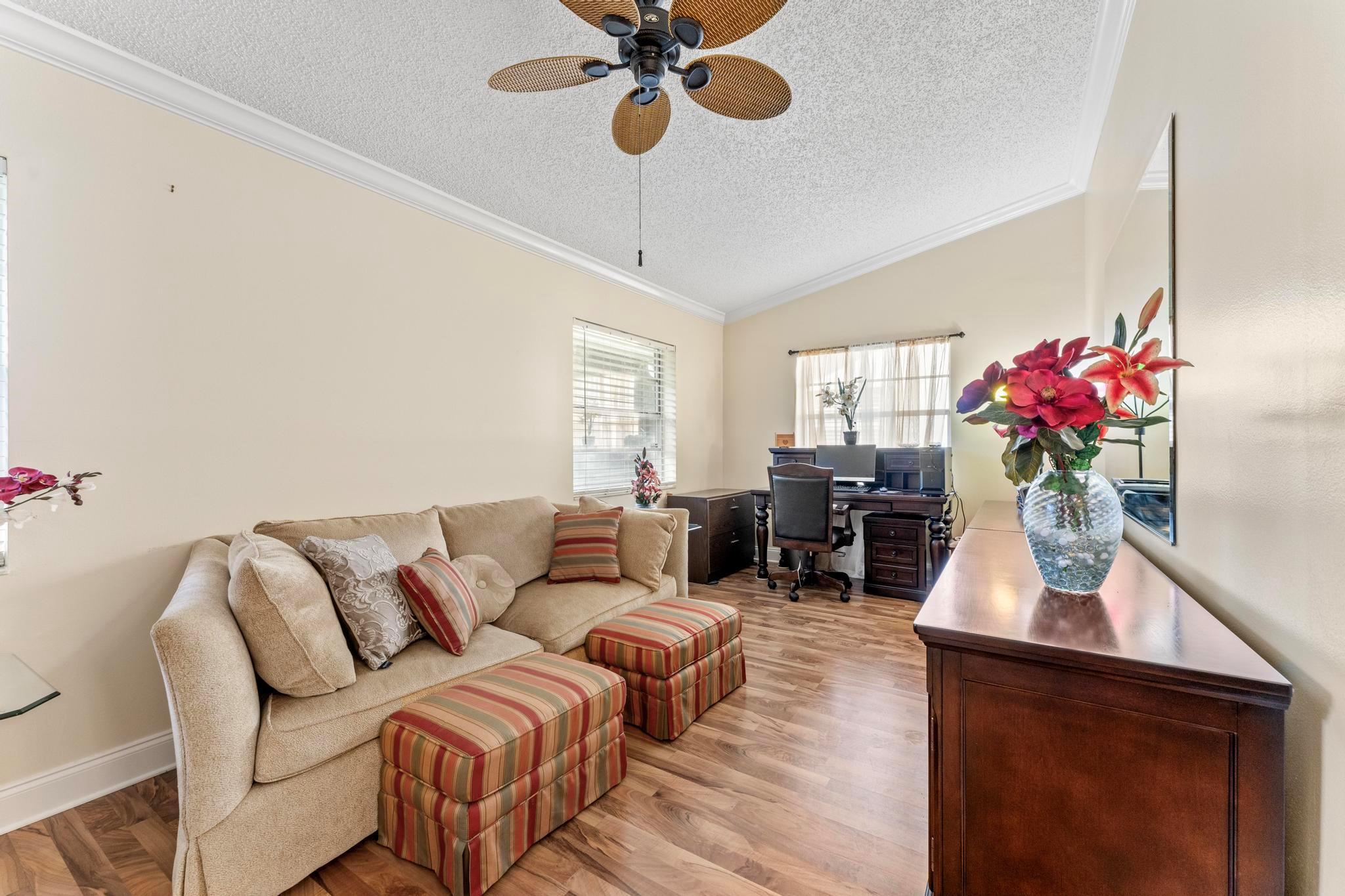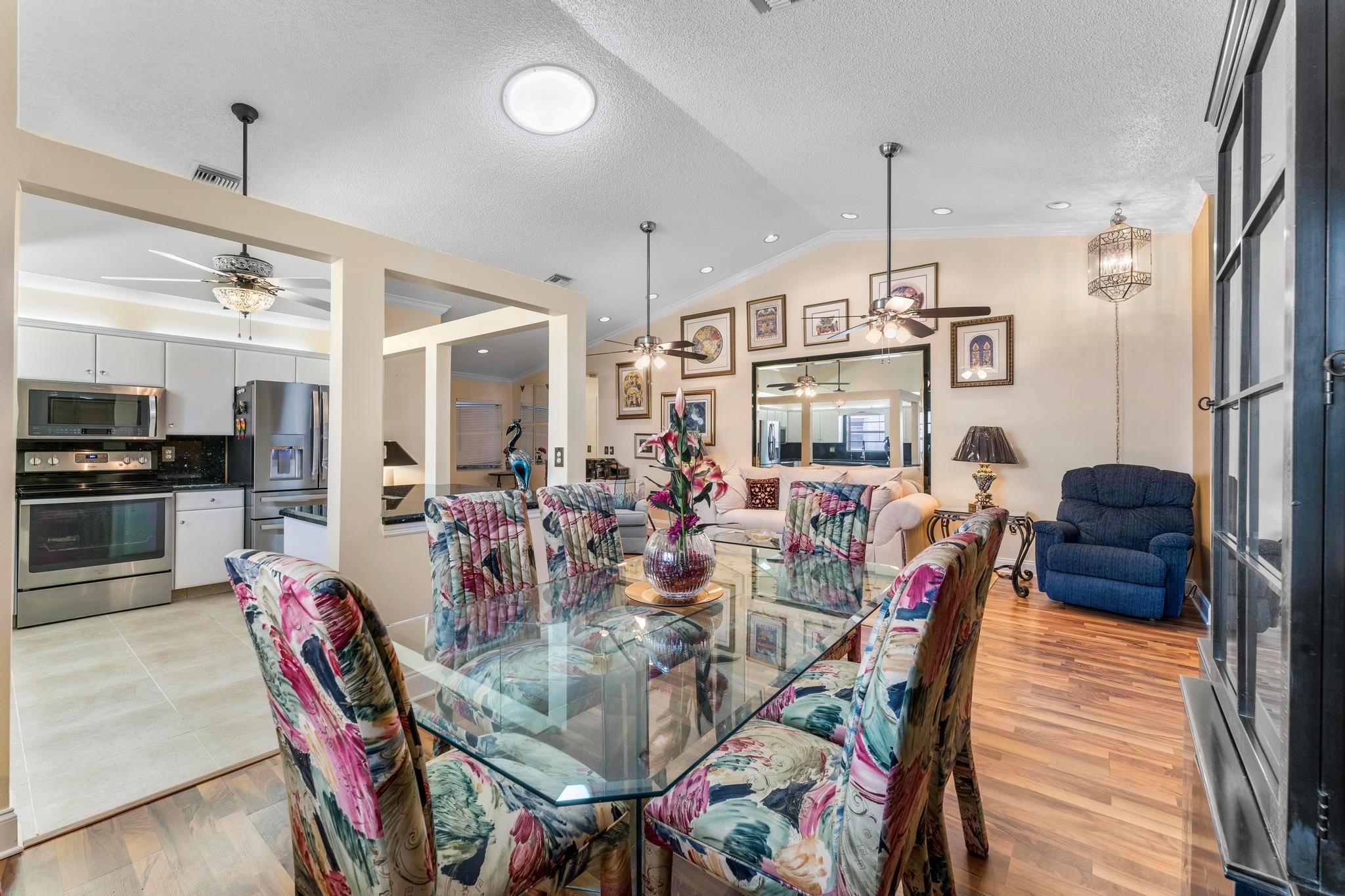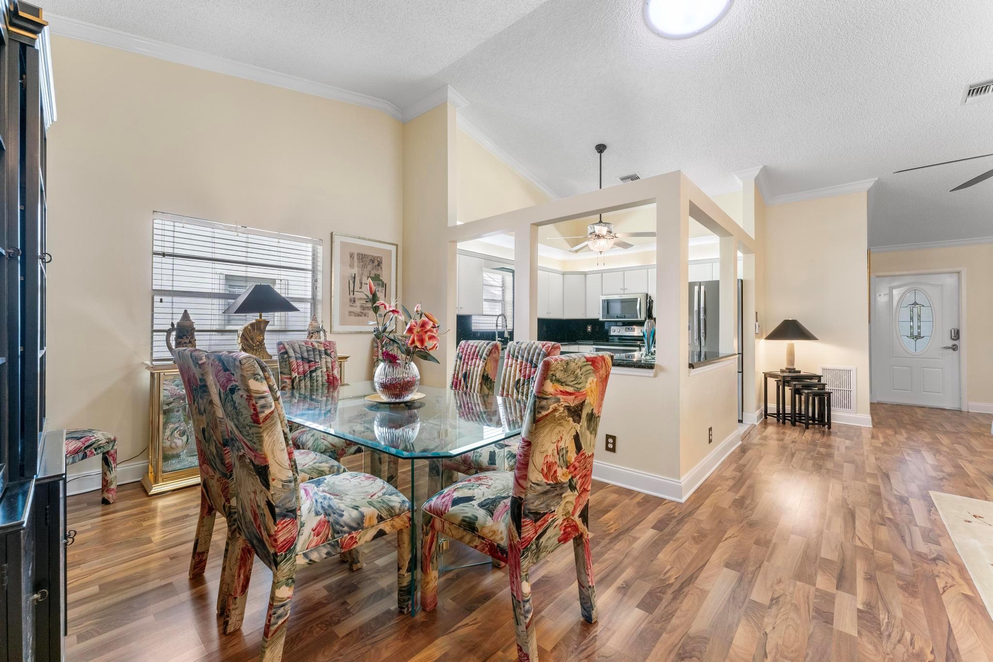 Welcome to this inviting 2 bedroom, 2 bathroom, 1 car garage home! The open floor plan features vaulted ceilings and crown molding, creating a bright and welcoming atmosphere throughout. The kitchen is equipped with white cabinetry, granite countertops, and stainless-steel appliances, along with a convenient snack bar for casual dining. The spacious primary bedroom provides plenty of room to relax and the updated primary bathroom includes a spacious shower for added convenience. Both bathrooms have been renovated with modern vanities and granite countertops. Additional living areas include a cozy family room, a sunroom for extra relaxation and a screened-in porch for outdoor enjoyment. This home offers the space and features you need for easy living.