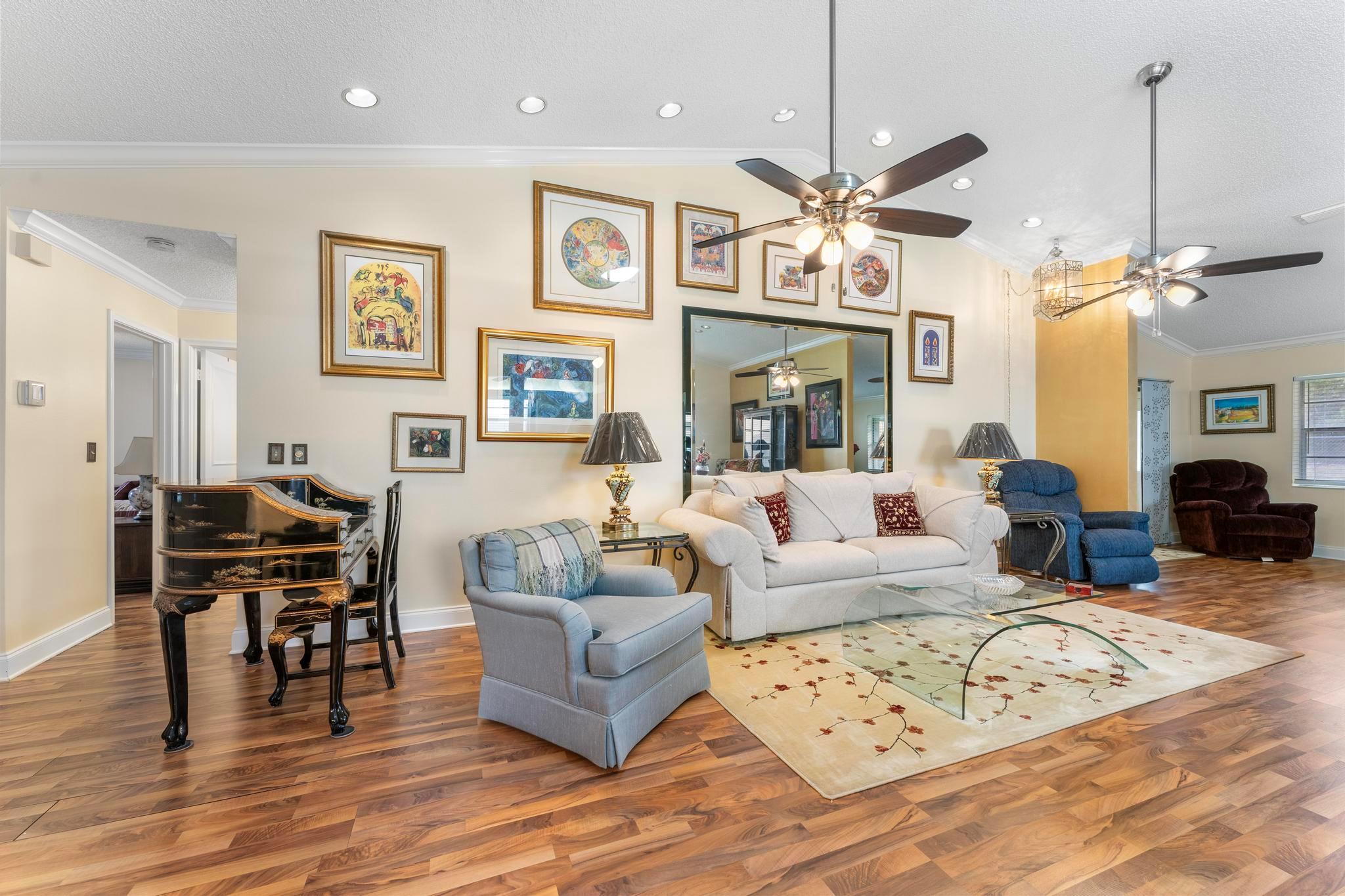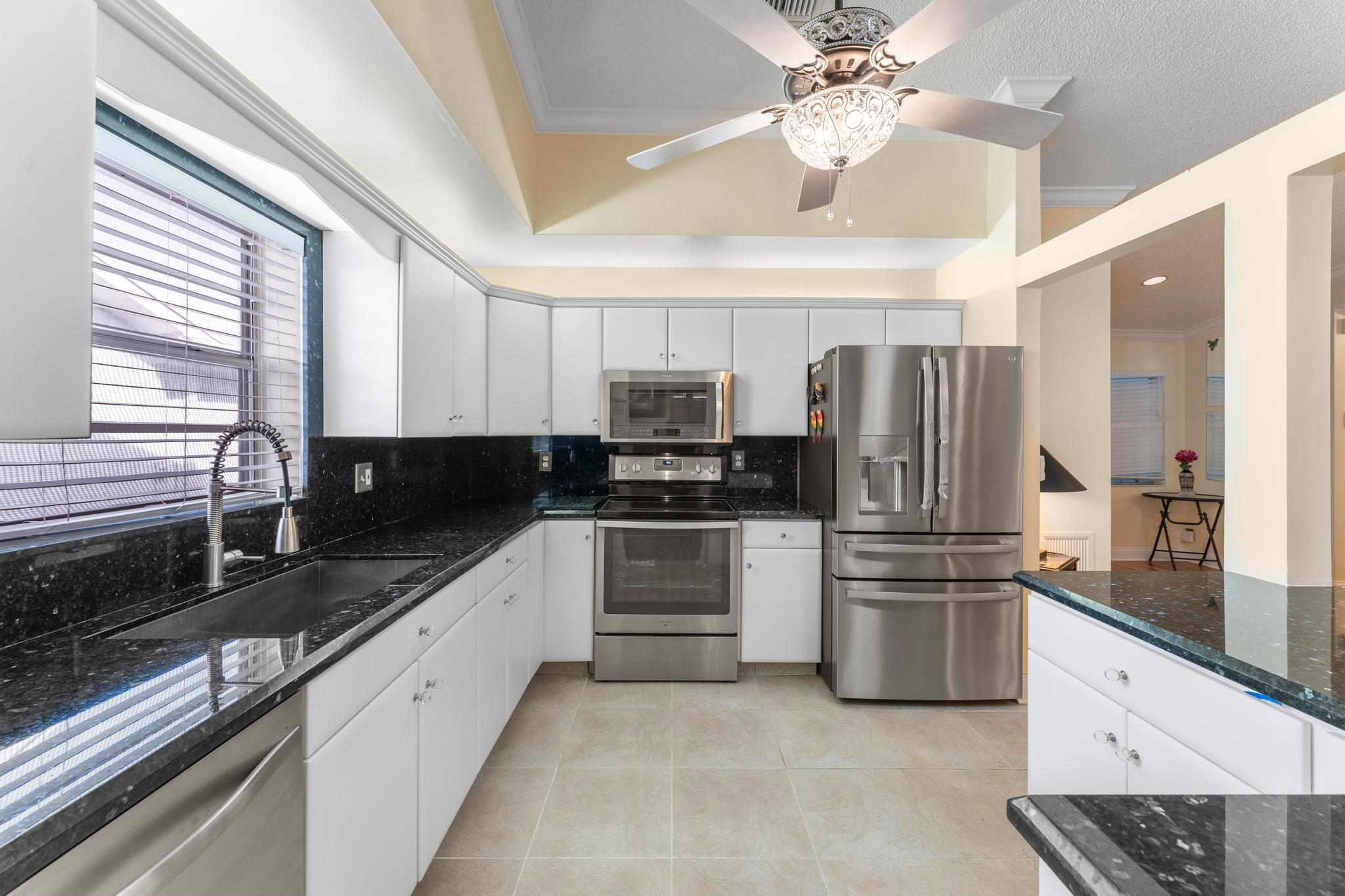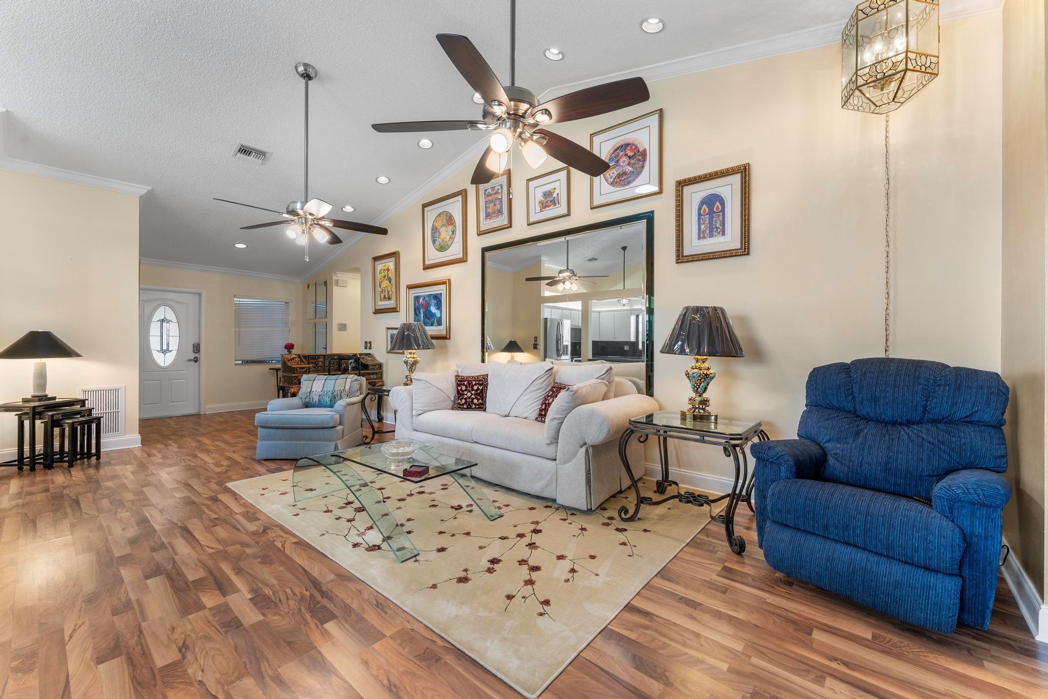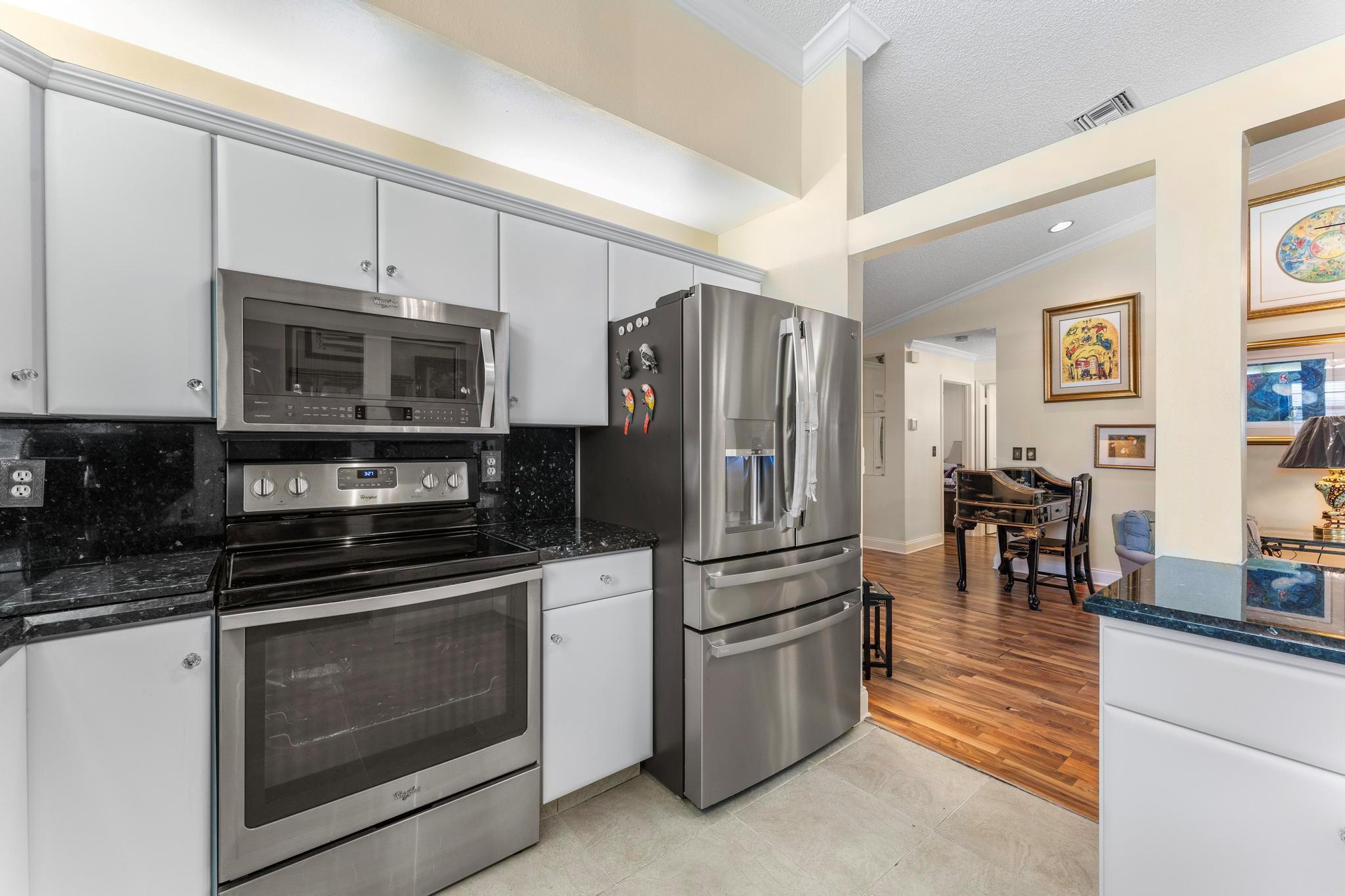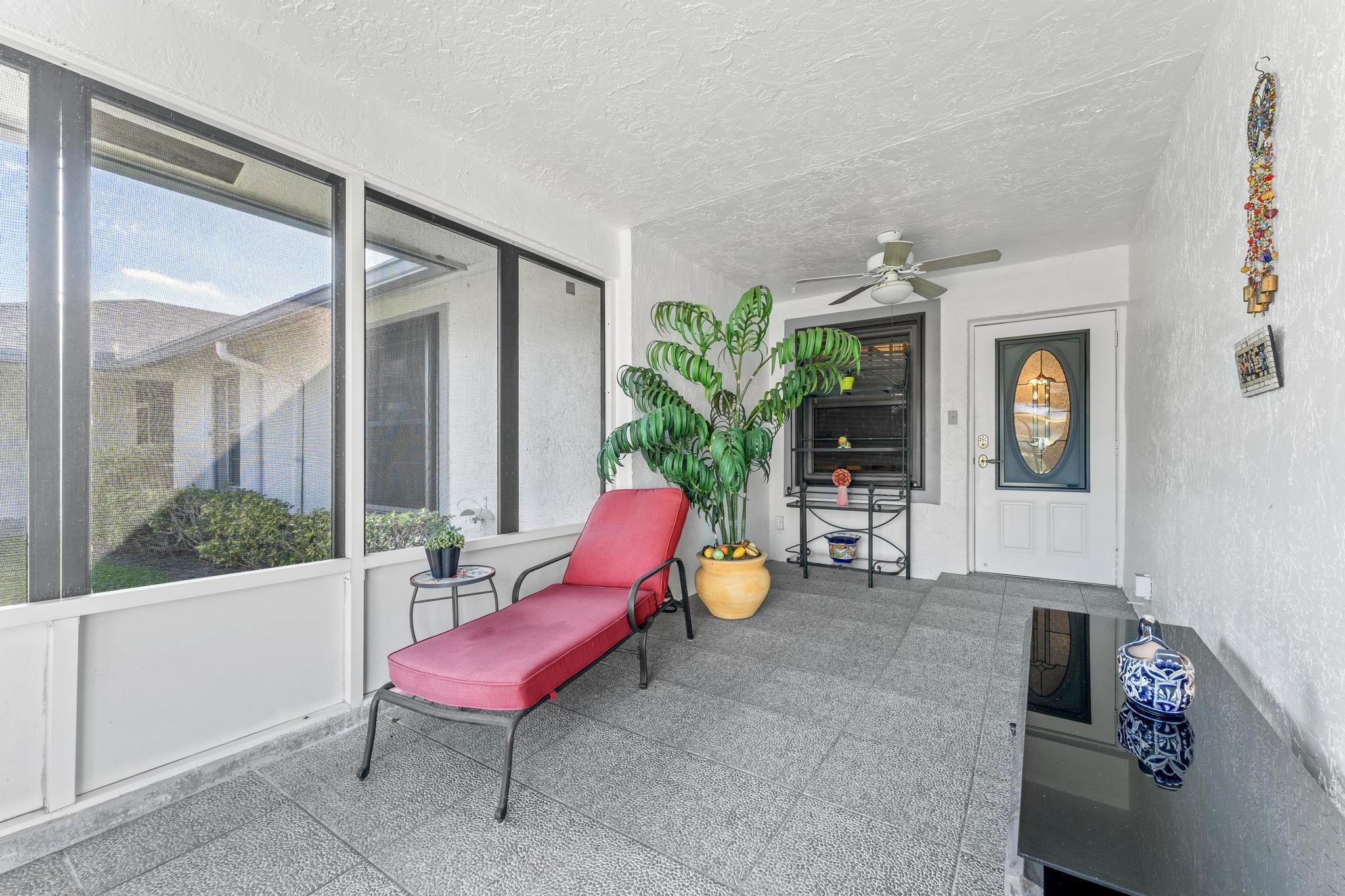 Welcome to this inviting 2 bedroom, 2 bathroom, 1 car garage home! The open floor plan features vaulted ceilings and crown molding, creating a bright and welcoming atmosphere throughout. The kitchen is equipped with white cabinetry, granite countertops, and stainless-steel appliances, along with a convenient snack bar for casual dining. The spacious primary bedroom provides plenty of room to relax and the updated primary bathroom includes a spacious shower for added convenience. Both bathrooms have been renovated with modern vanities and granite countertops. Additional living areas include a cozy family room, a sunroom for extra relaxation and a screened-in porch for outdoor enjoyment. This home offers the space and features you need for easy living.