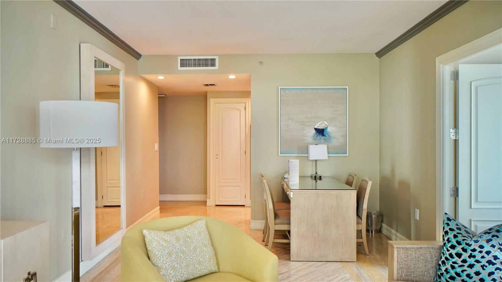 Room 611 at Hilton Bentley Miami Beach is a spacious 710-square-foot suite offering luxury and comfort. The suite features a large bedroom, a cozy living area, and an en-suite bathroom with a shower, bathtub, and bidet. The entire suite is finished with elegant marble flooring, adding a sophisticated touch to every corner. The suite also boasts an incredible ocean-view balcony, perfect for enjoying the beautiful Miami Beach scenery. With stainless steel appliances and ample natural light, the space feels open and inviting. Residents have full access to the hotel’s top-tier amenities, including beach access, a pool, spa, and fitness center, making this suite the ideal retreat for relaxation and style in the heart of Miami Beach.