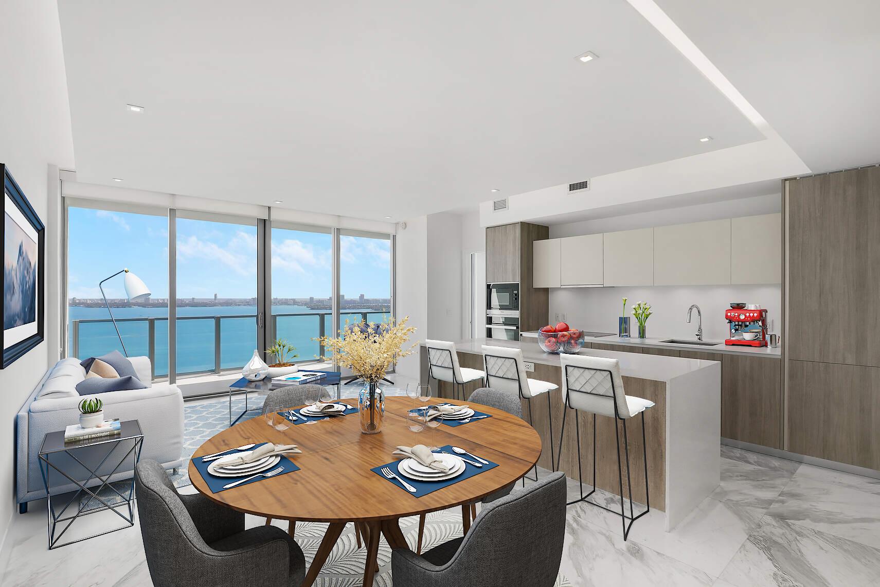 Breathtaking 2-bed, 2.5-bath located on the 27th floor of Biscayne Beach. With panoramic, unobstructed water views, this exceptional home offers luxury living at its finest. Private elevator opens directly into your own foyer, leading into an expansive living space with high-end finishes throughout. Gourmet kitchen boasts top-of-the-line Miele appliances. Open floor plan flows seamlessly into living & dining areas. Spacious primary suite offers a luxurious retreat, featuring a stunning wet room, double vanity & fully designed walk-in closet. 2nd bedroom is ensuite and can double as a 2nd primary. Building features: private beach club, 2 pools, fitness center, spa, party room, tennis courts, basketball & volleyball courts & more.