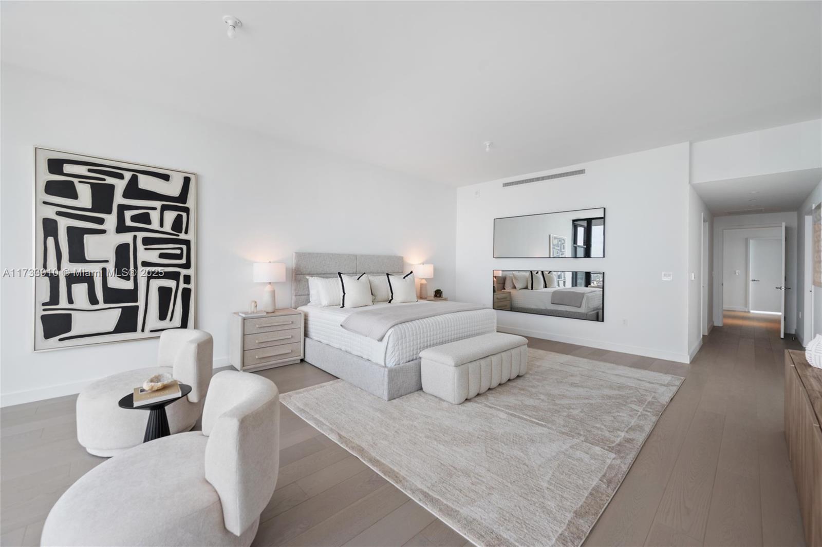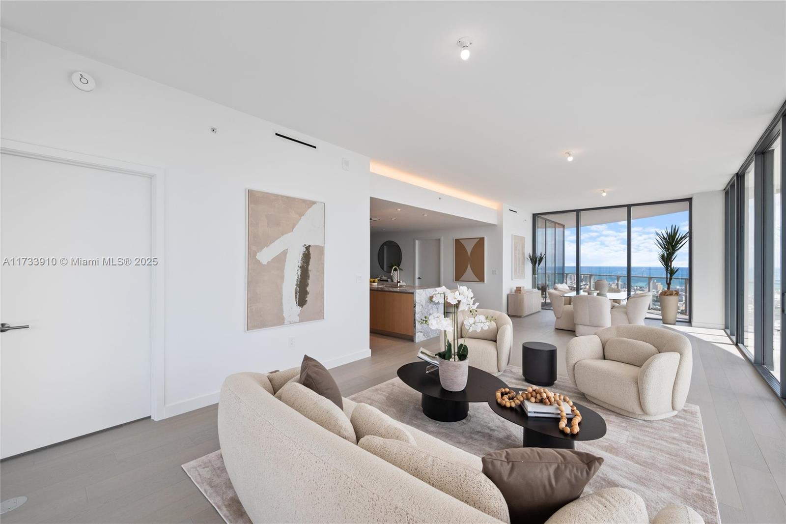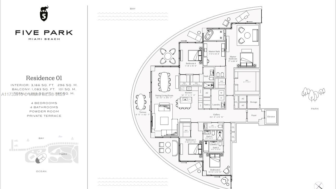 Welcome to Five Park, the epitome of luxury living in Miami Beach. Located in the prestigious South of Fifth neighborhood, this architectural gem by Arquitectonica offers 4,269 SqFt of expertly designed space. This brand- new corner unit features four bedrooms, four bathrooms, a powder room, and a private terrace, blending style and functionality seamlessly. With expansive windows, 10-foot ceilings, and a wraparound terrace, enjoy stunning ocean, bay, and city views. The Gabellini Sheppard-designed kitchen boasts Italian oak cabinetry, marble countertops, and Gaggenau appliances Residents access amenities including the exclusive Canopy Club on the 26th floor with private dining, wellness lounges, and personalized services.