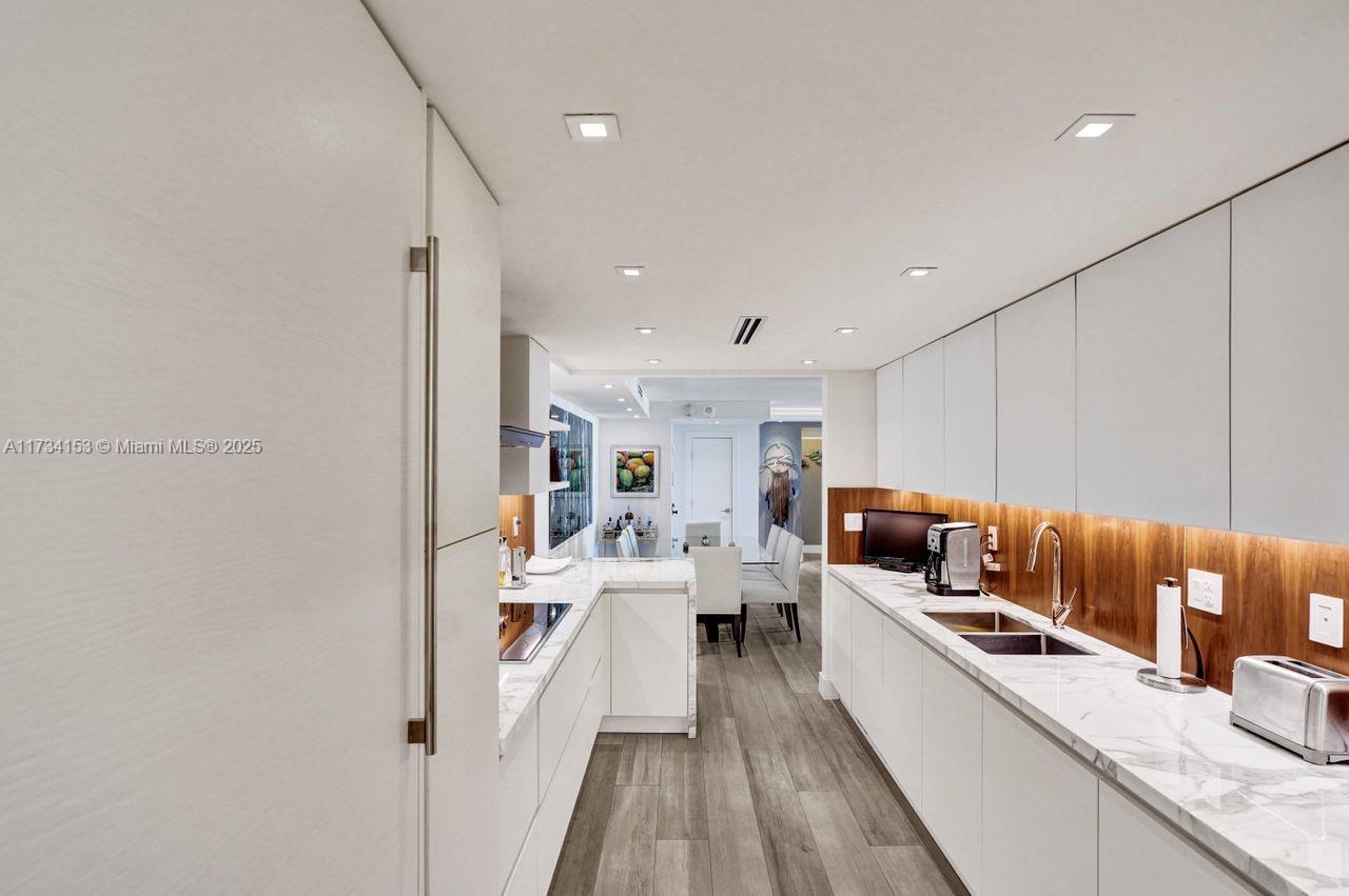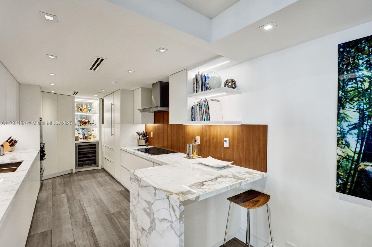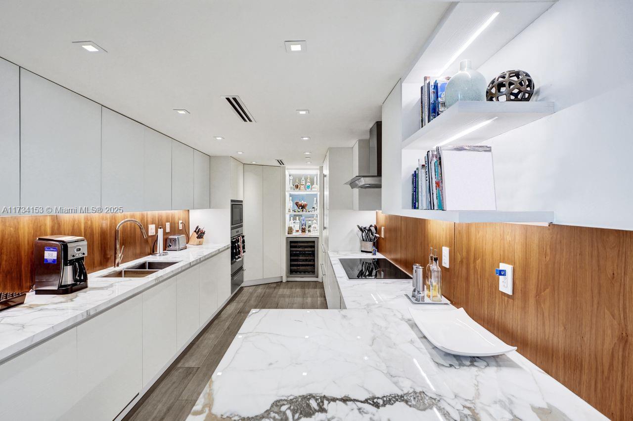 Experience elegant coastal living in this beautifully renovated 2-bedroom, 2-bathroom split-plan residence, boasting a coveted east-facing exposure with breathtaking views of the ocean, state park, and resort-style pools. No expense was spared in crafting this exquisite island retreat, featuring custom cabinetry, designer lighting, and elegant porcelain tile flooring throughout. The spacious open kitchen is a chef’s dream, showcasing stunning Carrara Calacatta Oro countertops, top-of-the-line Wolf appliances, and bespoke cabinetry. A true gem—easy to show!