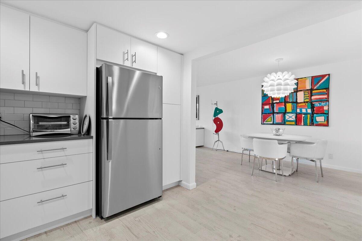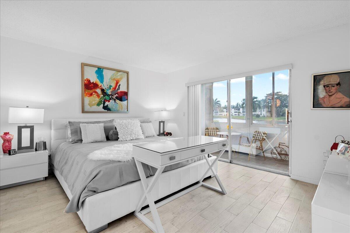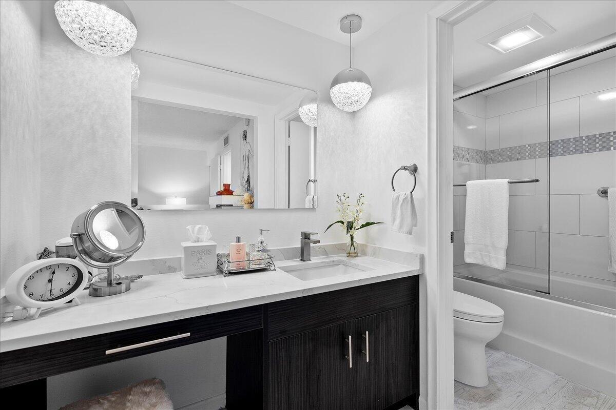 Come see this totally renovated, extra large, lakefront condo with 912 total square feet with 1-bedroom, 1.5-baths, located in one of Century Village's most sought-after luxury buildings in beautiful West Palm Beach. Beautifully redesigned space and sweeping water views, this residence exudes quality, comfort, and modern sophistication at every turn. Step inside to discover a stunning, completely reimagined interior-no detail has been overlooked. The designer kitchen is a true showpiece, featuring sleek white custom cabinetry, elegant Quartz countertops, and stainless appliances (approx. one year old and oven and dishwasher have never been used. The spacious primary suite is a private retreat, offering tranquil lake views, direct lanai access two closets including a generous walk-in,
