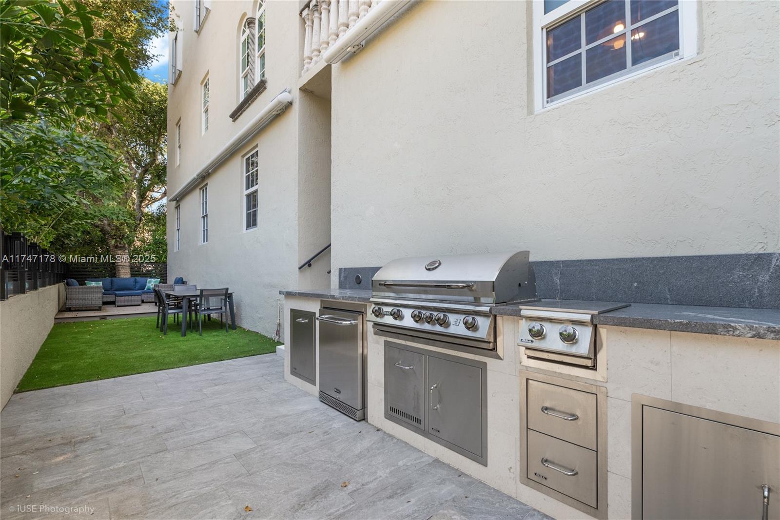 Price Improvement! $100,000 BELOW Current Appraised Value (attached in MLS)! Low HOA $665/month. Nestled on a serene, tree-lined street, this beautifully remodeled home offers an unparalleled living experience in a boutique 5-unit building on coveted Edgewater Drive, directly across from the stunning Biscayne Bay. 10-foot ceilings and natural light throughout. The gourmet kitchen and dining area open to a private outdoor oasis with an outdoor kitchen. Custom retractable awnings provide versatility, ensuring comfort in any weather while exterior lighting creates a charming ambiance perfect for entertaining or quiet relaxation.. The first floor includes the primary bedroom with an en-suite bathroom, while the second floor has two additional bedrooms and a full bathroom.