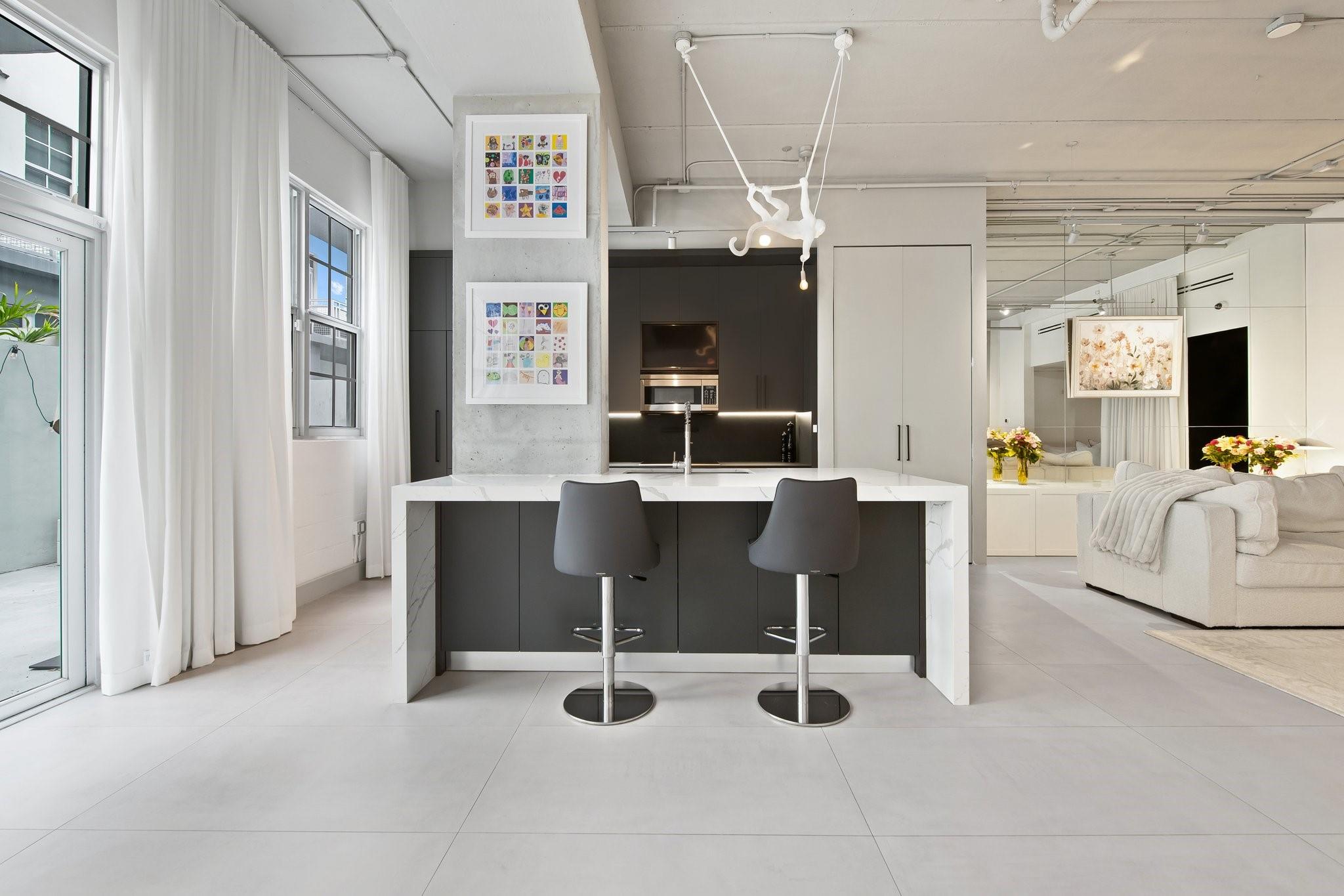 Modern luxury at Avenue Lofts in Flagler Village. This remodeled 1-bedroom loft features an oversized terrace, 12’ ceilings, and high-end designer finishes. The custom kitchen offers solid wood cabinets, quartz waterfall island, built-in TV, and Fisher & Paykel appliances. Spa-style bath with Kohler and Moen fixtures. Enjoy large porcelain tile floors, impact windows, in-unit washer/dryer, and custom cabinetry for ample storage. Unique lighting adds modern charm. Pet-friendly building with rooftop gym and pool. Prime location just 1/4 mile from Brightline and minutes to Las Olas. (Drapery not included.)
