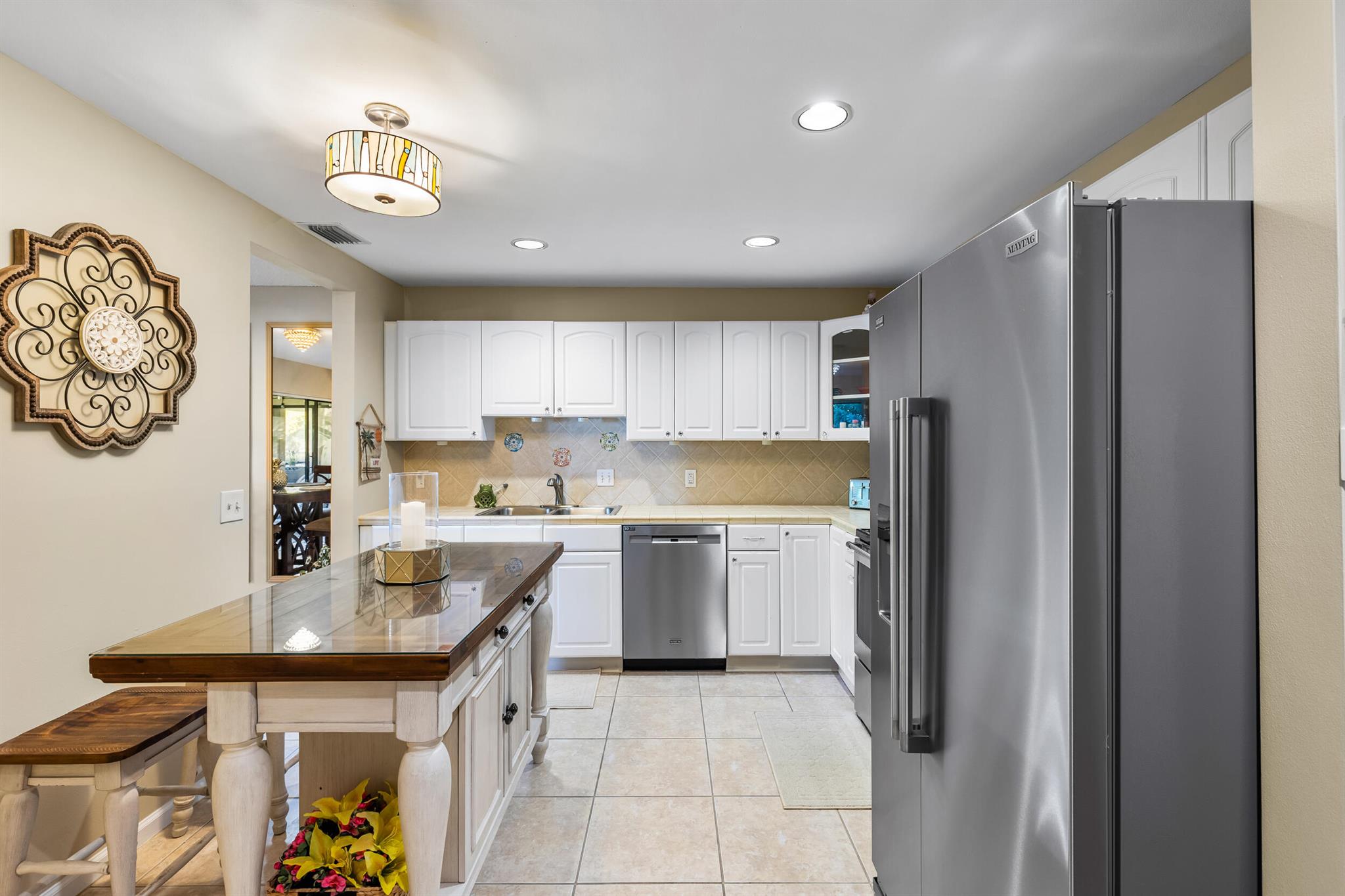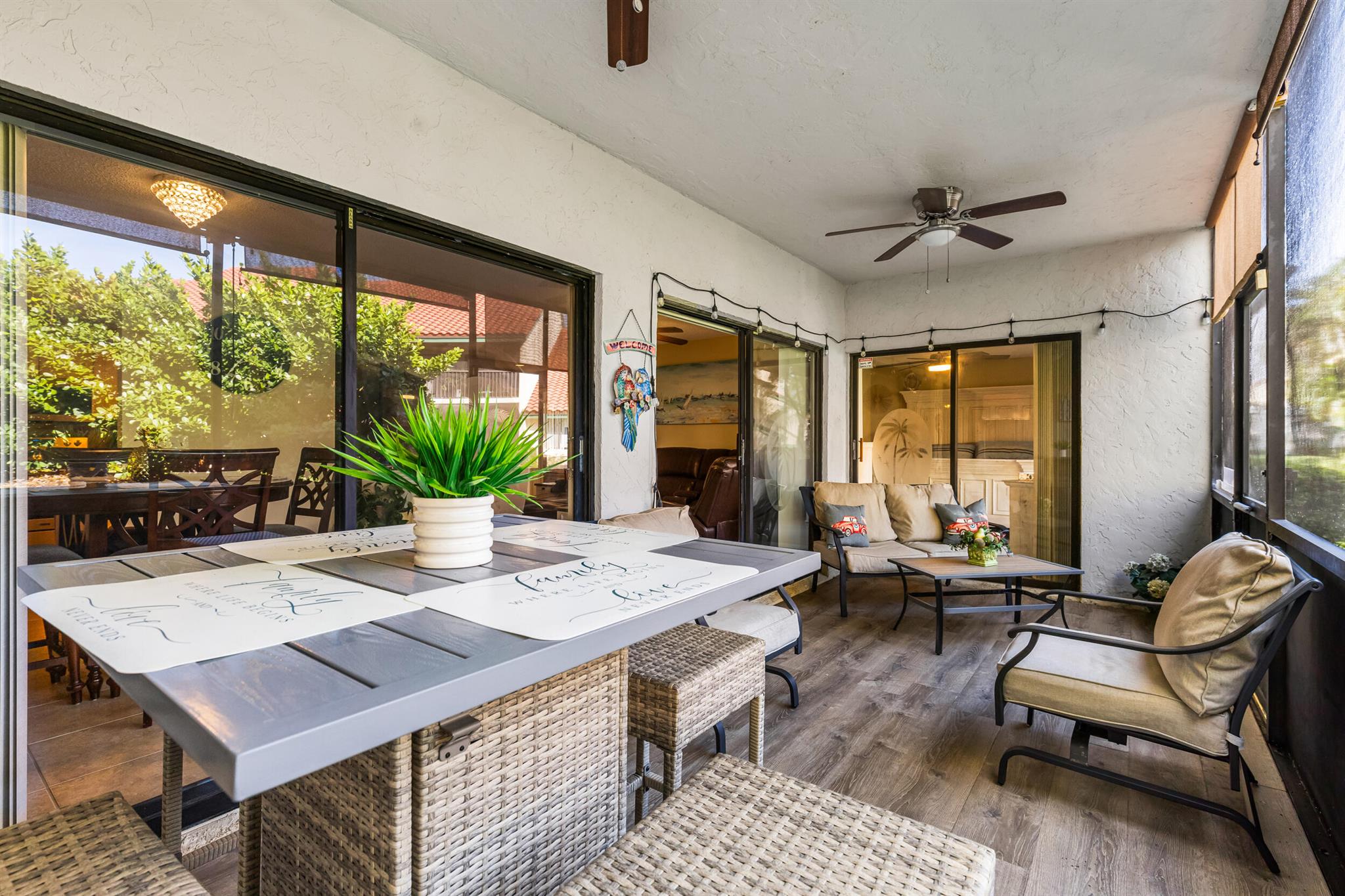Welcome to this charming first-floor condo located in the highly sought-after PGA National! This home features an updated kitchen with stainless steel appliances, granite countertops, a stylish backsplash, and a beautiful island perfect for entertaining. Beautiful porcelain tile flows throughout, and the one-car attached garage with storage area. A private entrance leads into an open dining/living area, and the two bedrooms are split for privacy. Enjoy the screened-in, covered patio for outdoor relaxation. Community pool is located only a few steps away from the house.Maintenance fees include all building maintenance including the roof, landscaping, insurance, water/sewer, and cable. As a resident,