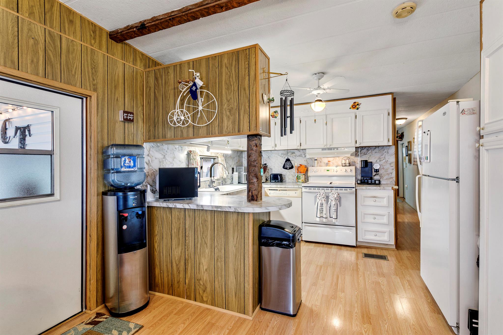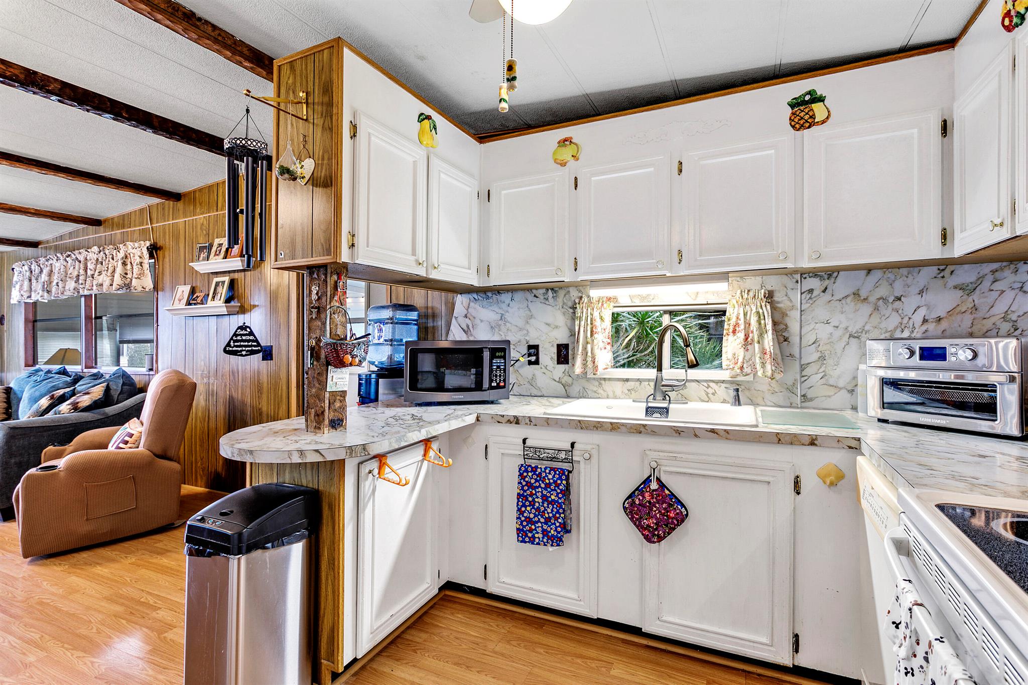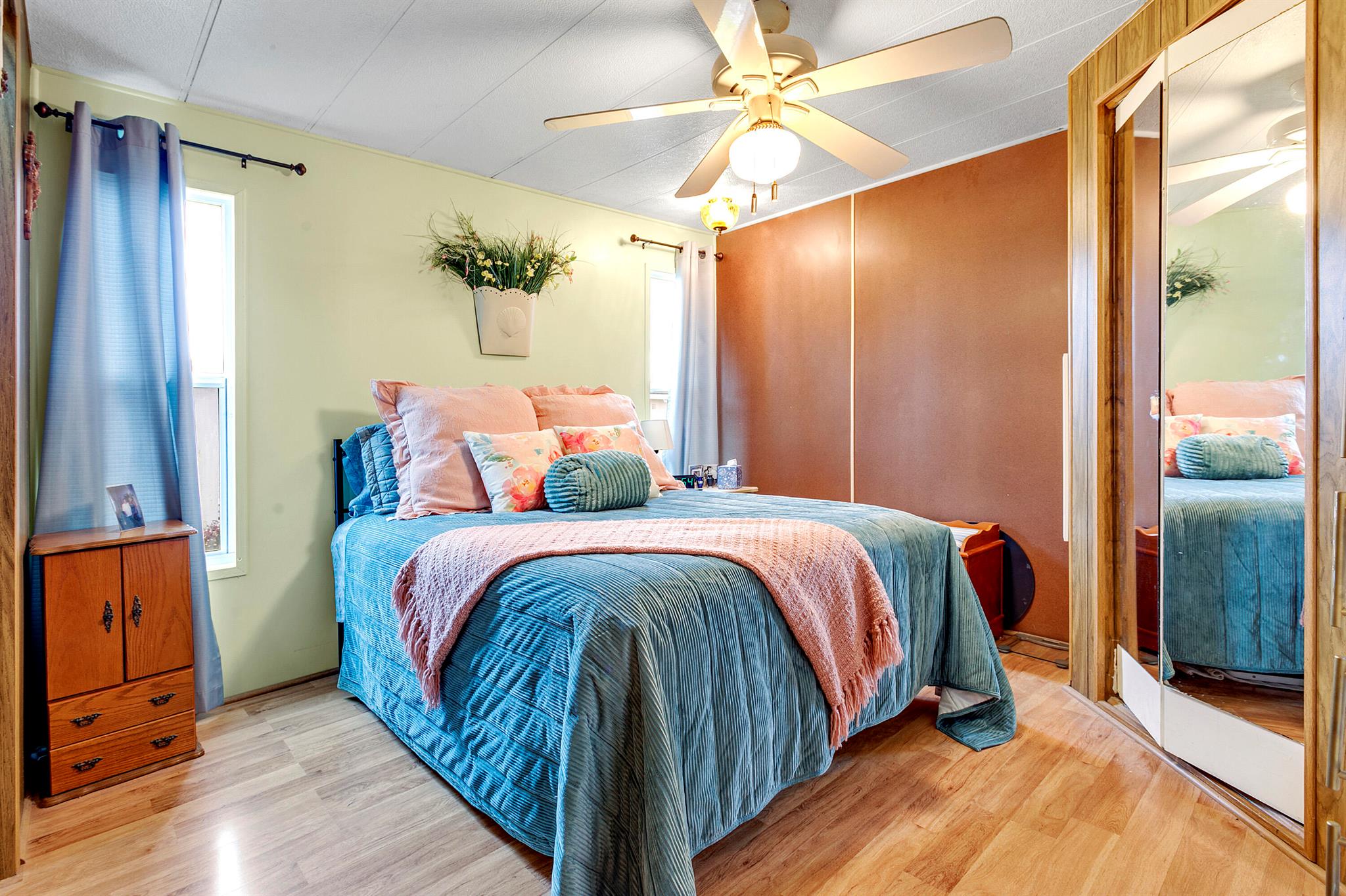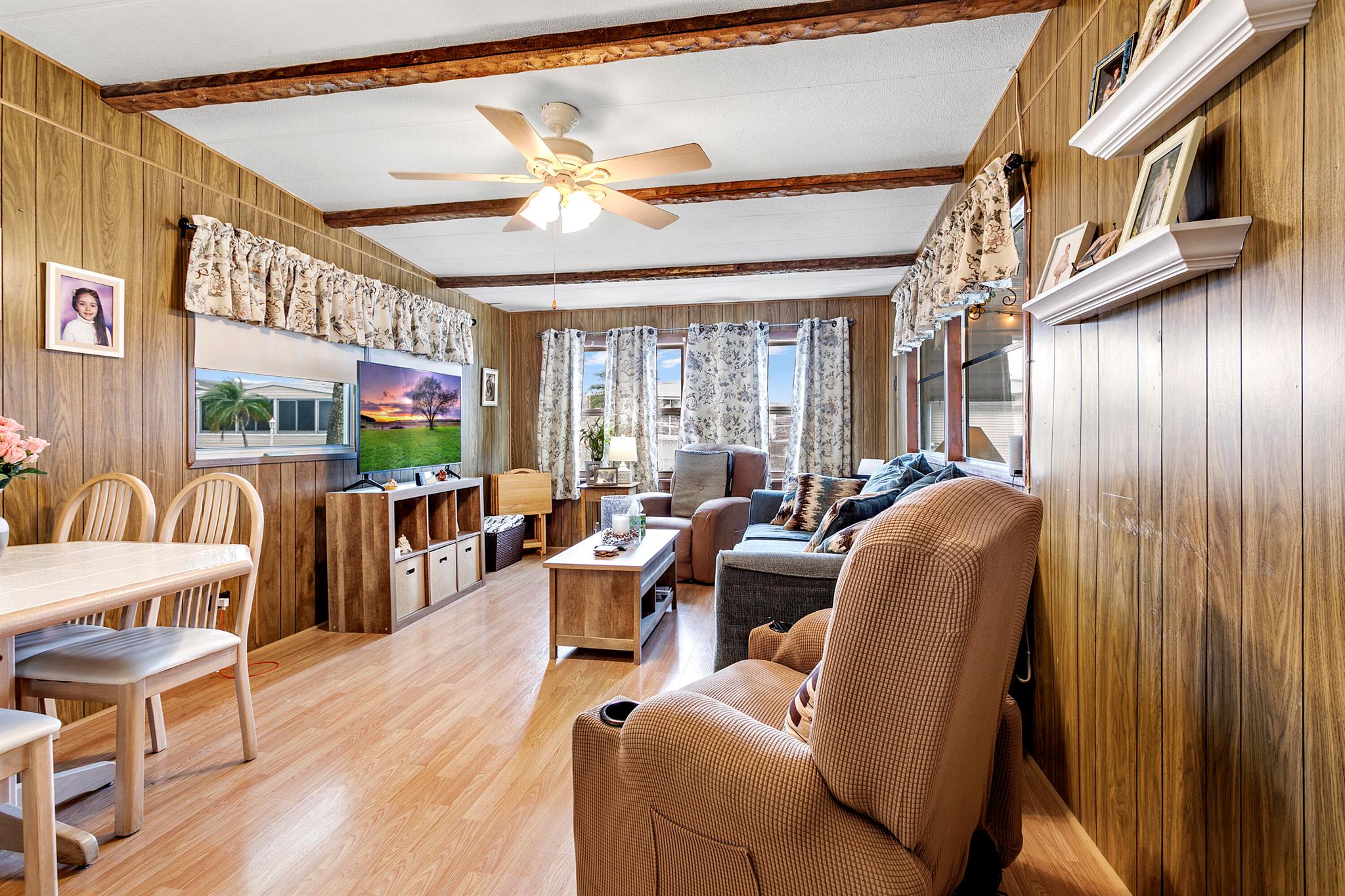 Cute 2 Bedroom 1 Bathroom Home in desirable 55+ Community. Manned Gated Community with plenty of activities. Enjoy Shuffleboard, Heated Pools, Bingo, Cards, Dances, Pot Luck Dinners, Game Nights and so much more. This home has laminate Flooring throughout, Vaulted Ceiling in the Living Room with Decorative Beams, Newer Windows, Kitchen with breakfast bar. Enjoy your spacious Florida Room for additional living space. 2nd bedroom perfect for guest room or office. Main Bedroom has entrance to Bathroom. Bathroom has Step Shower. Ramp has been installed for side entrance. Also a Shed for even more storage. This is a great Snowbird getaway or a home for someone looking to downsize and start traveling. Easy to Maintain and great location within the park. Community is located close