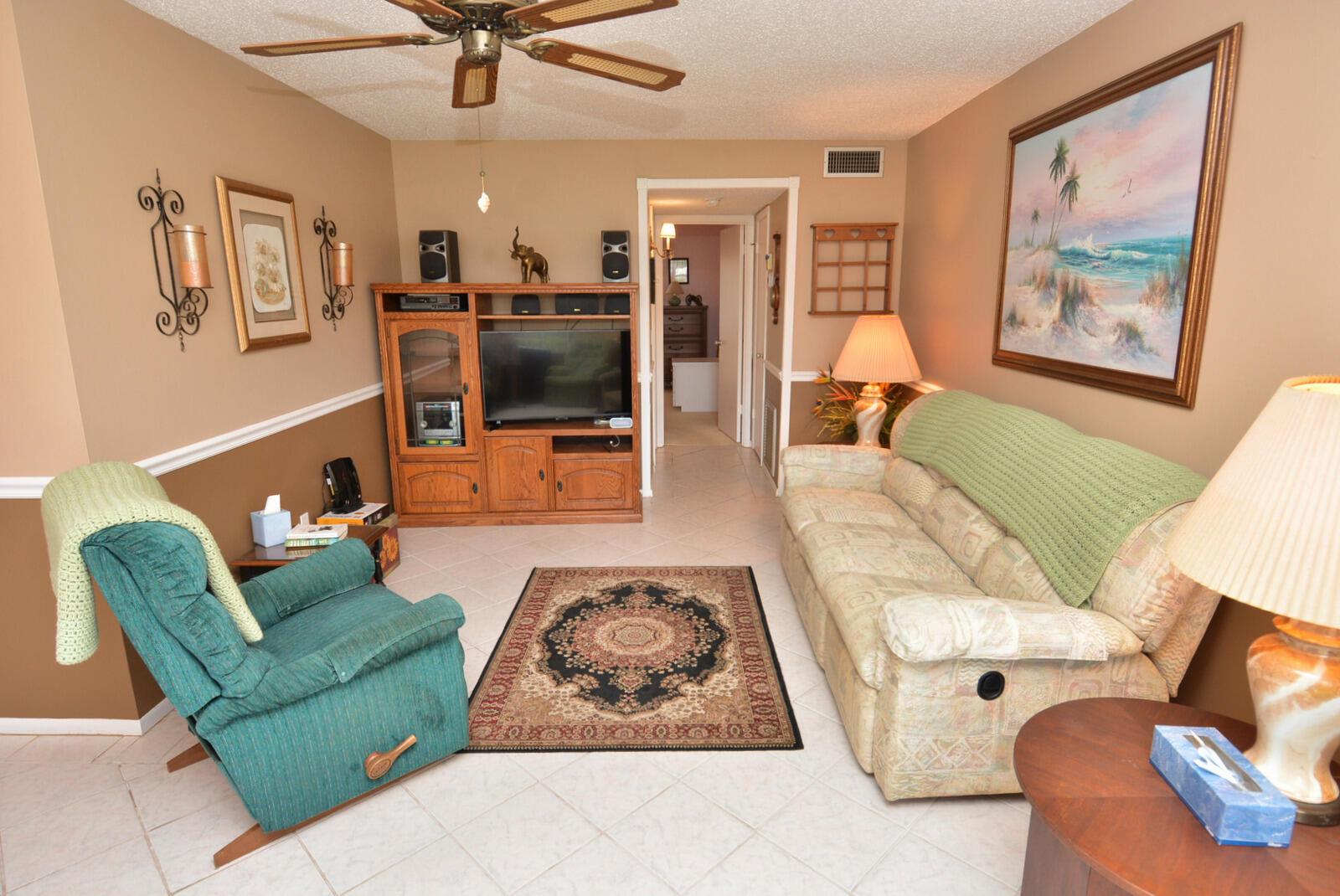 This first floor one bedroom, corner location with one and a half baths is waiting for you to make it your own! The oversized bedroom features a full wall of closets and private full ensuite. Then step out to your Florida room with floor-to-ceiling windows for relaxing and enjoying the beautiful view of the lake and fountain and has a walk-in closet for extra storage. Updated features include flooring throughout, both bathrooms have updates, fully updated kitchen and appliances, A/C and HWH too. This is an Active 55+ community in the Stuart/Jensen Beach area. Adjacent to North River Shores public golf course. Convenient location close to Treasure Coast Mall, restaurants, entertainment, etc. This is a beautiful, well-maintained community with lush landscape, walking paths, lakes, pool,