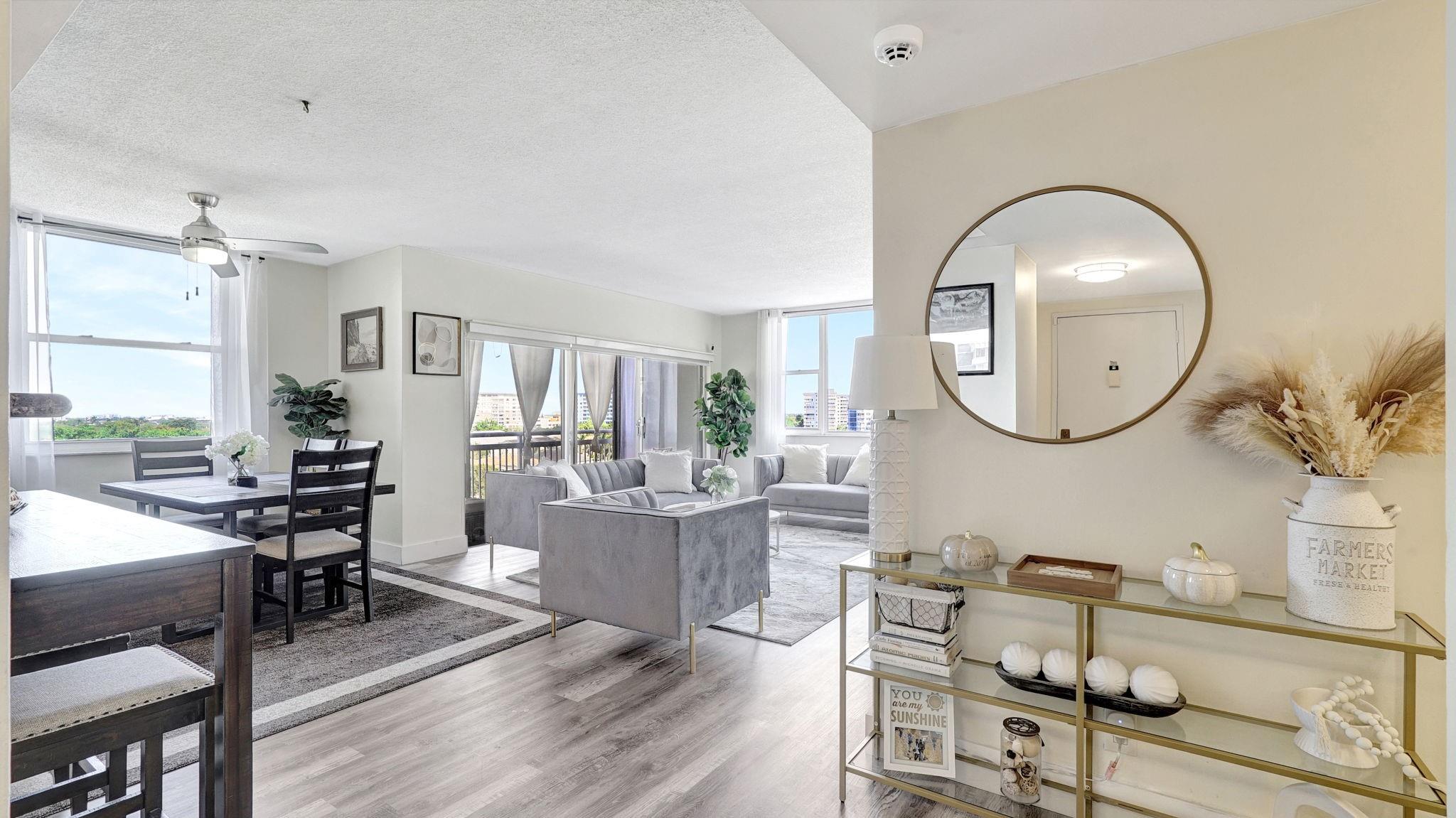 ALL AGES BUILDING! ALL ASSESSMENTS PAID! This spacious corner unit offers an incredible layout, designed for modern living. Bathed in natural sunlight, the home feat. oversized windows that provide a bright & airy atmosphere throughout. Step into the main living area, where a seamless flow leads to the enclosed patio, offering tranquil views of lush green landscapes. The upgraded vinyl flooring throughout provides a sleek, low-maintenance touch, adding both style & durability. Enjoy privacy & convenience with electric, remote-controlled blinds in both bedrooms, making it easy to adjust light levels to suit your mood. Maintenance fee includes: water, cable, pest control, & access to the storage & bike room, making this condo not just a beautiful home, but a worry-free lifestyle.